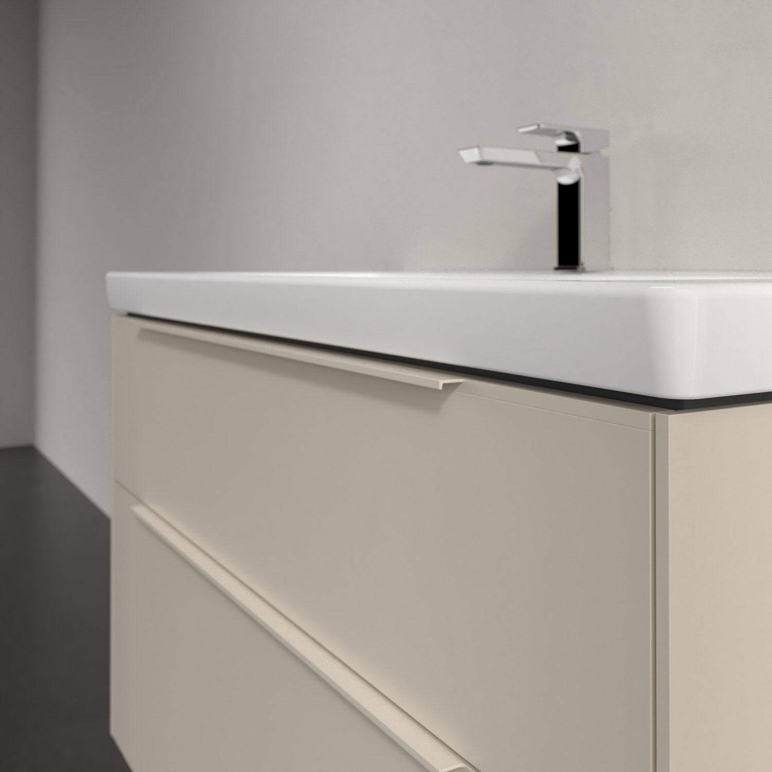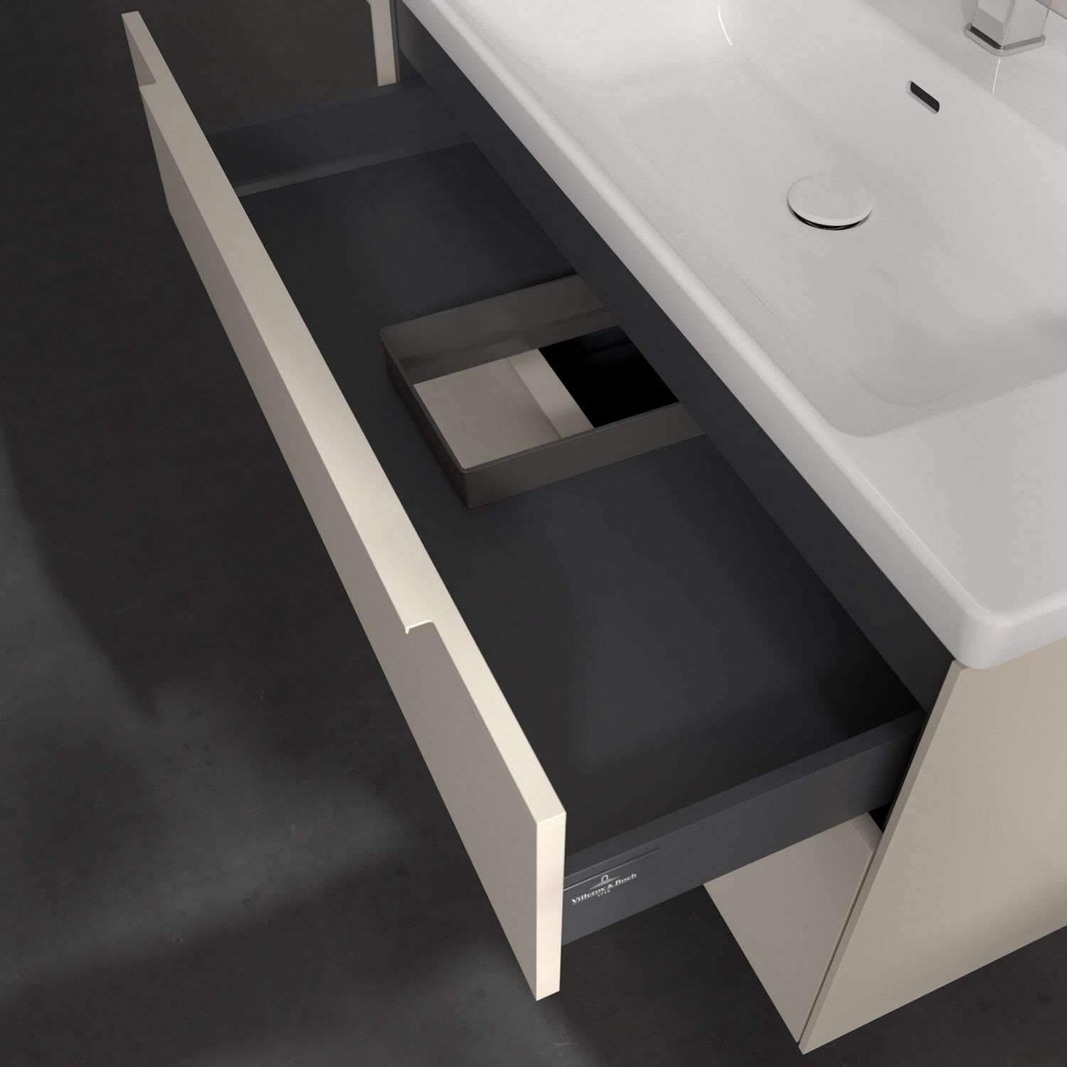 Der Waschtischunterschrank der Kollektion Subway 3.0 von Villeroy & Boch besticht durch gradliniges, zeitloses Design und großzügigen Stauraum. Front und Korpus sind mit einer hochwertigen Direktbeschichtung oder Lackierung, deren Anti-Fingerprint-Oberfläche unschönen Fingerabdrücken vorbeugt, versehen. Zwei voll ausziehbare Schubladen mit rutschhemmenden Böden, Selbsteinzug-Funktion sowie zwei integrierten kleinen Accessory-Boxen bieten extra viel Platz für Pflege- und Hygieneartikel. Die dezente Griffleiste sorgt für einfache Handhabung und bildet einen besonderen Design-Akzent.