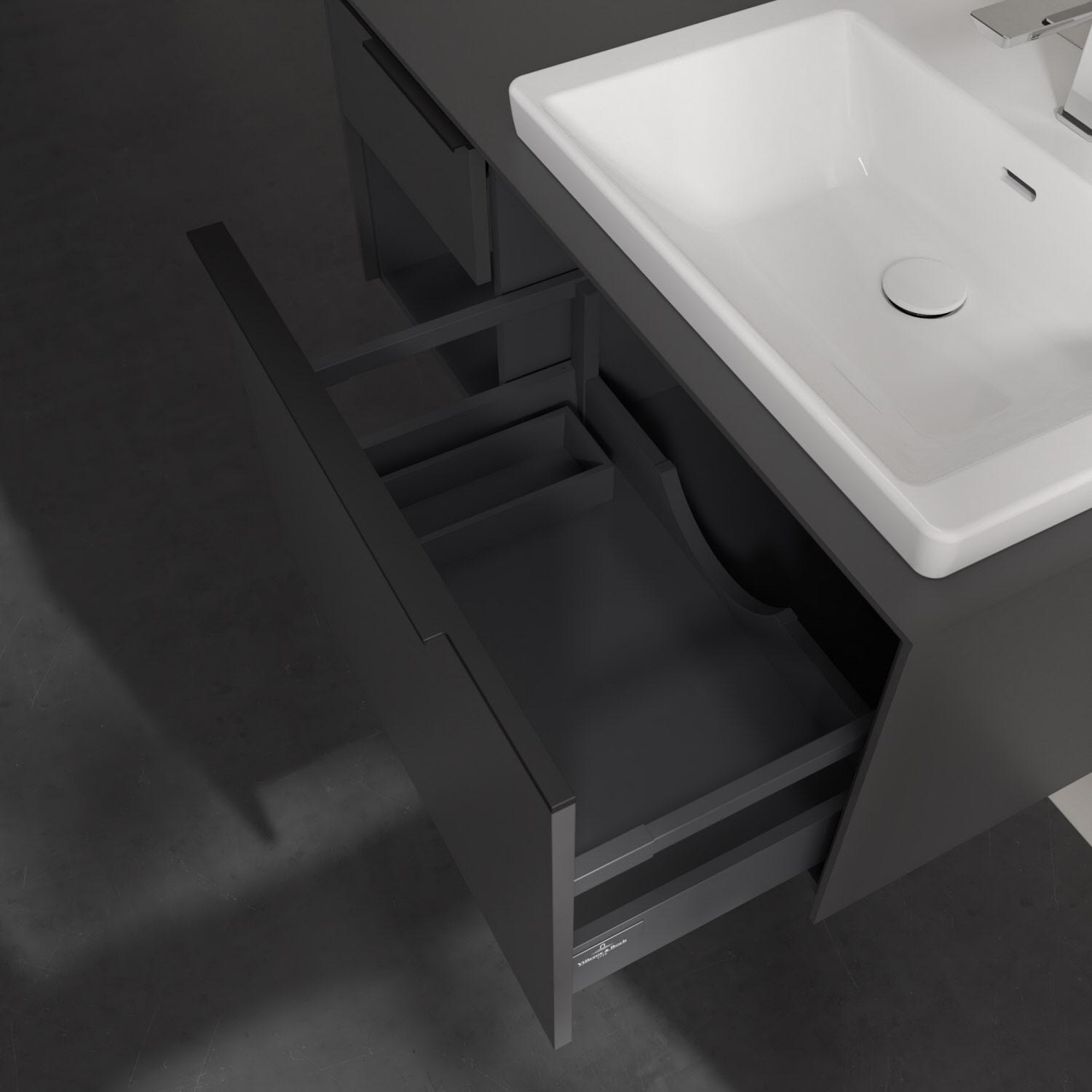 Der Waschtischunterschrank der Kollektion Subway 3.0 von Villeroy & Boch besticht durch gradliniges, zeitloses Design und großzügigen Stauraum. Front und Korpus sind mit einer hochwertigen Direktbeschichtung oder Lackierung, deren Anti-Fingerprint-Oberfläche unschönen Fingerabdrücken vorbeugt, versehen. Zwei voll ausziehbare Schubladen mit rutschhemmenden Böden, Selbsteinzug-Funktion sowie zwei integrierten kleinen Accessory-Boxen bieten extra viel Platz für Pflege- und Hygieneartikel. Linkerhand schafft ein Regalelement zusätzlichen Stauraum und sorgt dafür, dass wichtige Utensilien wie Handtücher sofort griffbereit sind. Die dezente Griffleiste sorgt für einfache Handhabung und bildet einen besonderen Design-Akzent.