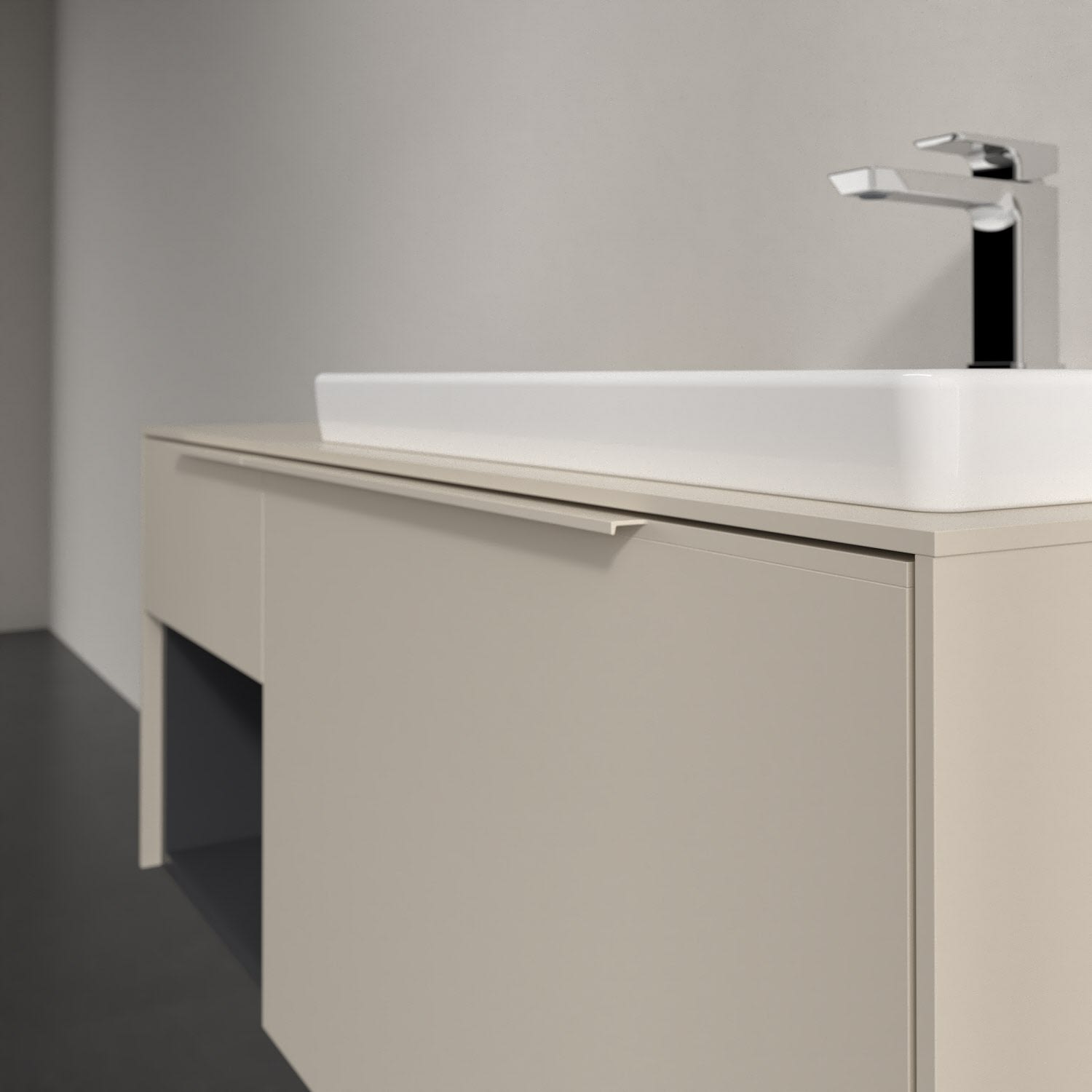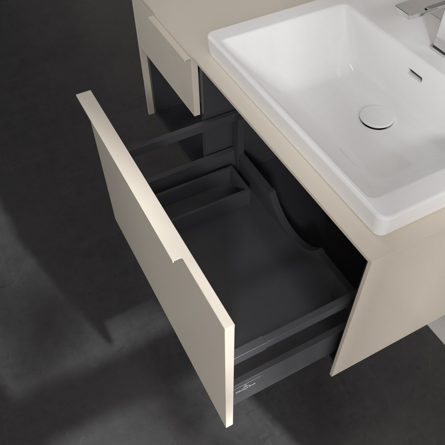 Der Waschtischunterschrank der Kollektion Subway 3.0 von Villeroy & Boch besticht durch gradliniges, zeitloses Design und großzügigen Stauraum. Front und Korpus sind mit einer hochwertigen Direktbeschichtung oder Lackierung, deren Anti-Fingerprint-Oberfläche unschönen Fingerabdrücken vorbeugt, versehen. Zwei voll ausziehbare Schubladen mit rutschhemmenden Böden, Selbsteinzug-Funktion sowie zwei integrierten kleinen Accessory-Boxen bieten extra viel Platz für Pflege- und Hygieneartikel. Linkerhand schafft ein Regalelement zusätzlichen Stauraum und sorgt dafür, dass wichtige Utensilien wie Handtücher sofort griffbereit sind. Die dezente Griffleiste sorgt für einfache Handhabung und bildet einen besonderen Design-Akzent.