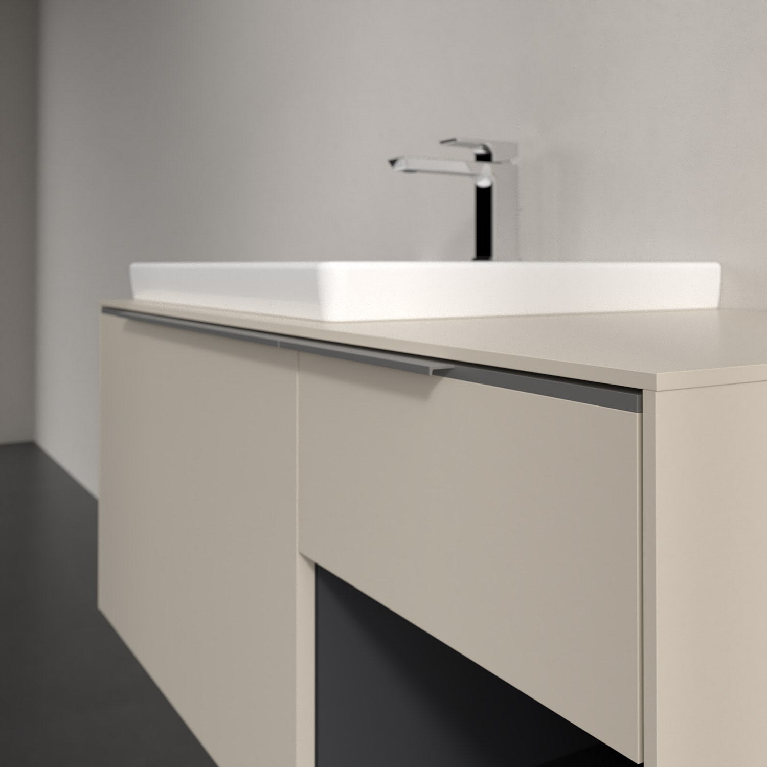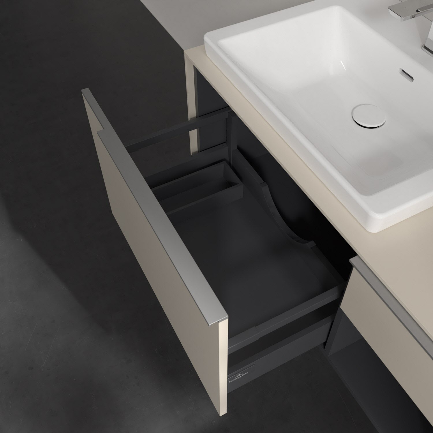 Der Waschtischunterschrank der Kollektion Subway 3.0 von Villeroy & Boch besticht durch gradliniges, zeitloses Design und großzügigen Stauraum. Front und Korpus sind mit einer hochwertigen Direktbeschichtung oder Lackierung, deren Anti-Fingerprint-Oberfläche unschönen Fingerabdrücken vorbeugt, versehen. Zwei voll ausziehbare Schubladen mit rutschhemmenden Böden, Selbsteinzug-Funktion sowie zwei integrierten kleinen Accessory-Boxen bieten extra viel Platz für Pflege- und Hygieneartikel. Rechterhand schafft ein Regalelement zusätzlichen Stauraum und sorgt dafür, dass wichtige Utensilien wie Handtücher sofort griffbereit sind. Die dezente Griffleiste sorgt für einfache Handhabung und bildet einen besonderen Design-Akzent.