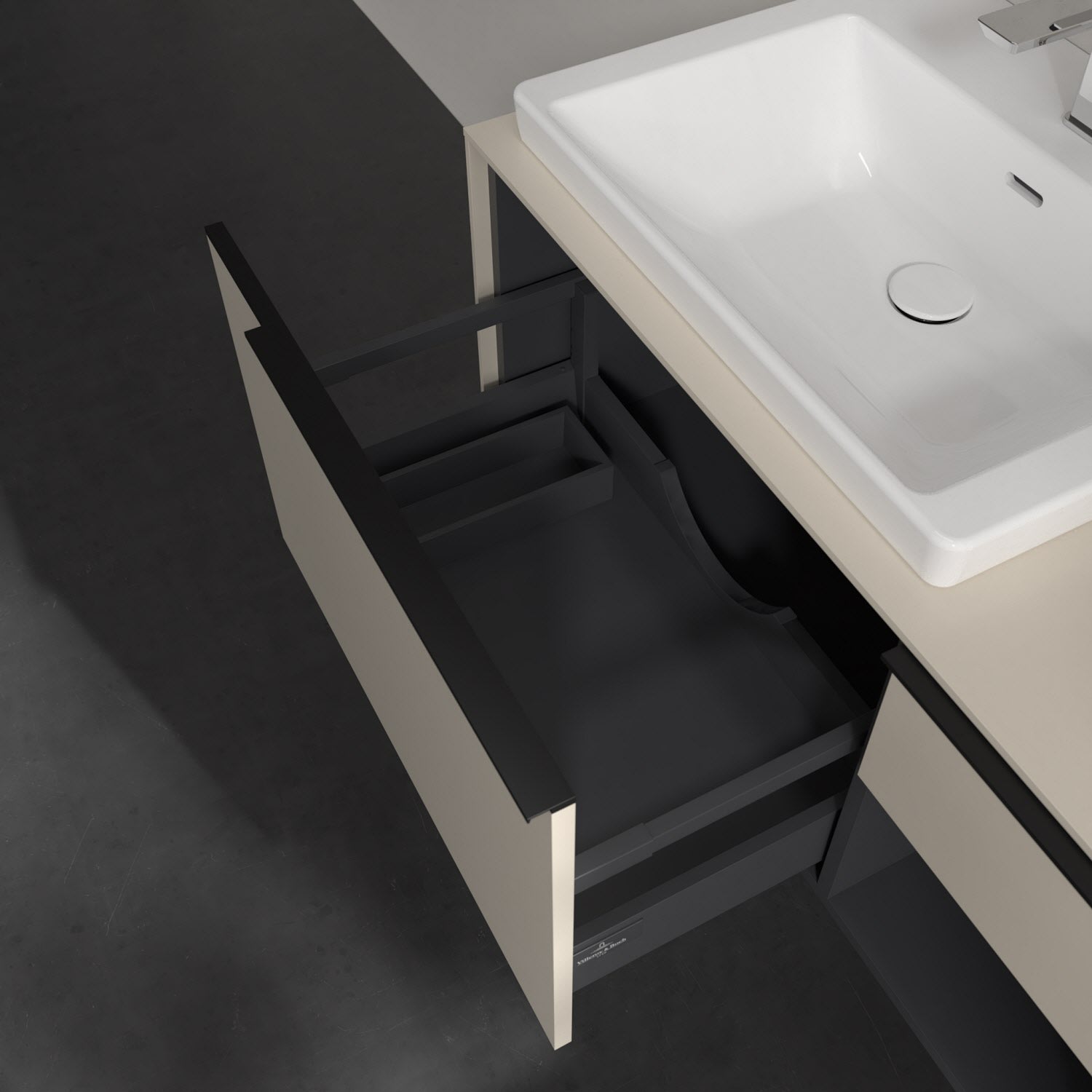 Der Waschtischunterschrank der Kollektion Subway 3.0 von Villeroy & Boch besticht durch gradliniges, zeitloses Design und großzügigen Stauraum. Front und Korpus sind mit einer hochwertigen Direktbeschichtung oder Lackierung, deren Anti-Fingerprint-Oberfläche unschönen Fingerabdrücken vorbeugt, versehen. Zwei voll ausziehbare Schubladen mit rutschhemmenden Böden, Selbsteinzug-Funktion sowie zwei integrierten kleinen Accessory-Boxen bieten extra viel Platz für Pflege- und Hygieneartikel. Rechterhand schafft ein Regalelement zusätzlichen Stauraum und sorgt dafür, dass wichtige Utensilien wie Handtücher sofort griffbereit sind. Die dezente Griffleiste sorgt für einfache Handhabung und bildet einen besonderen Design-Akzent.