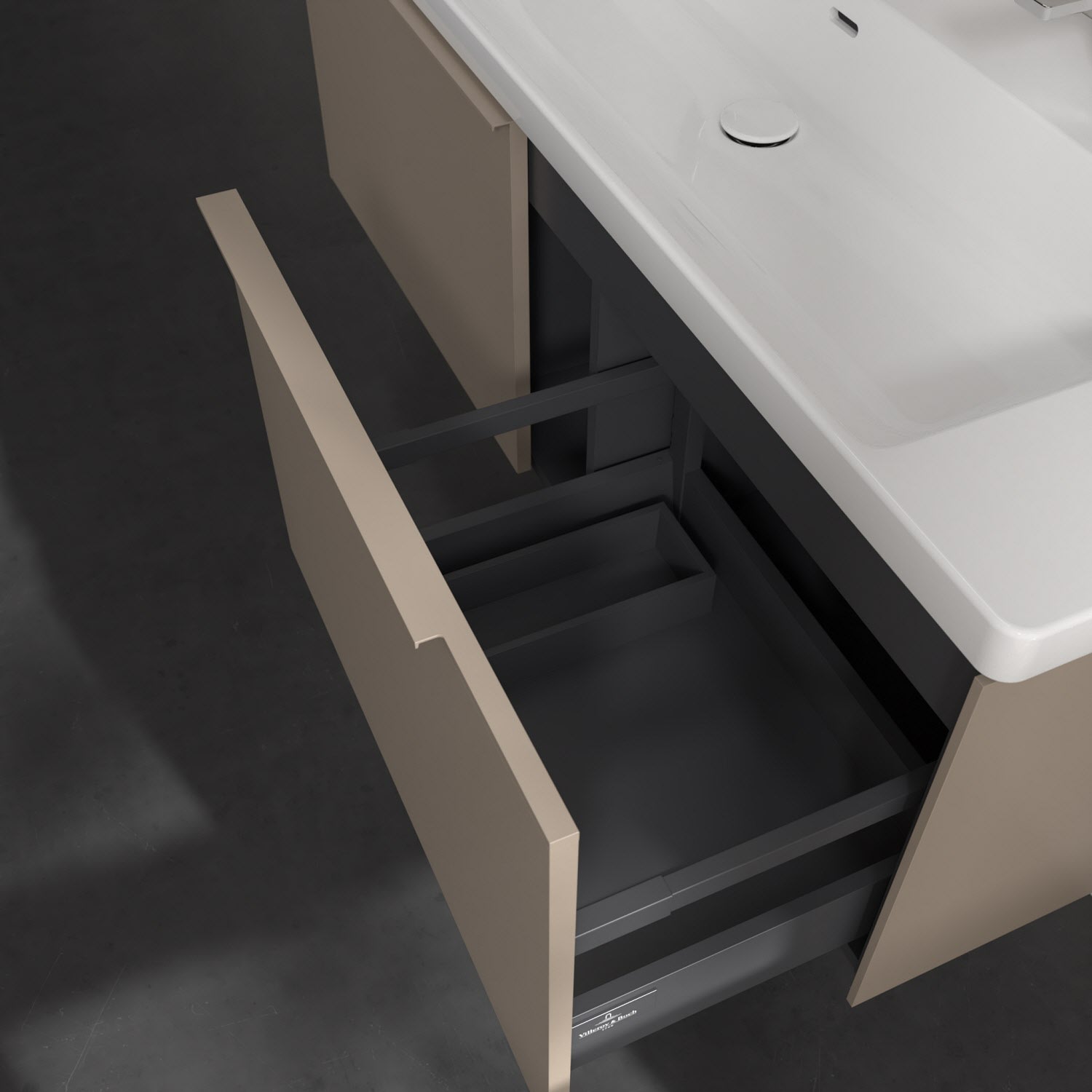 Der Waschtischunterschrank der Kollektion Subway 3.0 von Villeroy & Boch besticht durch gradliniges, zeitloses Design und großzügigen Stauraum. Front und Korpus sind mit einer hochwertigen Direktbeschichtung oder Lackierung, deren Anti-Fingerprint-Oberfläche unschönen Fingerabdrücken vorbeugt, versehen. Zwei voll ausziehbare Schubladen mit rutschhemmenden Böden, Selbsteinzug-Funktion sowie zwei integrierten kleinen Accessory-Boxen bieten extra viel Platz für Pflege- und Hygieneartikel. Die dezente Griffleiste sorgt für einfache Handhabung und bildet einen besonderen Design-Akzent.