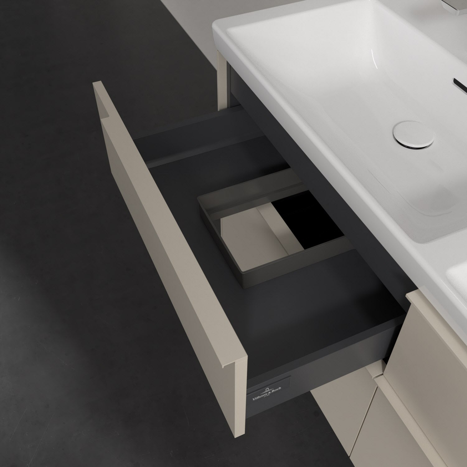Der Waschtischunterschrank der Kollektion Subway 3.0 von Villeroy & Boch besticht durch gradliniges, zeitloses Design und großzügigen Stauraum. Front und Korpus sind mit einer hochwertigen Direktbeschichtung oder Lackierung, deren Anti-Fingerprint-Oberfläche unschönen Fingerabdrücken vorbeugt, versehen. Vier voll ausziehbare Schubladen mit rutschhemmenden Böden, Selbsteinzug-Funktion sowie zwei integrierten kleinen Accessory-Boxen bieten extra viel Platz für Pflege- und Hygieneartikel. Die dezente Griffleiste sorgt für einfache Handhabung und bildet einen besonderen Design-Akzent.