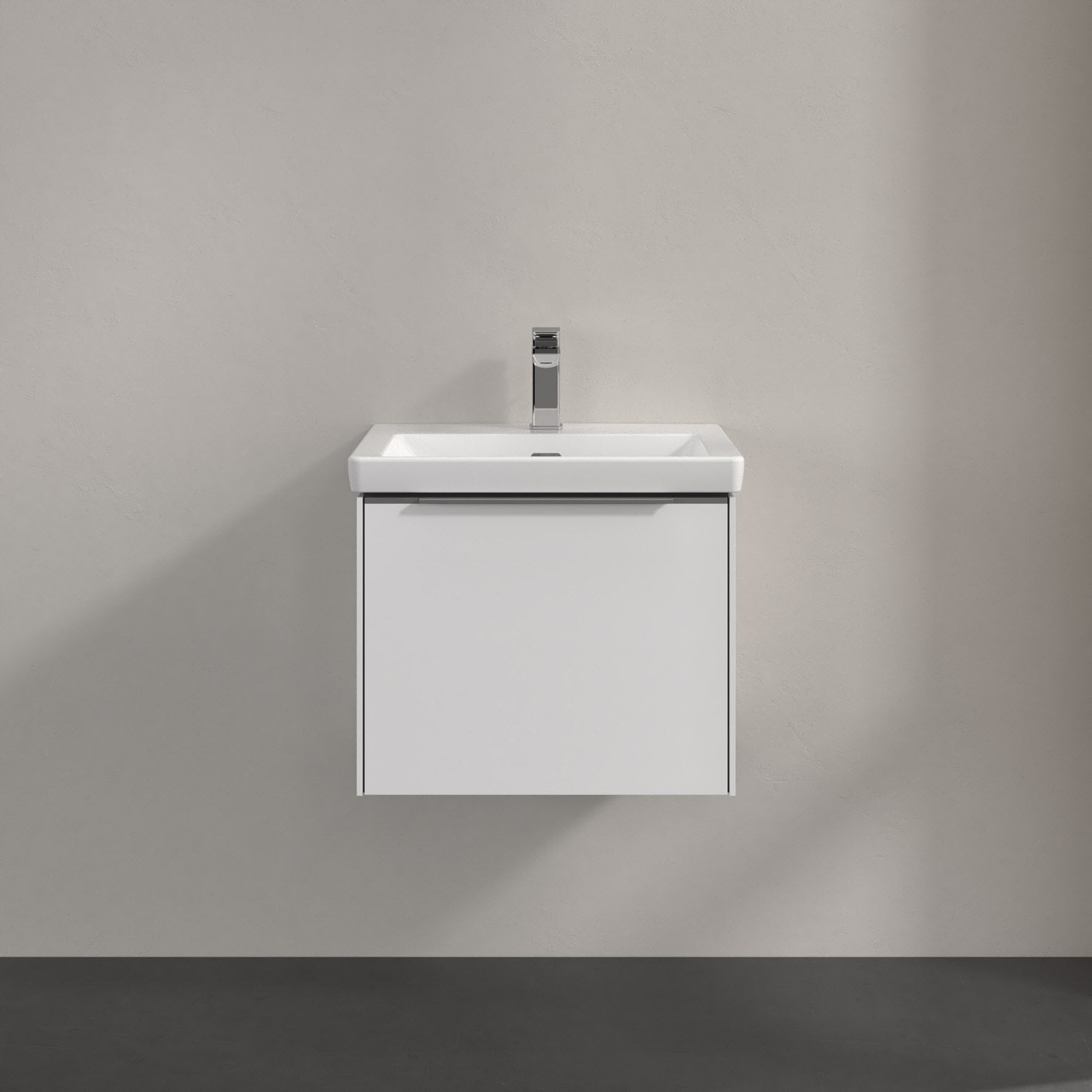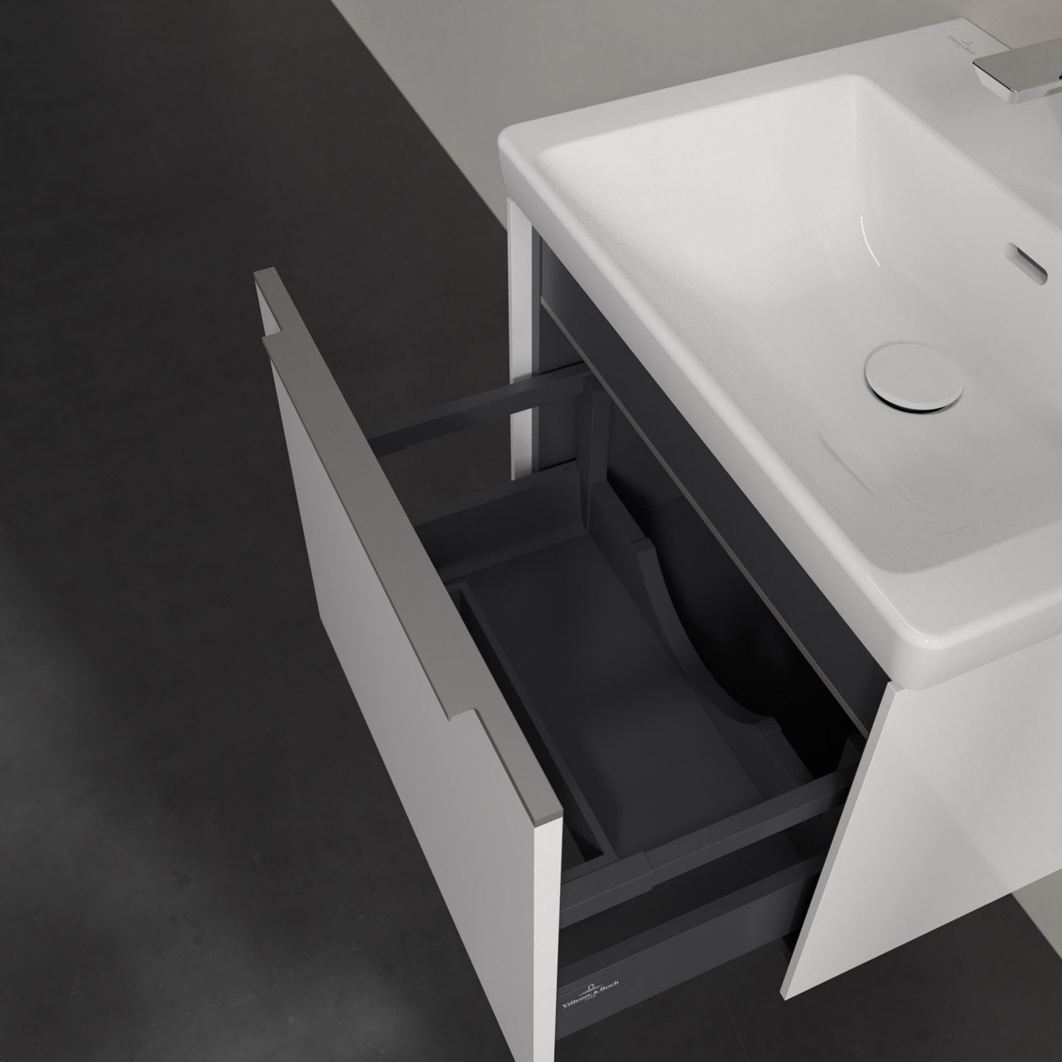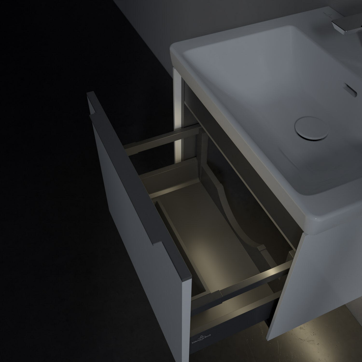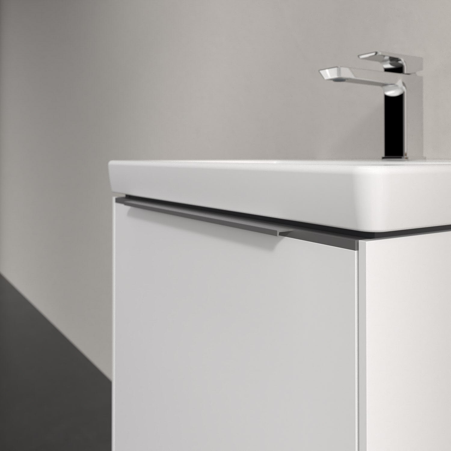 Der Waschtischunterschrank der Kollektion Subway 3.0 von Villeroy & Boch besticht durch gradliniges, zeitloses Design und großzügigen Stauraum. Front und Korpus sind mit einer hochwertigen Direktbeschichtung oder Lackierung, deren Anti-Fingerprint-Oberfläche unschönen Fingerabdrücken vorbeugt, versehen. Für eine einfache Handhabung sorgt eine dezente Griffleiste. Eine voll ausziehbare Schublade mit rutschhemmendem Boden, Selbsteinzug-Funktion und zwei integrierten kleinen Accessory-Boxen bietet Platz für Pflege- und Hygieneartikel. Integriert ist eine funktionale LED-Leiste, die mit neutralweißem Licht das Innenleben beleuchtet. Highlight ist die LED-Bodenbeleuchtung, die stimmungsvolles, sanftes Licht ins Bad bringt und nachts als Orientierungshilfe dient. Helligkeit und Lichtfarbe können über den kapazitiven Sensor eingestellt werden. Die LED-Leuchten lassen sich durch einen Fachhandwerker austauschen.