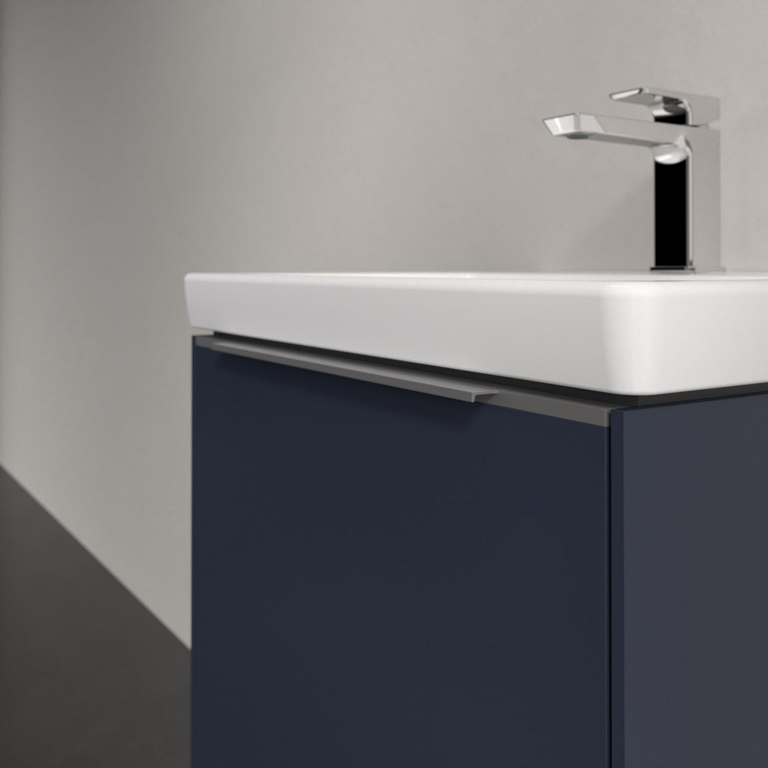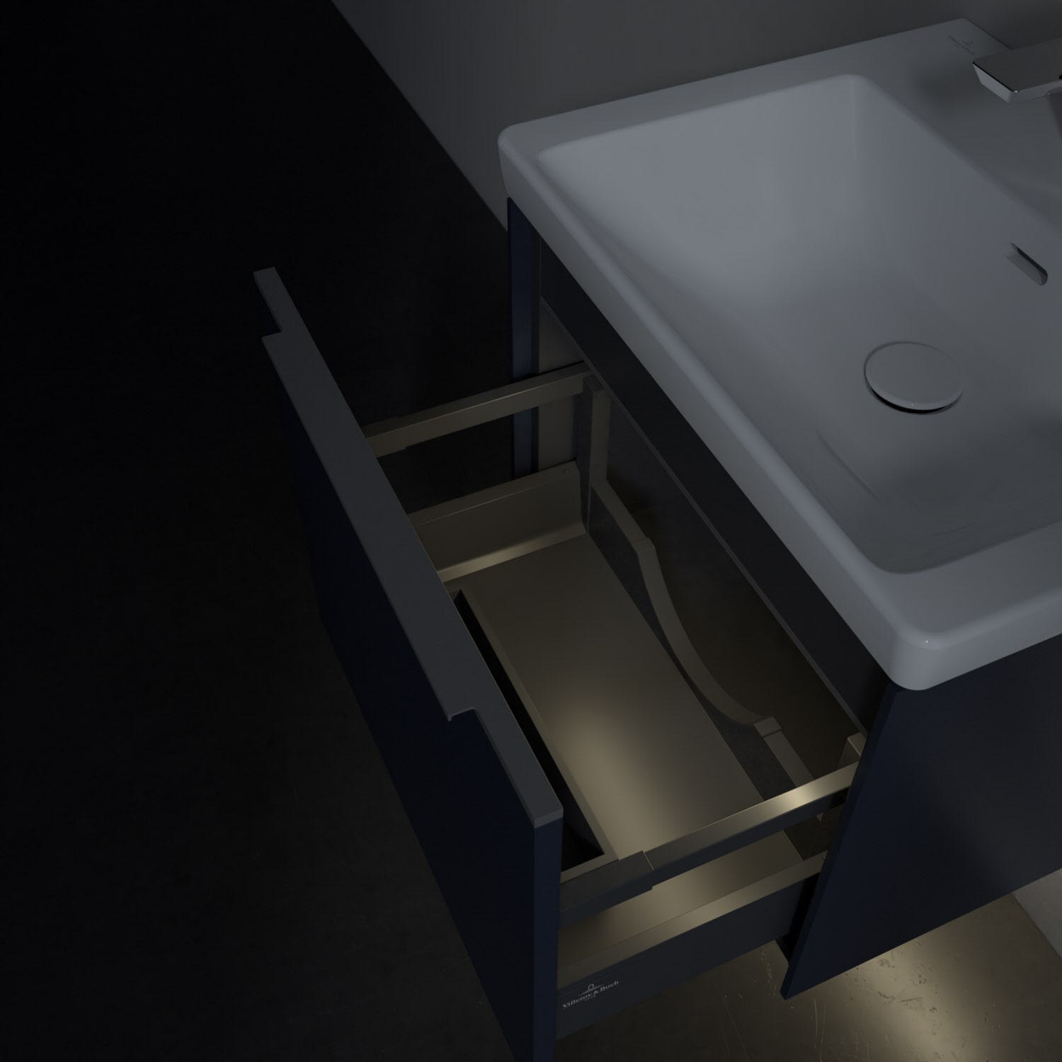 Der Waschtischunterschrank der Kollektion Subway 3.0 von Villeroy & Boch besticht durch gradliniges, zeitloses Design und großzügigen Stauraum. Front und Korpus sind mit einer hochwertigen Direktbeschichtung oder Lackierung, deren Anti-Fingerprint-Oberfläche unschönen Fingerabdrücken vorbeugt, versehen. Für eine einfache Handhabung sorgt eine dezente Griffleiste. Eine voll ausziehbare Schublade mit rutschhemmendem Boden, Selbsteinzug-Funktion und zwei integrierten kleinen Accessory-Boxen bietet Platz für Pflege- und Hygieneartikel. Integriert ist eine funktionale LED-Leiste, die mit neutralweißem Licht das Innenleben beleuchtet. Highlight ist die LED-Bodenbeleuchtung, die stimmungsvolles, sanftes Licht ins Bad bringt und nachts als Orientierungshilfe dient. Helligkeit und Lichtfarbe können über den kapazitiven Sensor eingestellt werden. Die LED-Leuchten lassen sich durch einen Fachhandwerker austauschen.