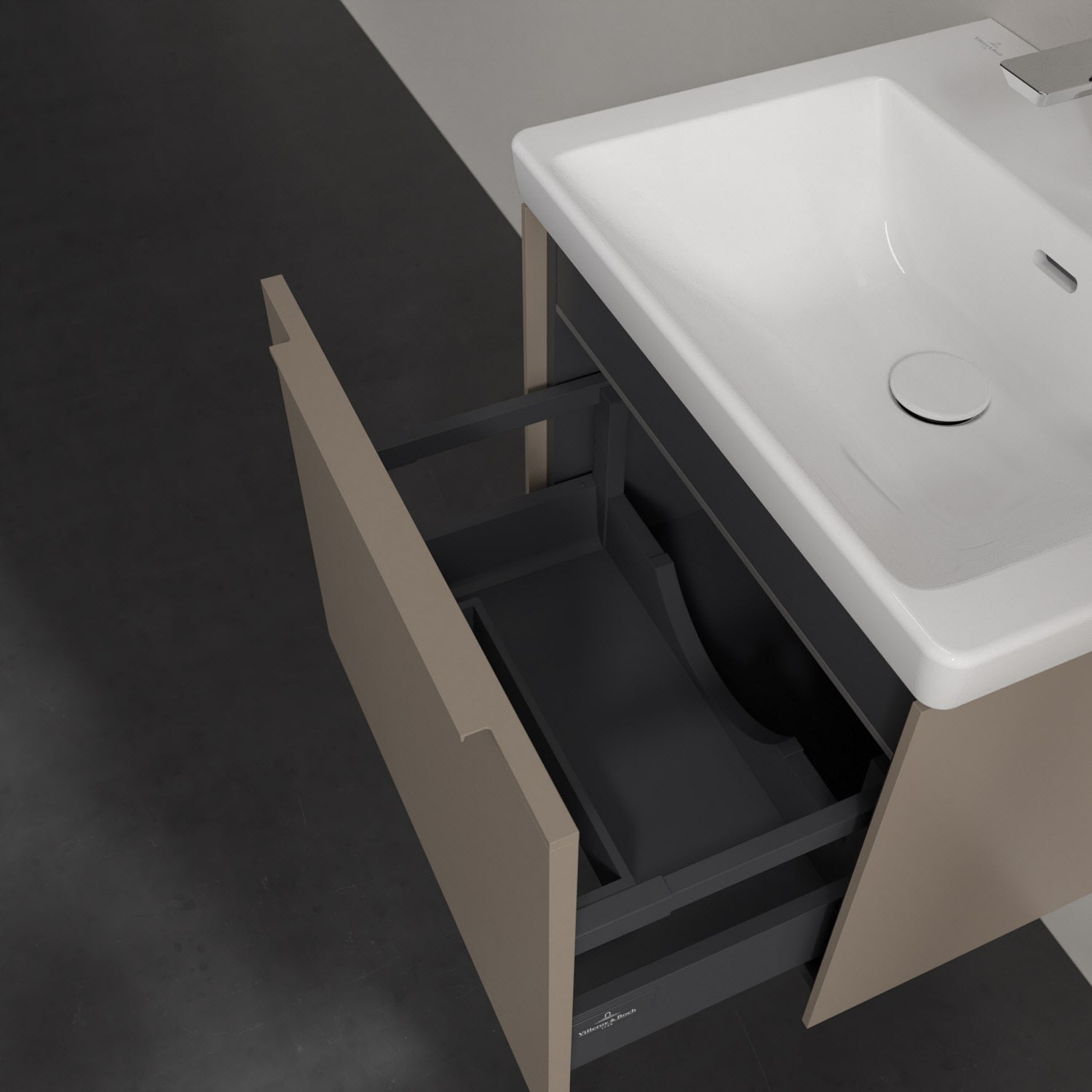 Der Waschtischunterschrank der Kollektion Subway 3.0 von Villeroy & Boch besticht durch gradliniges, zeitloses Design und großzügigen Stauraum. Front und Korpus sind mit einer hochwertigen Direktbeschichtung oder Lackierung, deren Anti-Fingerprint-Oberfläche unschönen Fingerabdrücken vorbeugt, versehen. Für eine einfache Handhabung sorgt eine dezente Griffleiste. Eine voll ausziehbare Schublade mit rutschhemmendem Boden, Selbsteinzug-Funktion und zwei integrierten kleinen Accessory-Boxen bietet Platz für Pflege- und Hygieneartikel. Integriert ist eine funktionale LED-Leiste, die mit neutralweißem Licht das Innenleben beleuchtet. Highlight ist die LED-Bodenbeleuchtung, die stimmungsvolles, sanftes Licht ins Bad bringt und nachts als Orientierungshilfe dient. Helligkeit und Lichtfarbe können über den kapazitiven Sensor eingestellt werden. Die LED-Leuchten lassen sich durch einen Fachhandwerker austauschen.
