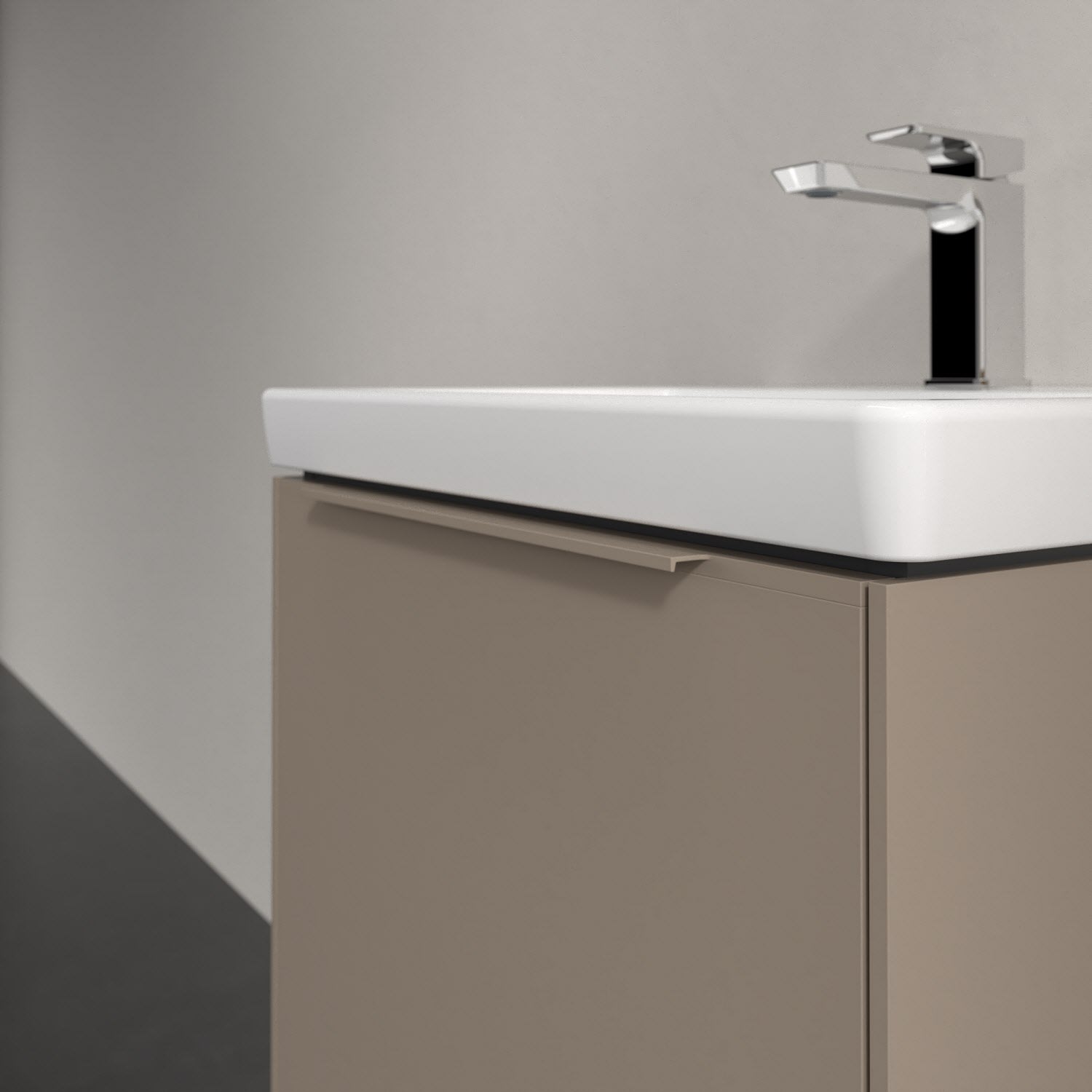 Der Waschtischunterschrank der Kollektion Subway 3.0 von Villeroy & Boch besticht durch gradliniges, zeitloses Design und großzügigen Stauraum. Front und Korpus sind mit einer hochwertigen Direktbeschichtung oder Lackierung, deren Anti-Fingerprint-Oberfläche unschönen Fingerabdrücken vorbeugt, versehen. Für eine einfache Handhabung sorgt eine dezente Griffleiste. Eine voll ausziehbare Schublade mit rutschhemmendem Boden, Selbsteinzug-Funktion und zwei integrierten kleinen Accessory-Boxen bietet Platz für Pflege- und Hygieneartikel. Integriert ist eine funktionale LED-Leiste, die mit neutralweißem Licht das Innenleben beleuchtet. Highlight ist die LED-Bodenbeleuchtung, die stimmungsvolles, sanftes Licht ins Bad bringt und nachts als Orientierungshilfe dient. Helligkeit und Lichtfarbe können über den kapazitiven Sensor eingestellt werden. Die LED-Leuchten lassen sich durch einen Fachhandwerker austauschen.