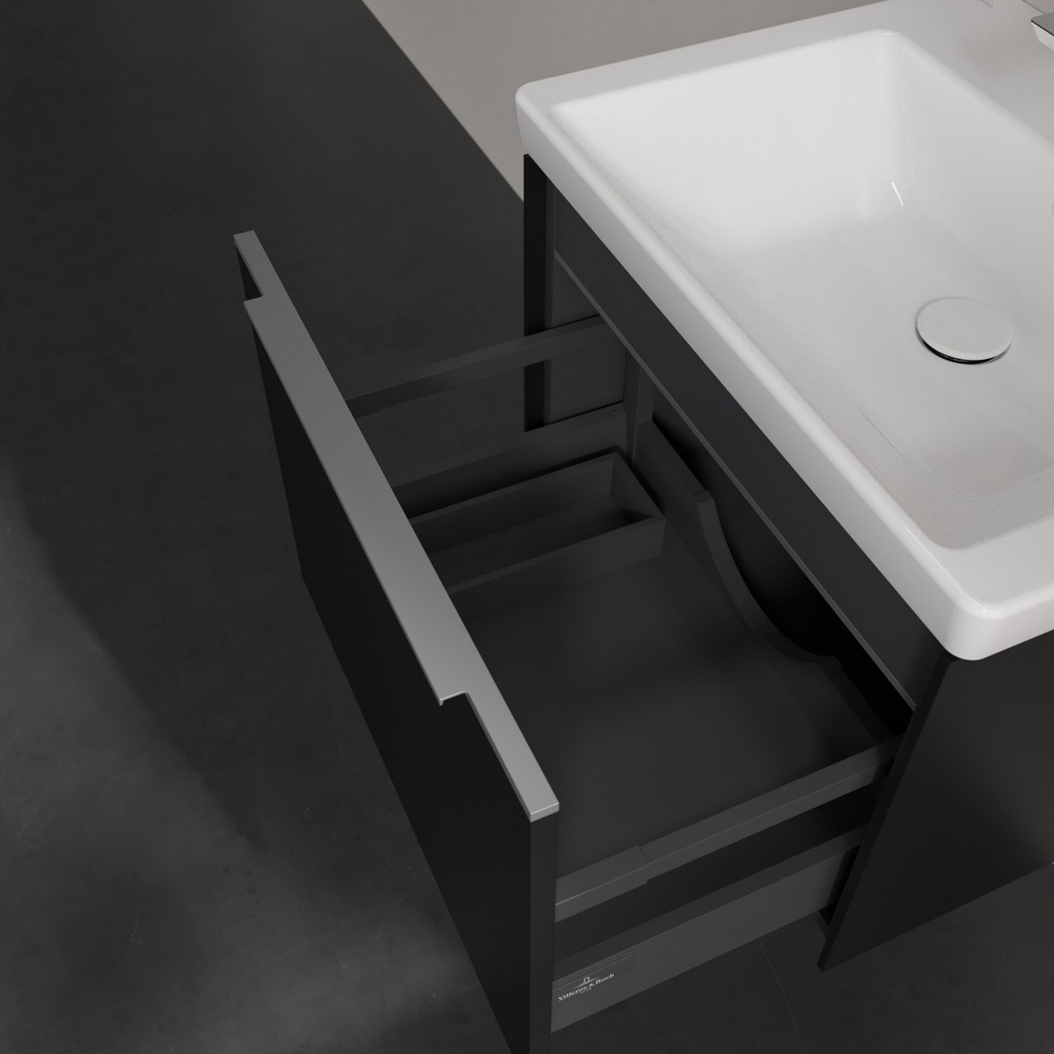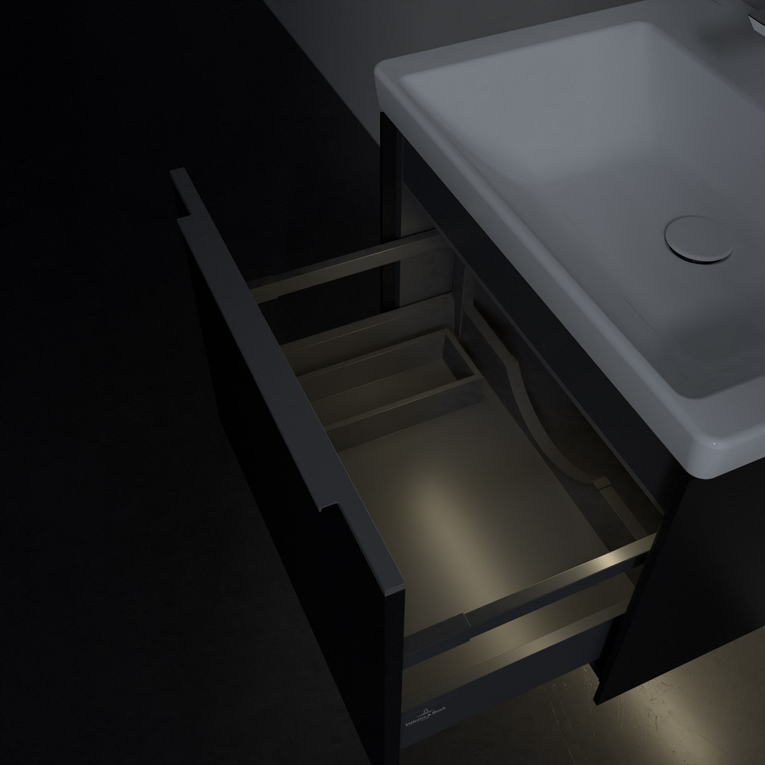 Der Waschtischunterschrank der Kollektion Subway 3.0 von Villeroy & Boch besticht durch gradliniges, zeitloses Design und großzügigen Stauraum. Front und Korpus sind mit einer hochwertigen Direktbeschichtung oder Lackierung, deren Anti-Fingerprint-Oberfläche unschönen Fingerabdrücken vorbeugt, versehen. Für eine einfache Handhabung sorgt eine dezente Griffleiste. Eine voll ausziehbare Schublade mit rutschhemmendem Boden, Selbsteinzug-Funktion und zwei integrierten kleinen Accessory-Boxen bietet Platz für Pflege- und Hygieneartikel. Integriert ist eine funktionale LED-Leiste, die mit neutralweißem Licht das Innenleben beleuchtet. Highlight ist die LED-Bodenbeleuchtung, die stimmungsvolles, sanftes Licht ins Bad bringt und nachts als Orientierungshilfe dient. Helligkeit und Lichtfarbe können über den kapazitiven Sensor eingestellt werden. Die LED-Leuchten lassen sich durch einen Fachhandwerker austauschen.