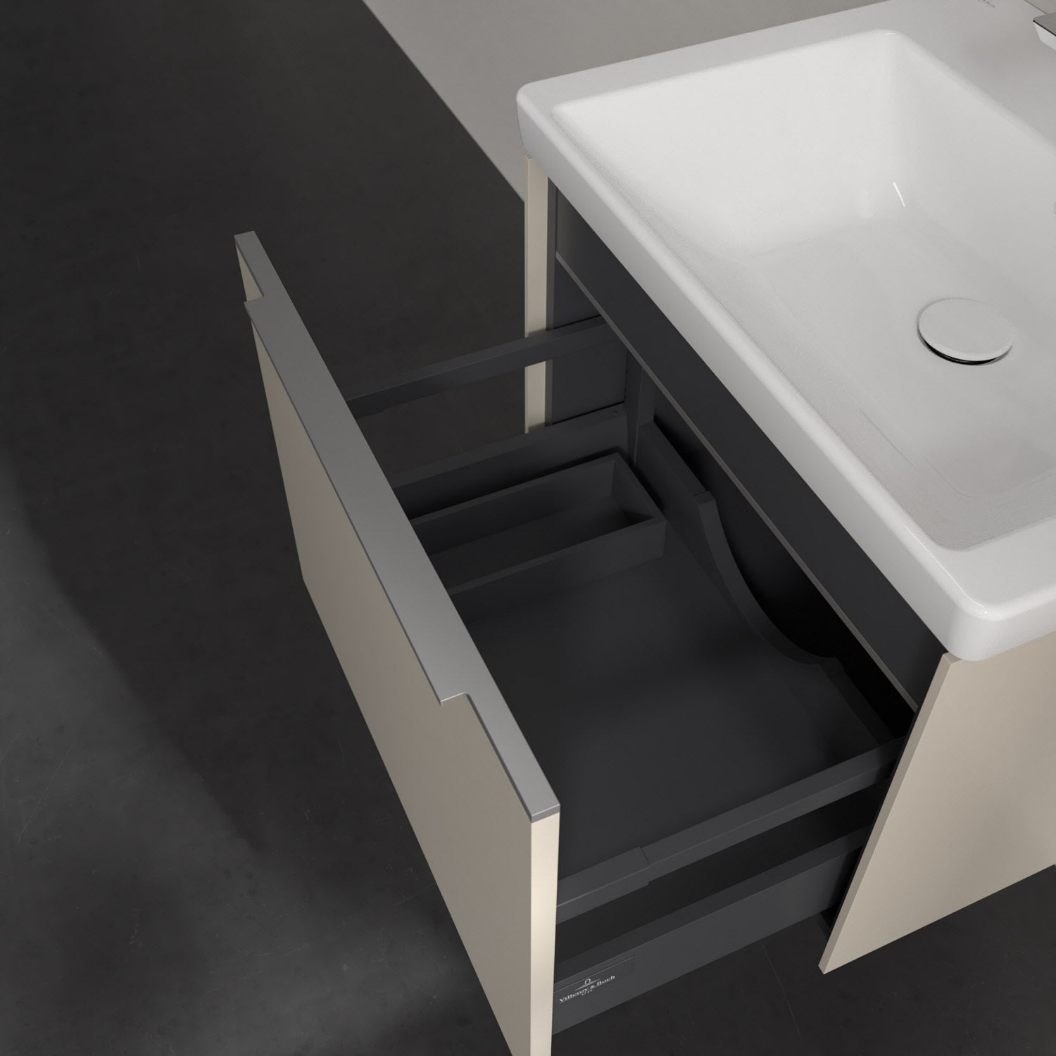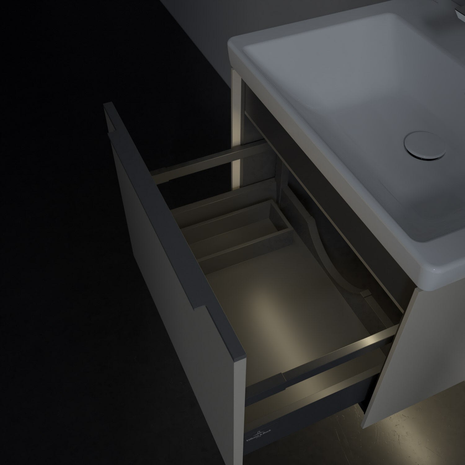 Der Waschtischunterschrank der Kollektion Subway 3.0 von Villeroy & Boch besticht durch gradliniges, zeitloses Design und großzügigen Stauraum. Front und Korpus sind mit einer hochwertigen Direktbeschichtung oder Lackierung, deren Anti-Fingerprint-Oberfläche unschönen Fingerabdrücken vorbeugt, versehen. Für eine einfache Handhabung sorgt eine dezente Griffleiste. Eine voll ausziehbare Schublade mit rutschhemmendem Boden, Selbsteinzug-Funktion und zwei integrierten kleinen Accessory-Boxen bietet Platz für Pflege- und Hygieneartikel. Integriert ist eine funktionale LED-Leiste, die mit neutralweißem Licht das Innenleben beleuchtet. Highlight ist die LED-Bodenbeleuchtung, die stimmungsvolles, sanftes Licht ins Bad bringt und nachts als Orientierungshilfe dient. Helligkeit und Lichtfarbe können über den kapazitiven Sensor eingestellt werden. Die LED-Leuchten lassen sich durch einen Fachhandwerker austauschen.