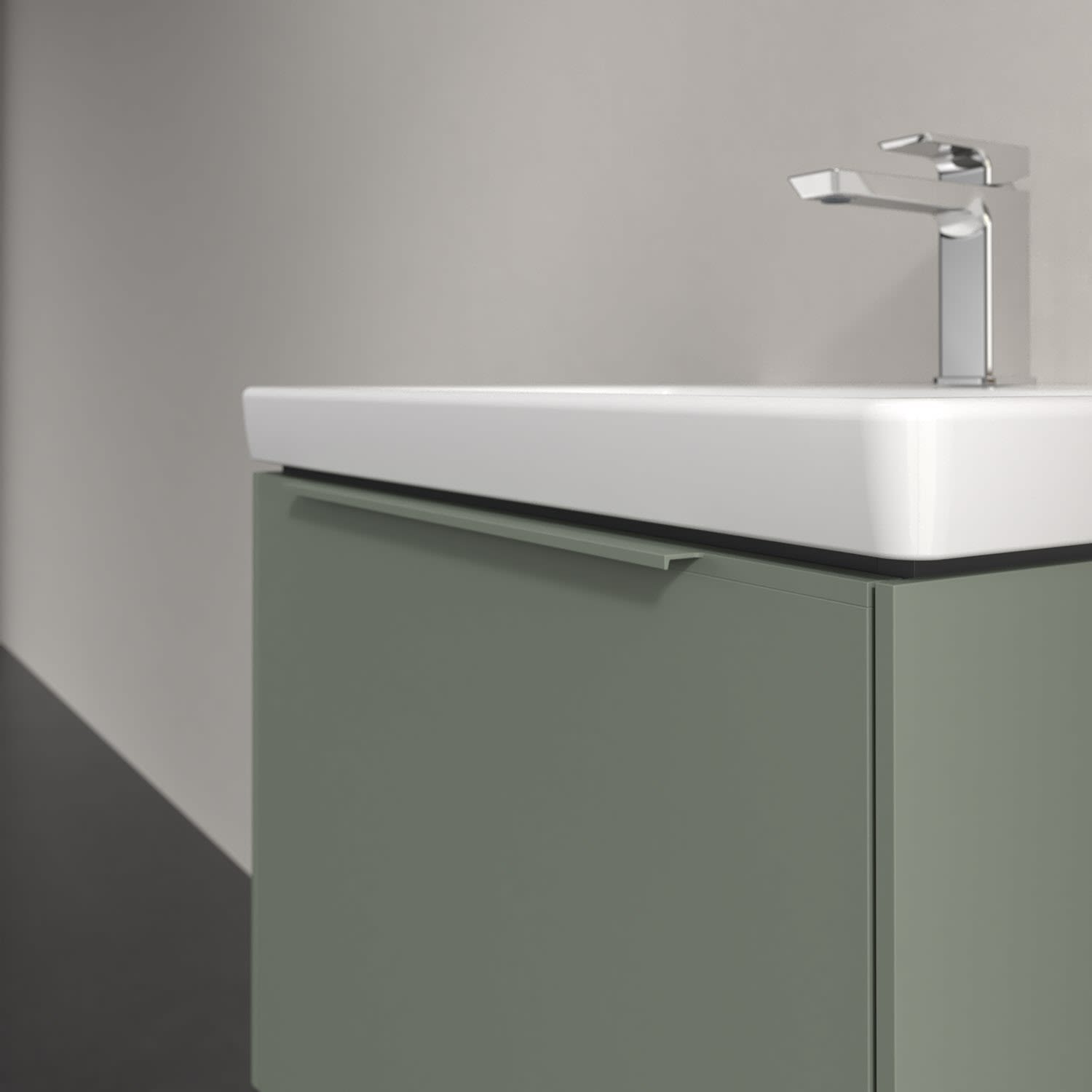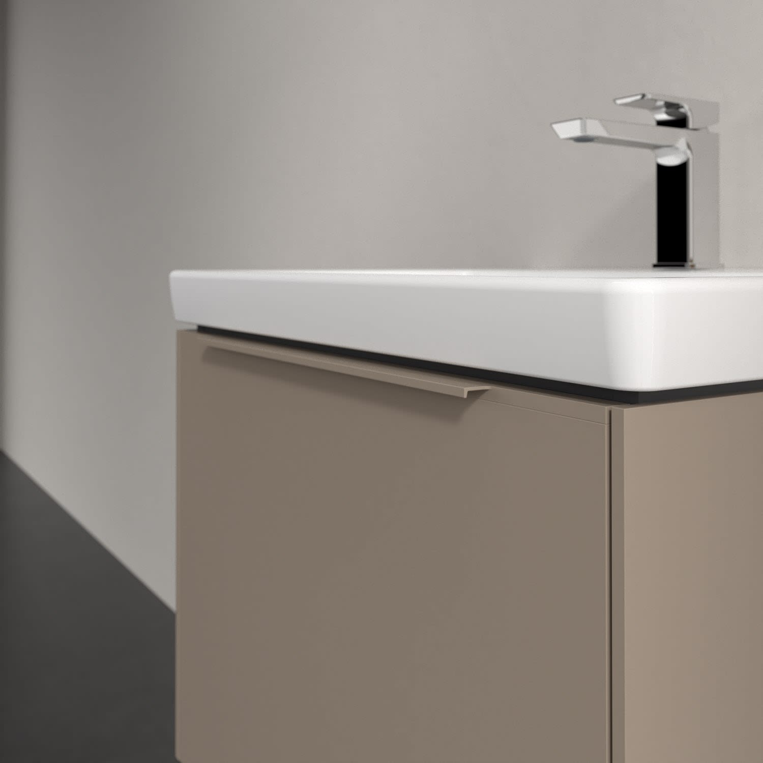 Der Waschtischunterschrank der Kollektion Subway 3.0 von Villeroy & Boch besticht durch gradliniges, zeitloses Design und großzügigen Stauraum. Front und Korpus sind mit einer hochwertigen Direktbeschichtung oder Lackierung, deren Anti-Fingerprint-Oberfläche unschönen Fingerabdrücken vorbeugt, versehen. Für eine einfache Handhabung sorgt eine dezente Griffleiste. Eine voll ausziehbare Schublade mit rutschhemmendem Boden, Selbsteinzug-Funktion und zwei integrierten kleinen Accessory-Boxen bietet Platz für Pflege- und Hygieneartikel. Integriert ist eine funktionale LED-Leiste, die mit neutralweißem Licht das Innenleben beleuchtet. Highlight ist die LED-Bodenbeleuchtung, die stimmungsvolles, sanftes Licht ins Bad bringt und nachts als Orientierungshilfe dient. Helligkeit und Lichtfarbe können über den kapazitiven Sensor eingestellt werden. Die LED-Leuchten lassen sich durch einen Fachhandwerker austauschen.