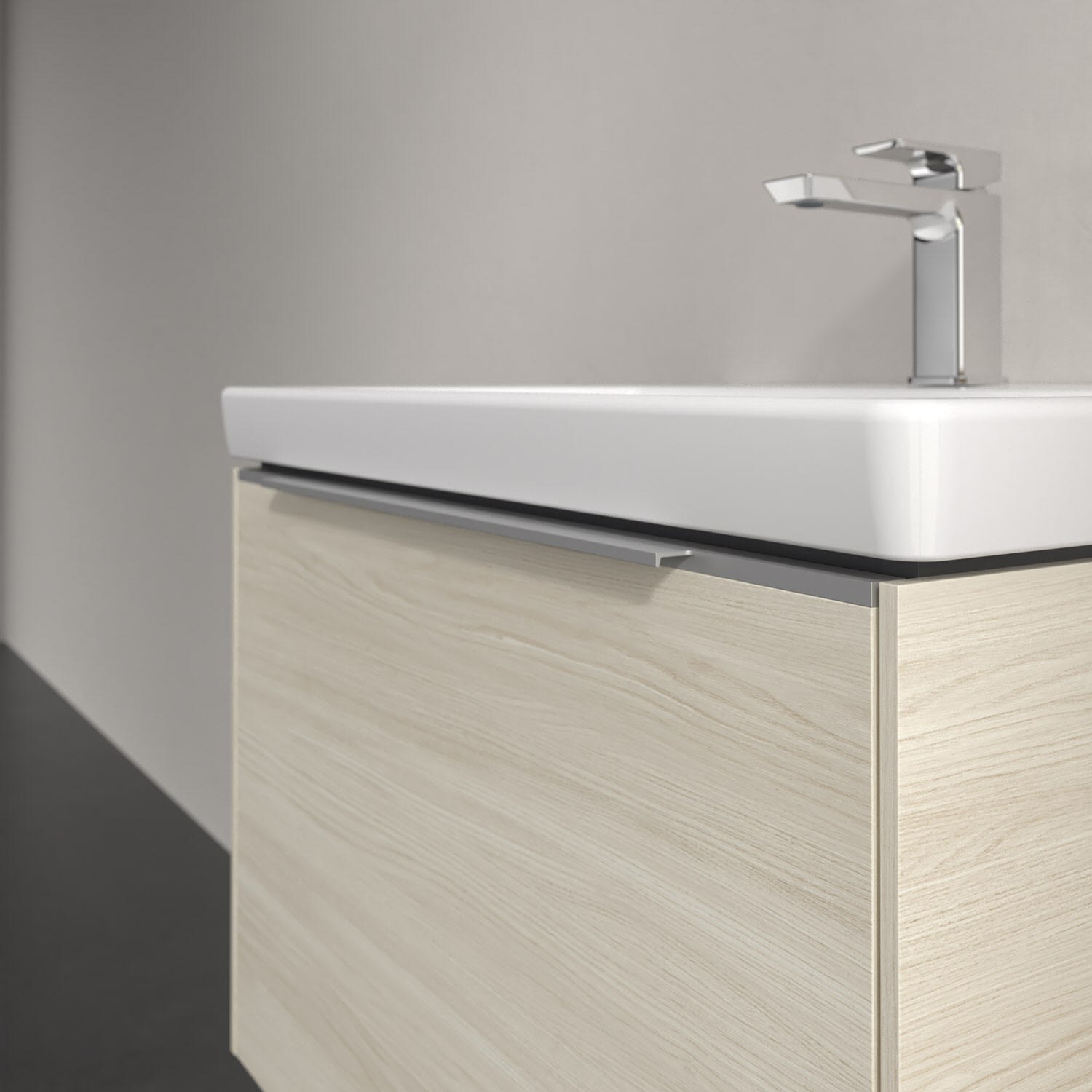 Der Waschtischunterschrank der Kollektion Subway 3.0 von Villeroy & Boch besticht durch gradliniges, zeitloses Design und großzügigen Stauraum. Front und Korpus sind mit einer hochwertigen Direktbeschichtung oder Lackierung, deren Anti-Fingerprint-Oberfläche unschönen Fingerabdrücken vorbeugt, versehen. Für eine einfache Handhabung sorgt eine dezente Griffleiste. Eine voll ausziehbare Schublade mit rutschhemmendem Boden, Selbsteinzug-Funktion und zwei integrierten kleinen Accessory-Boxen bietet Platz für Pflege- und Hygieneartikel. Integriert ist eine funktionale LED-Leiste, die mit neutralweißem Licht das Innenleben beleuchtet. Highlight ist die LED-Bodenbeleuchtung, die stimmungsvolles, sanftes Licht ins Bad bringt und nachts als Orientierungshilfe dient. Helligkeit und Lichtfarbe können über den kapazitiven Sensor eingestellt werden. Die LED-Leuchten lassen sich durch einen Fachhandwerker austauschen.