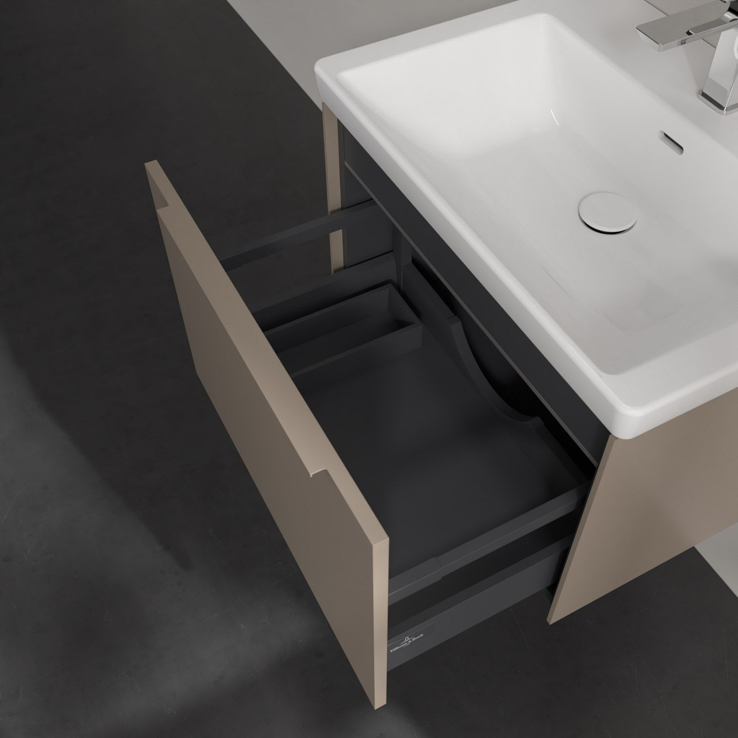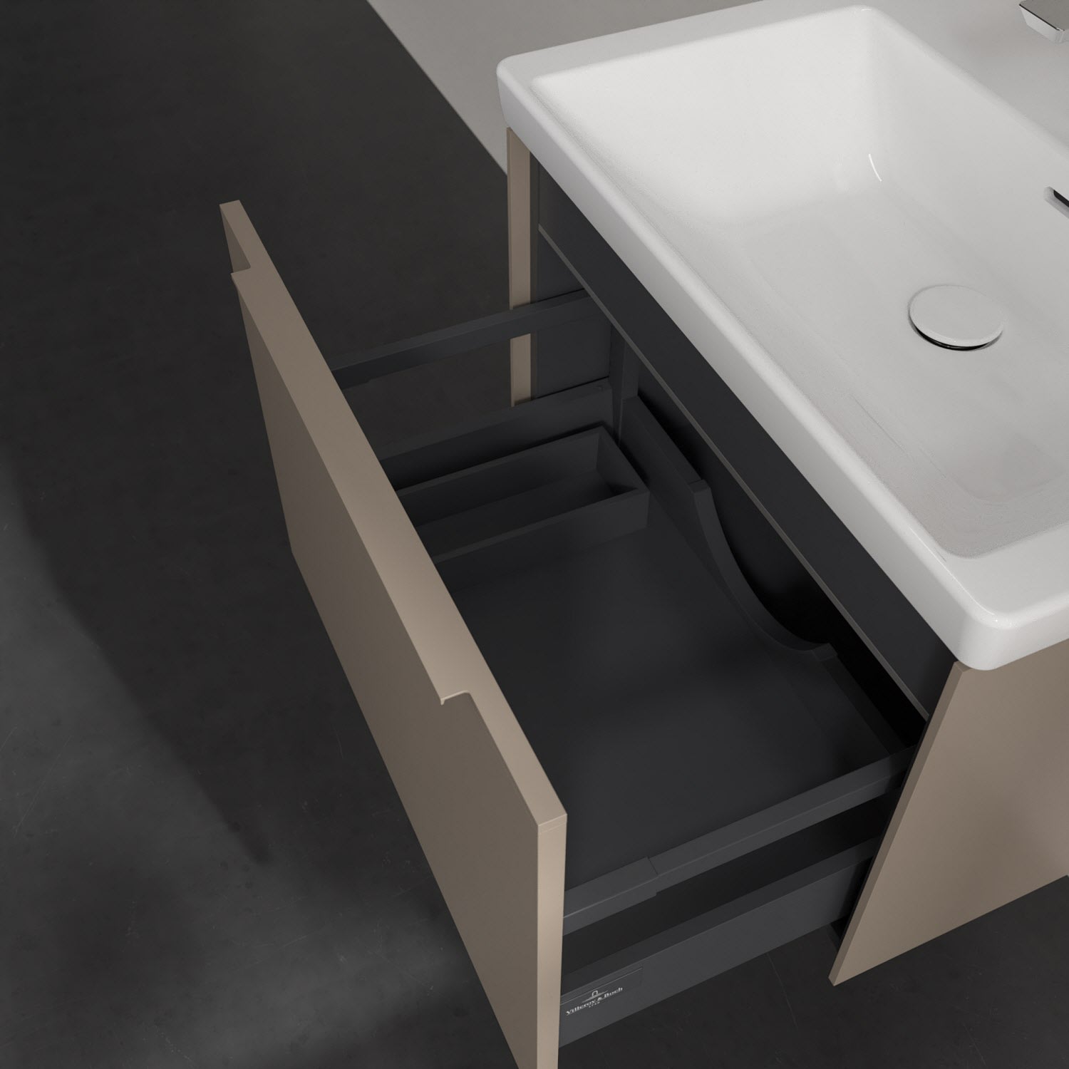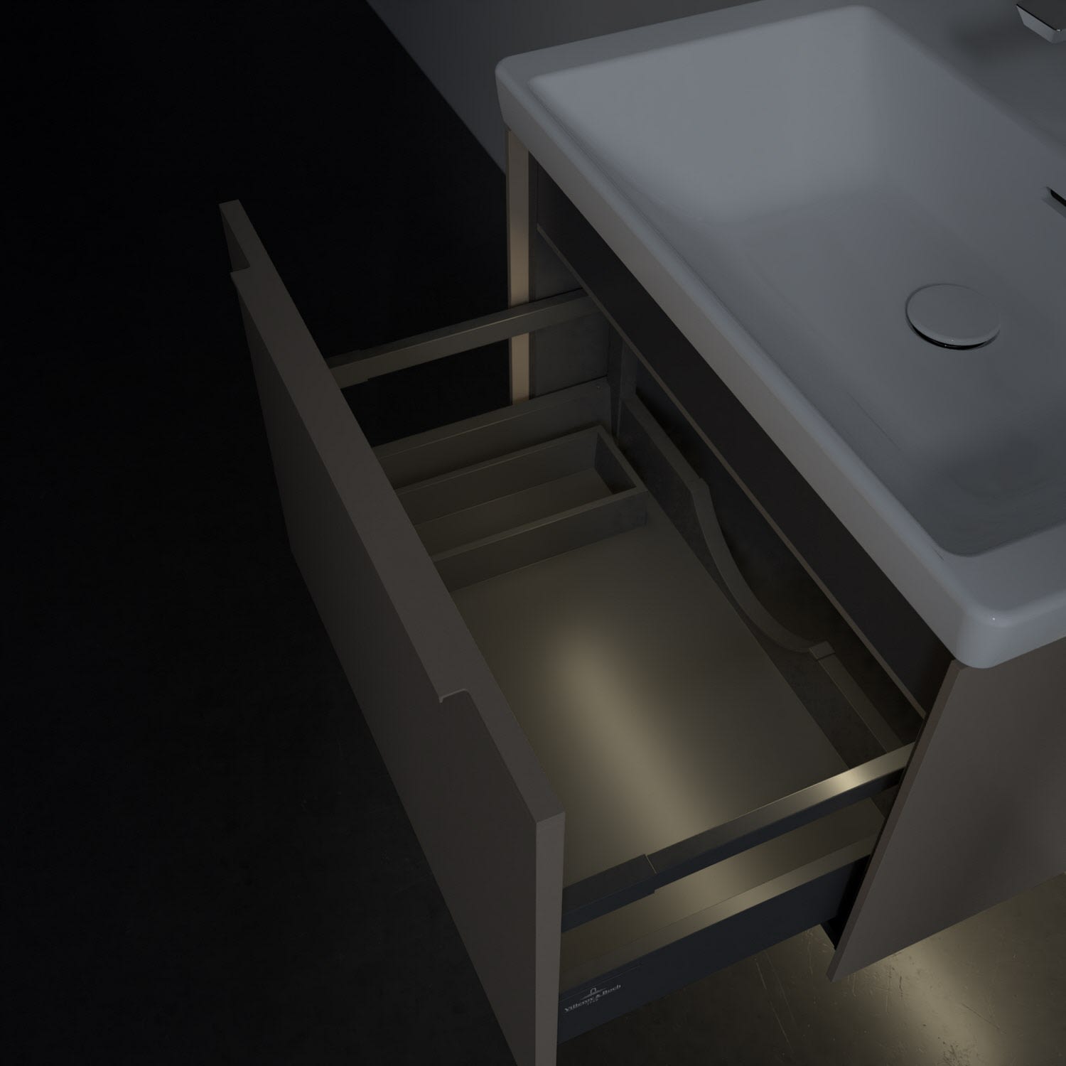 Der Waschtischunterschrank der Kollektion Subway 3.0 von Villeroy & Boch besticht durch gradliniges, zeitloses Design und großzügigen Stauraum. Front und Korpus sind mit einer hochwertigen Direktbeschichtung oder Lackierung, deren Anti-Fingerprint-Oberfläche unschönen Fingerabdrücken vorbeugt, versehen. Für eine einfache Handhabung sorgt eine dezente Griffleiste. Eine voll ausziehbare Schublade mit rutschhemmendem Boden, Selbsteinzug-Funktion und zwei integrierten kleinen Accessory-Boxen bietet Platz für Pflege- und Hygieneartikel. Integriert ist eine funktionale LED-Leiste, die mit neutralweißem Licht das Innenleben beleuchtet. Highlight ist die LED-Bodenbeleuchtung, die stimmungsvolles, sanftes Licht ins Bad bringt und nachts als Orientierungshilfe dient. Helligkeit und Lichtfarbe können über den kapazitiven Sensor eingestellt werden. Die LED-Leuchten lassen sich durch einen Fachhandwerker austauschen.