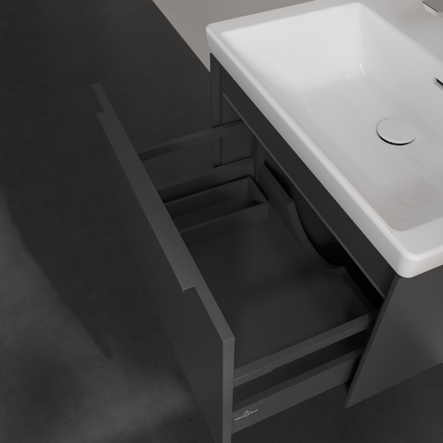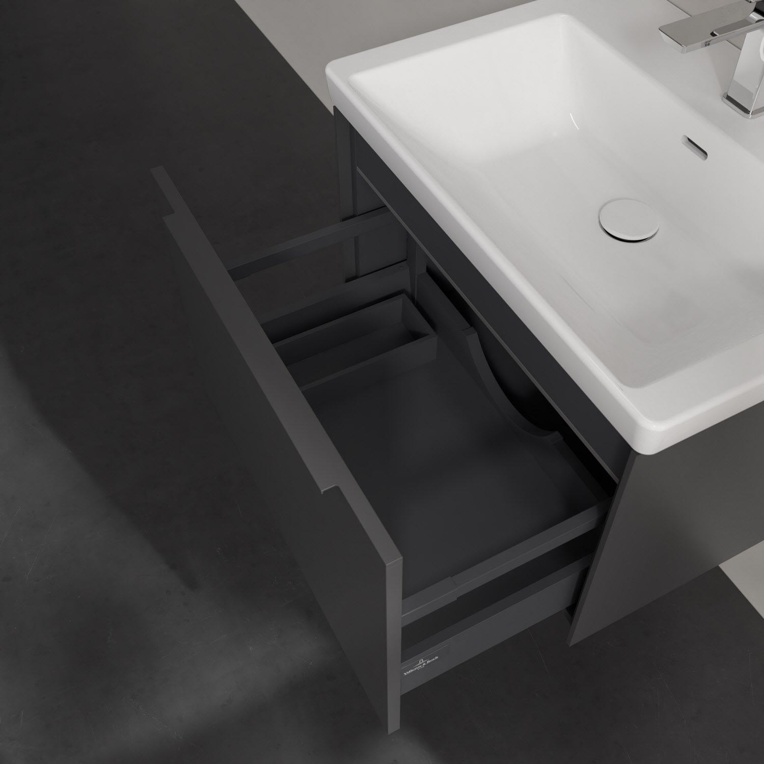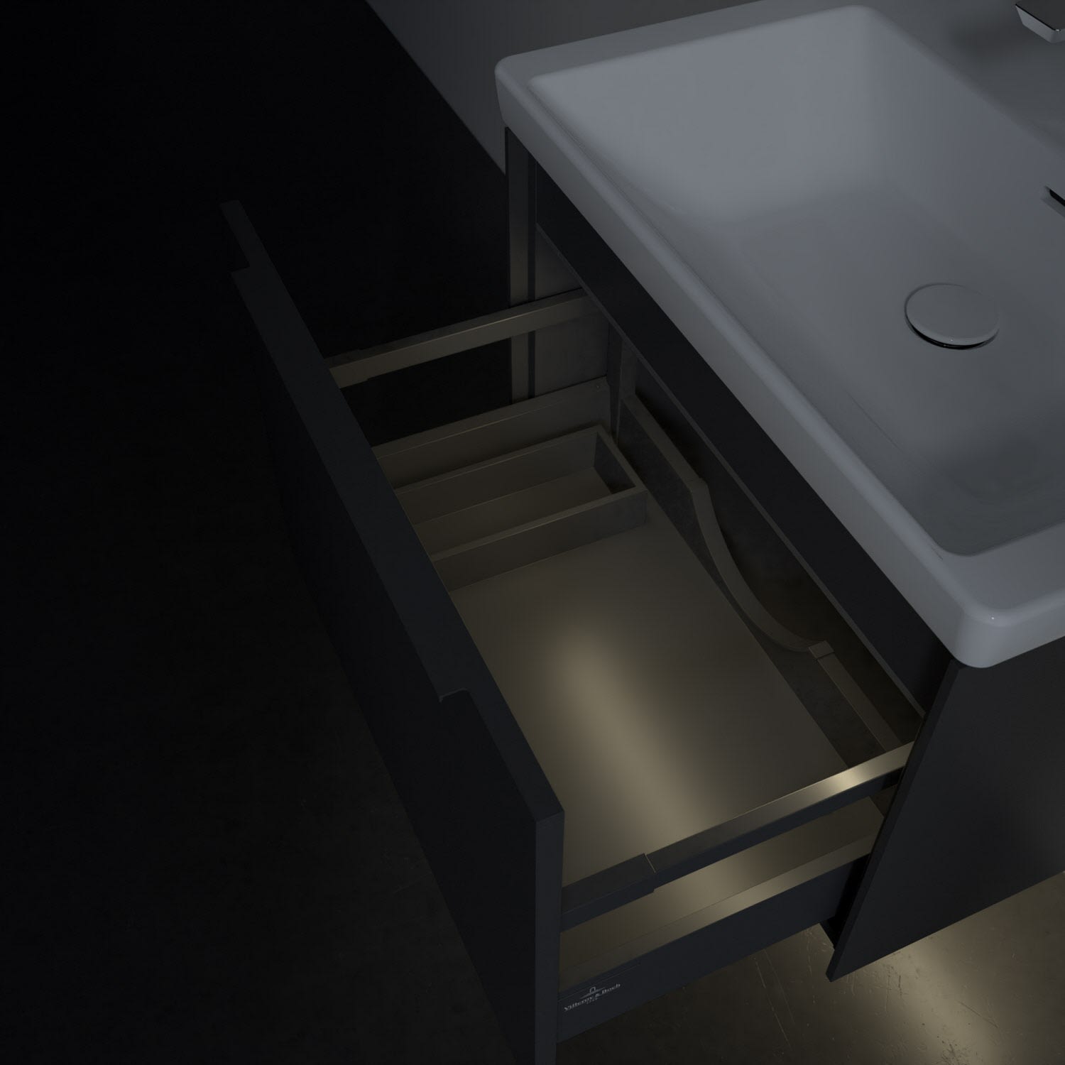 Der Waschtischunterschrank der Kollektion Subway 3.0 von Villeroy & Boch besticht durch gradliniges, zeitloses Design und großzügigen Stauraum. Front und Korpus sind mit einer hochwertigen Direktbeschichtung oder Lackierung, deren Anti-Fingerprint-Oberfläche unschönen Fingerabdrücken vorbeugt, versehen. Für eine einfache Handhabung sorgt eine dezente Griffleiste. Eine voll ausziehbare Schublade mit rutschhemmendem Boden, Selbsteinzug-Funktion und zwei integrierten kleinen Accessory-Boxen bietet Platz für Pflege- und Hygieneartikel. Integriert ist eine funktionale LED-Leiste, die mit neutralweißem Licht das Innenleben beleuchtet. Highlight ist die LED-Bodenbeleuchtung, die stimmungsvolles, sanftes Licht ins Bad bringt und nachts als Orientierungshilfe dient. Helligkeit und Lichtfarbe können über den kapazitiven Sensor eingestellt werden. Die LED-Leuchten lassen sich durch einen Fachhandwerker austauschen.