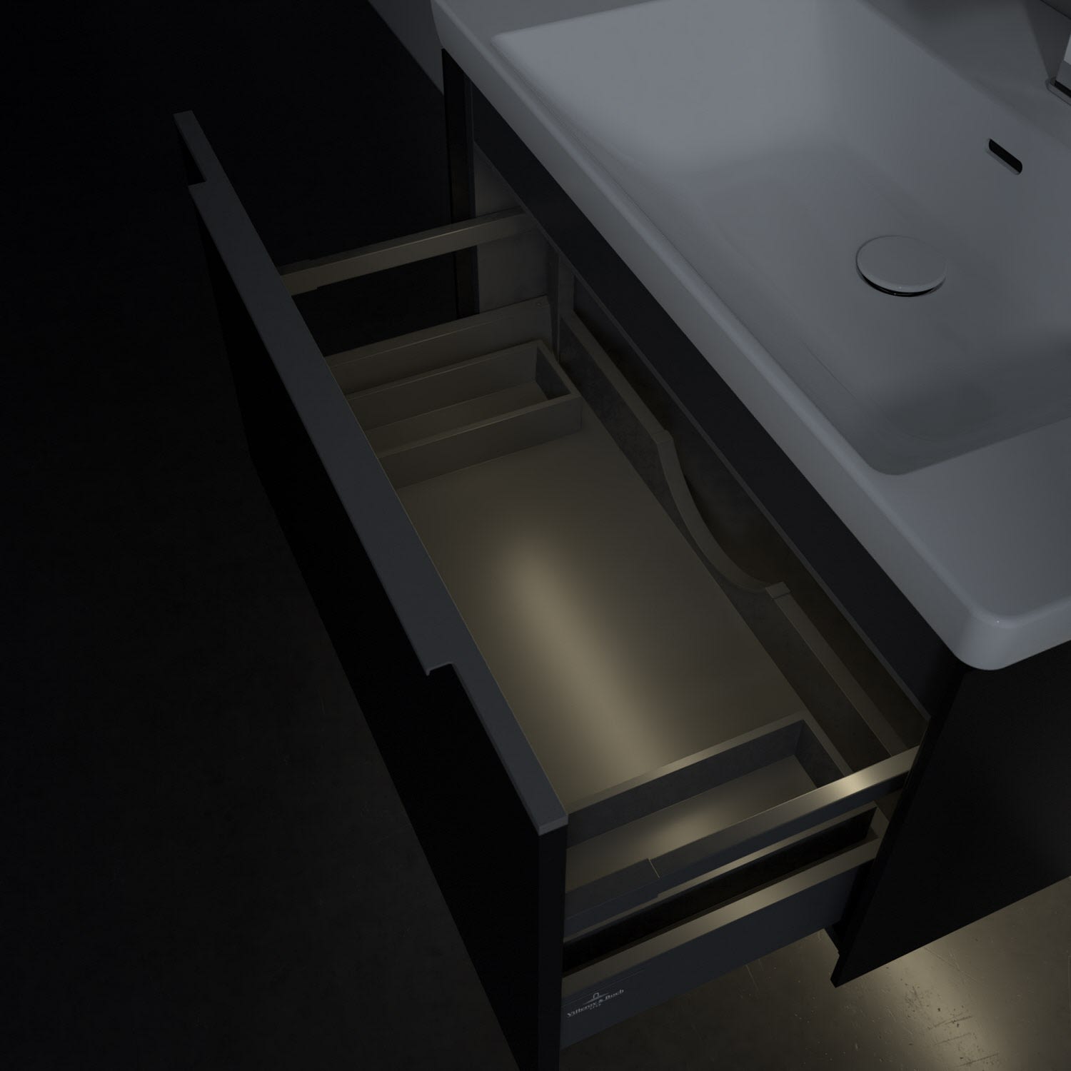 Der Waschtischunterschrank der Kollektion Subway 3.0 von Villeroy & Boch besticht durch gradliniges, zeitloses Design und großzügigen Stauraum. Front und Korpus sind mit einer hochwertigen Direktbeschichtung oder Lackierung, deren Anti-Fingerprint-Oberfläche unschönen Fingerabdrücken vorbeugt, versehen. Für eine einfache Handhabung sorgt eine dezente Griffleiste. Eine voll ausziehbare Schublade mit rutschhemmendem Boden, Selbsteinzug-Funktion und zwei integrierten kleinen Accessory-Boxen bietet Platz für Pflege- und Hygieneartikel. Integriert ist eine funktionale LED-Leiste, die mit neutralweißem Licht das Innenleben beleuchtet. Highlight ist die LED-Bodenbeleuchtung, die stimmungsvolles, sanftes Licht ins Bad bringt und nachts als Orientierungshilfe dient. Helligkeit und Lichtfarbe können über den kapazitiven Sensor eingestellt werden. Die LED-Leuchten lassen sich durch einen Fachhandwerker austauschen.
