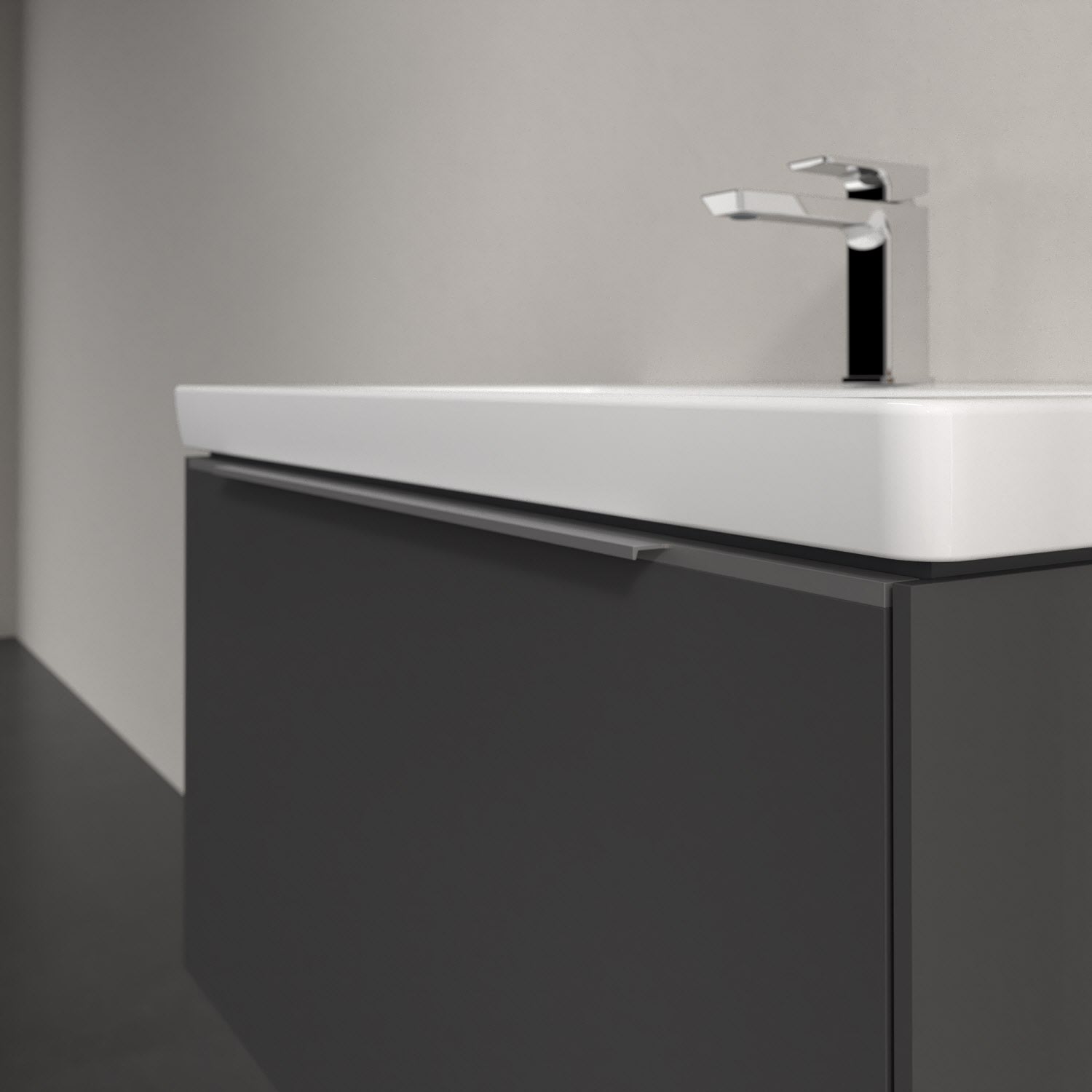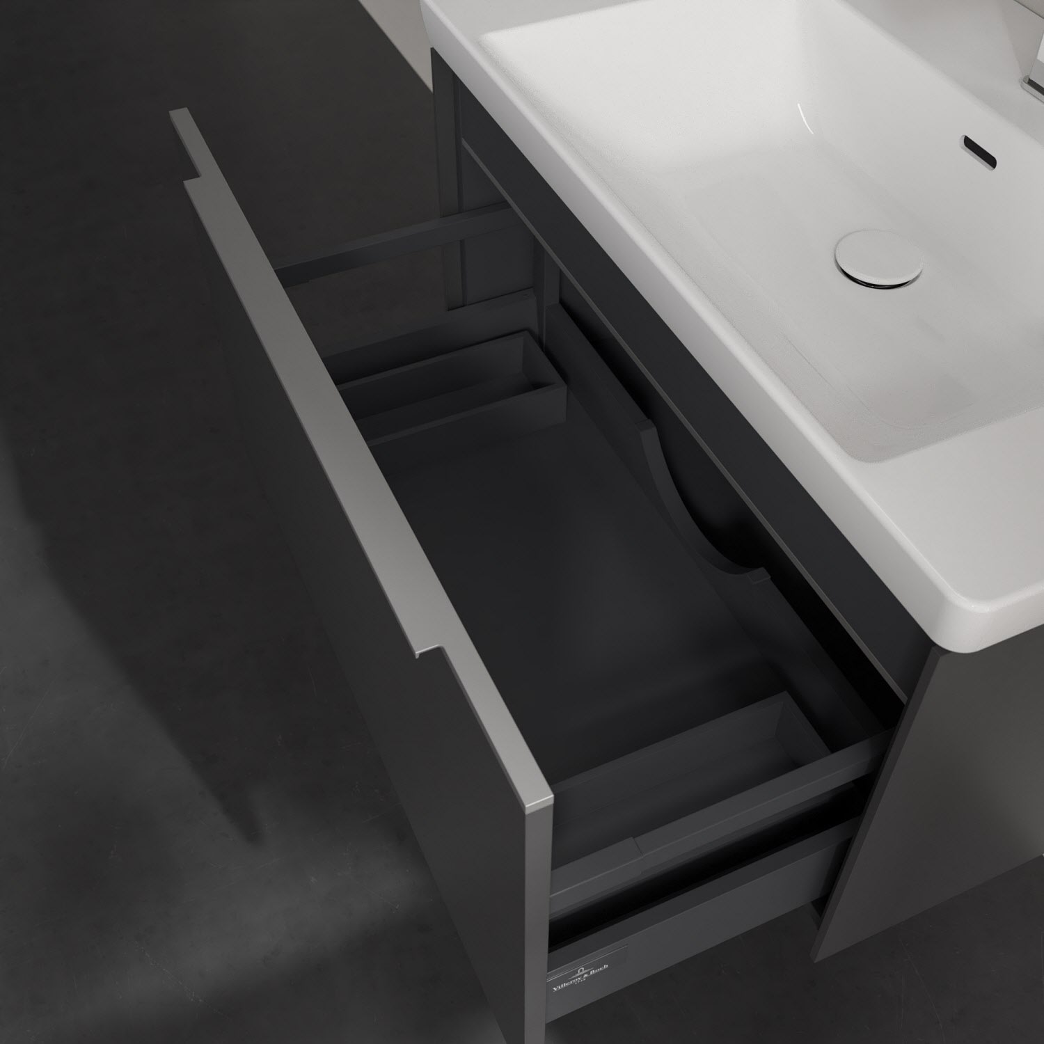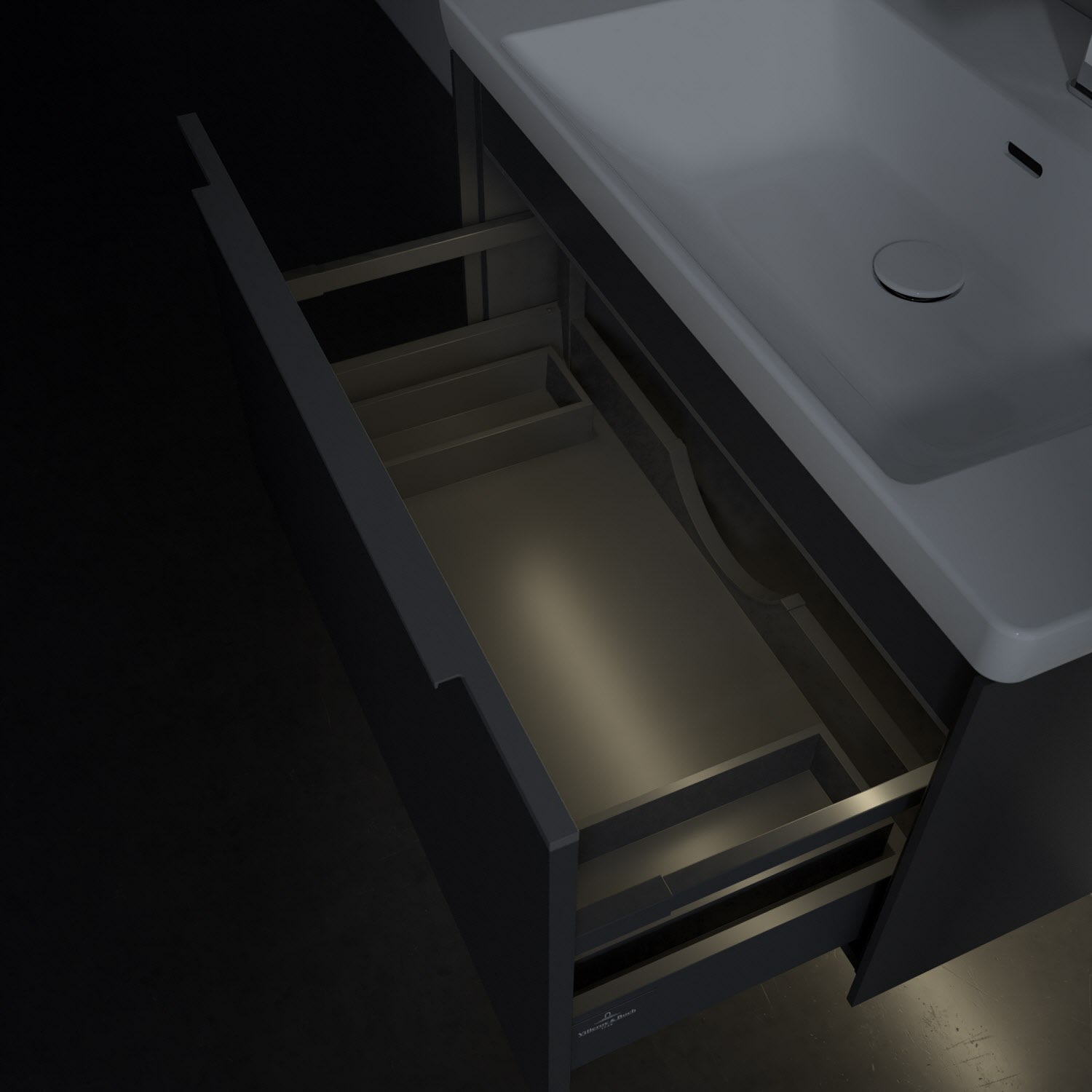 Der Waschtischunterschrank der Kollektion Subway 3.0 von Villeroy & Boch besticht durch gradliniges, zeitloses Design und großzügigen Stauraum. Front und Korpus sind mit einer hochwertigen Direktbeschichtung oder Lackierung, deren Anti-Fingerprint-Oberfläche unschönen Fingerabdrücken vorbeugt, versehen. Für eine einfache Handhabung sorgt eine dezente Griffleiste. Eine voll ausziehbare Schublade mit rutschhemmendem Boden, Selbsteinzug-Funktion und zwei integrierten kleinen Accessory-Boxen bietet Platz für Pflege- und Hygieneartikel. Integriert ist eine funktionale LED-Leiste, die mit neutralweißem Licht das Innenleben beleuchtet. Highlight ist die LED-Bodenbeleuchtung, die stimmungsvolles, sanftes Licht ins Bad bringt und nachts als Orientierungshilfe dient. Helligkeit und Lichtfarbe können über den kapazitiven Sensor eingestellt werden. Die LED-Leuchten lassen sich durch einen Fachhandwerker austauschen.