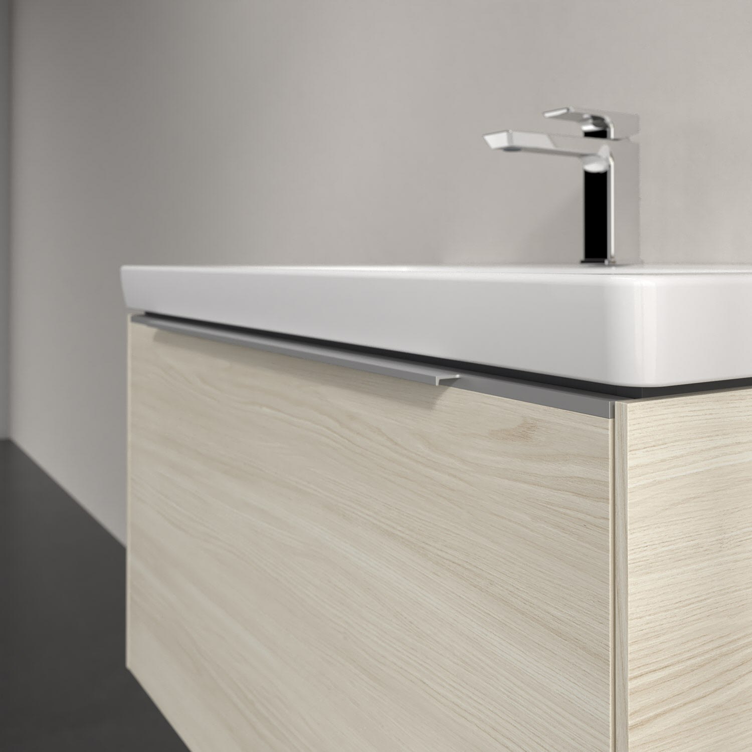Der Waschtischunterschrank der Kollektion Subway 3.0 von Villeroy & Boch besticht durch gradliniges, zeitloses Design und großzügigen Stauraum. Front und Korpus sind mit einer hochwertigen Direktbeschichtung oder Lackierung, deren Anti-Fingerprint-Oberfläche unschönen Fingerabdrücken vorbeugt, versehen. Für eine einfache Handhabung sorgt eine dezente Griffleiste. Eine voll ausziehbare Schublade mit rutschhemmendem Boden, Selbsteinzug-Funktion und zwei integrierten kleinen Accessory-Boxen bietet Platz für Pflege- und Hygieneartikel. Integriert ist eine funktionale LED-Leiste, die mit neutralweißem Licht das Innenleben beleuchtet. Highlight ist die LED-Bodenbeleuchtung, die stimmungsvolles, sanftes Licht ins Bad bringt und nachts als Orientierungshilfe dient. Helligkeit und Lichtfarbe können über den kapazitiven Sensor eingestellt werden. Die LED-Leuchten lassen sich durch einen Fachhandwerker austauschen.