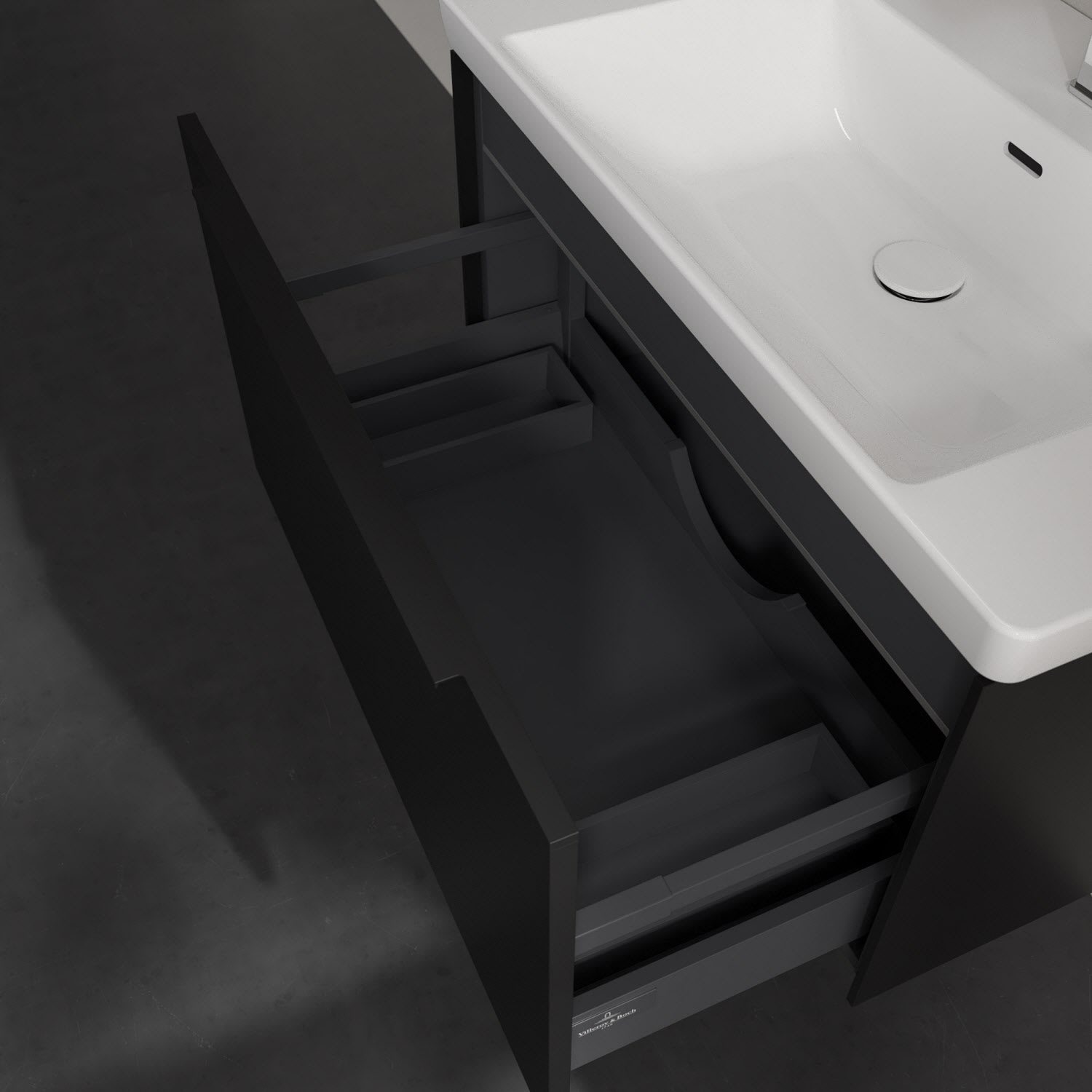 Der Waschtischunterschrank der Kollektion Subway 3.0 von Villeroy & Boch besticht durch gradliniges, zeitloses Design und großzügigen Stauraum. Front und Korpus sind mit einer hochwertigen Direktbeschichtung oder Lackierung, deren Anti-Fingerprint-Oberfläche unschönen Fingerabdrücken vorbeugt, versehen. Für eine einfache Handhabung sorgt eine dezente Griffleiste. Eine voll ausziehbare Schublade mit rutschhemmendem Boden, Selbsteinzug-Funktion und zwei integrierten kleinen Accessory-Boxen bietet Platz für Pflege- und Hygieneartikel. Integriert ist eine funktionale LED-Leiste, die mit neutralweißem Licht das Innenleben beleuchtet. Highlight ist die LED-Bodenbeleuchtung, die stimmungsvolles, sanftes Licht ins Bad bringt und nachts als Orientierungshilfe dient. Helligkeit und Lichtfarbe können über den kapazitiven Sensor eingestellt werden. Die LED-Leuchten lassen sich durch einen Fachhandwerker austauschen.