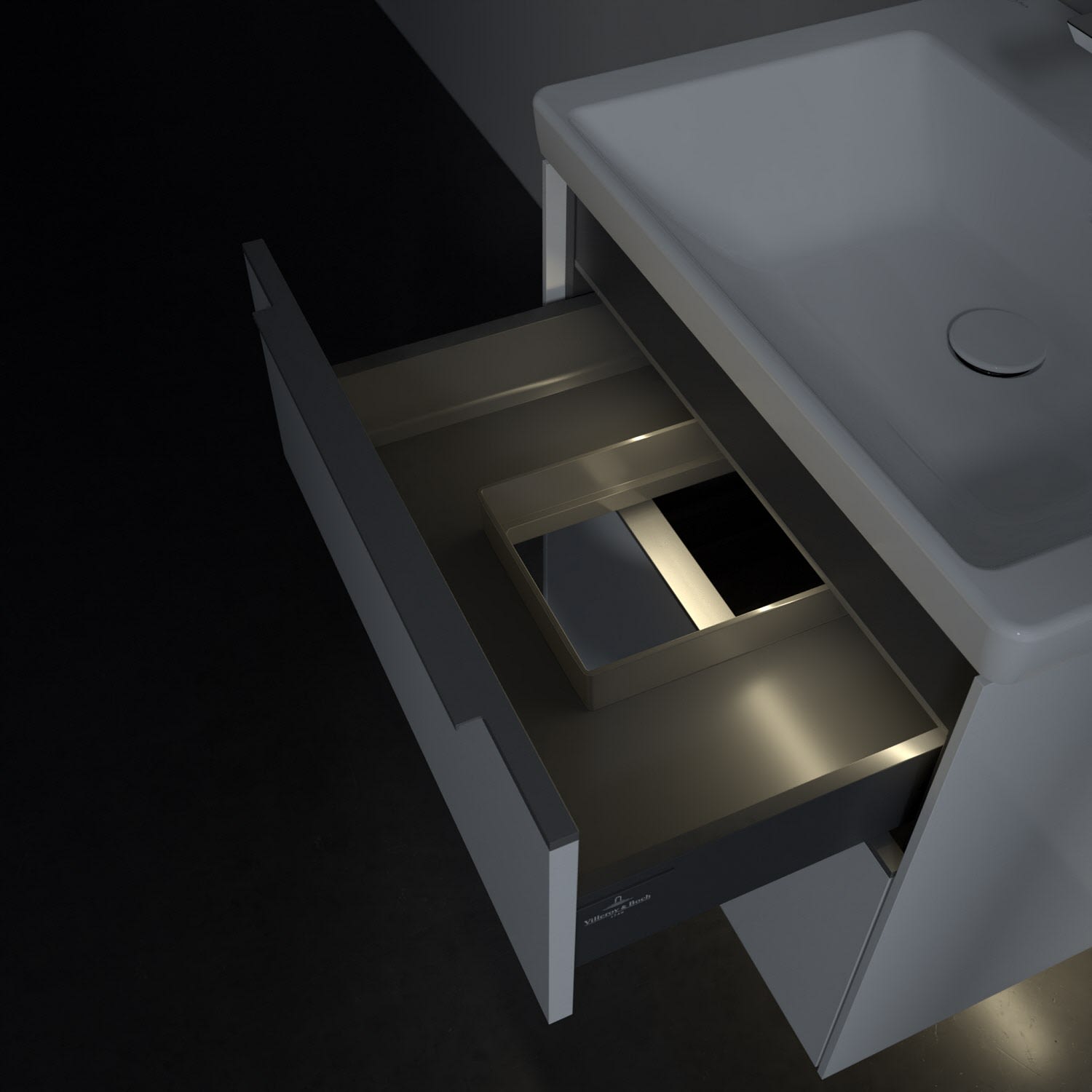 Der Waschtischunterschrank der Kollektion Subway 3.0 von Villeroy & Boch besticht durch gradliniges, zeitloses Design und großzügigen Stauraum. Front und Korpus sind mit einer hochwertigen Direktbeschichtung oder Lackierung, deren Anti-Fingerprint-Oberfläche unschönen Fingerabdrücken vorbeugt, versehen. Für eine einfache Handhabung sorgt eine dezente Griffleiste. Zwei voll ausziehbare Schubladen mit rutschhemmenden Böden, Selbsteinzug-Funktion und zwei integrierten kleinen Accessory-Boxen bieten besonders viel Platz für Pflege- und Hygieneartikel. Der obere Auszug ist mit einer funktionalen LED-Leiste ausgestattet, die mit neutralweißem Licht das Innenleben beleuchtet. Highlight ist die LED-Bodenbeleuchtung, die stimmungsvolles, sanftes Licht ins Bad bringt und nachts als Orientierungshilfe dient. Helligkeit und Lichtfarbe können über den kapazitiven Sensor eingestellt werden. Die LED-Leuchten lassen sich durch einen Fachhandwerker austauschen.