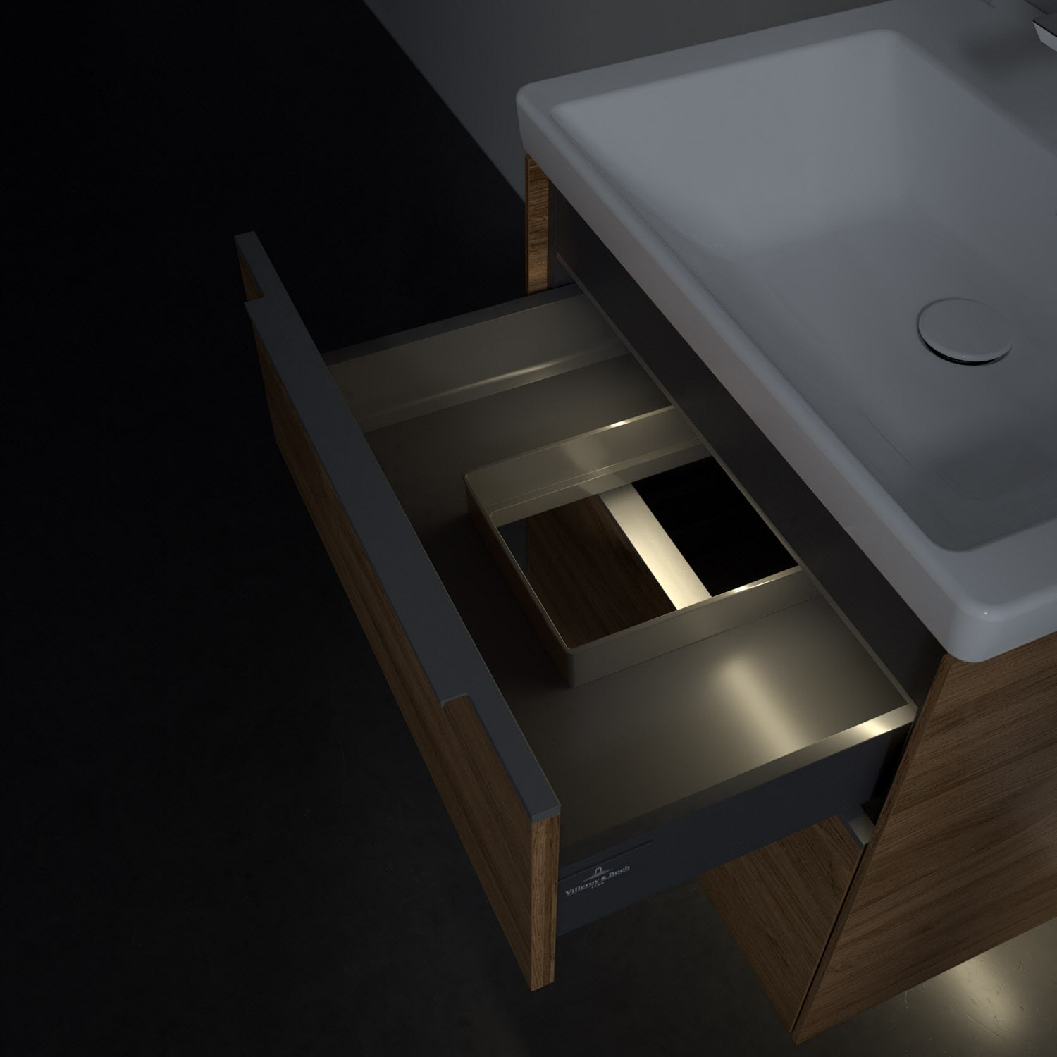 Der Waschtischunterschrank der Kollektion Subway 3.0 von Villeroy & Boch besticht durch gradliniges, zeitloses Design und großzügigen Stauraum. Front und Korpus sind mit einer hochwertigen Direktbeschichtung oder Lackierung, deren Anti-Fingerprint-Oberfläche unschönen Fingerabdrücken vorbeugt, versehen. Für eine einfache Handhabung sorgt eine dezente Griffleiste. Zwei voll ausziehbare Schubladen mit rutschhemmenden Böden, Selbsteinzug-Funktion und zwei integrierten kleinen Accessory-Boxen bieten besonders viel Platz für Pflege- und Hygieneartikel. Der obere Auszug ist mit einer funktionalen LED-Leiste ausgestattet, die mit neutralweißem Licht das Innenleben beleuchtet. Highlight ist die LED-Bodenbeleuchtung, die stimmungsvolles, sanftes Licht ins Bad bringt und nachts als Orientierungshilfe dient. Helligkeit und Lichtfarbe können über den kapazitiven Sensor eingestellt werden. Die LED-Leuchten lassen sich durch einen Fachhandwerker austauschen.