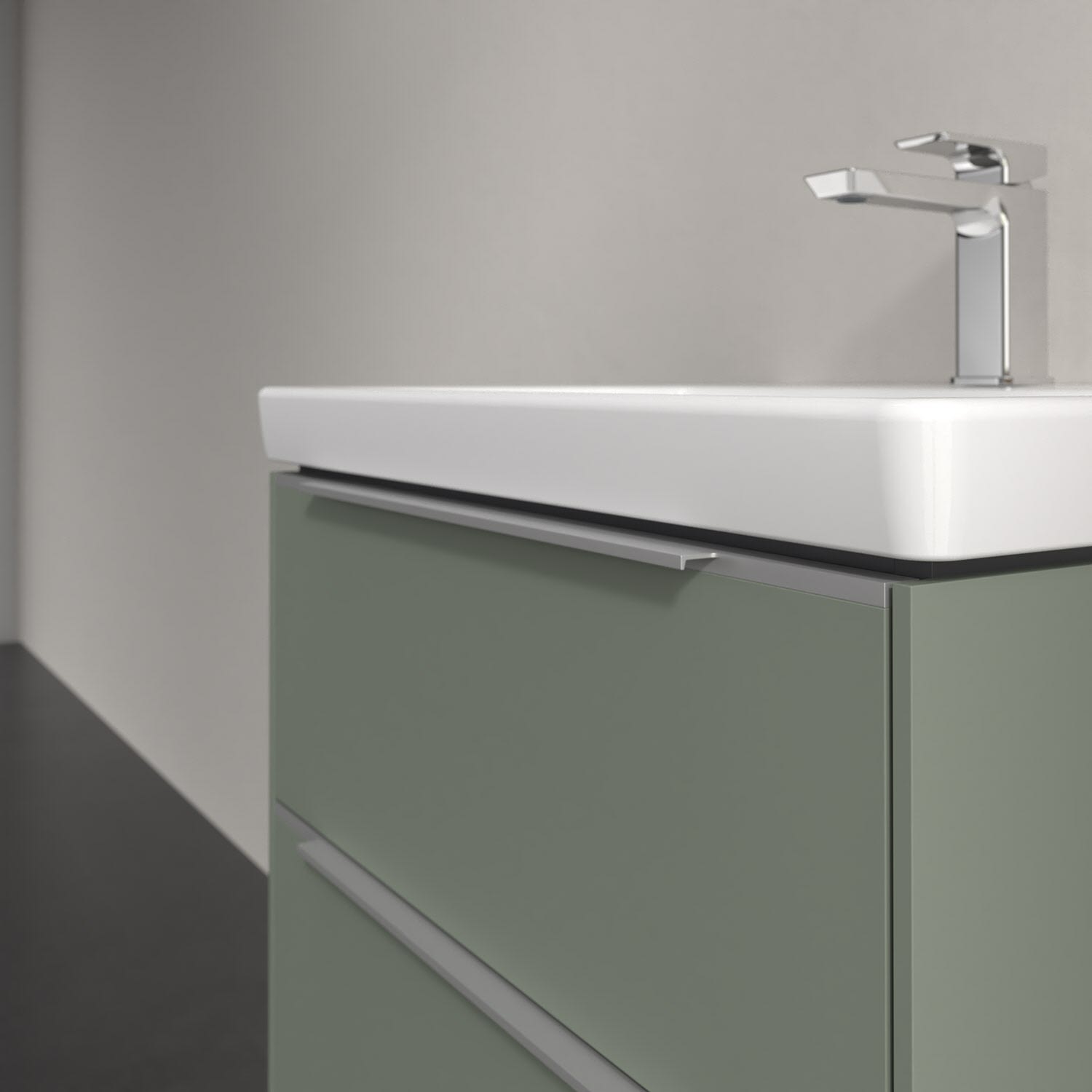 Der Waschtischunterschrank der Kollektion Subway 3.0 von Villeroy & Boch besticht durch gradliniges, zeitloses Design und großzügigen Stauraum. Front und Korpus sind mit einer hochwertigen Direktbeschichtung oder Lackierung, deren Anti-Fingerprint-Oberfläche unschönen Fingerabdrücken vorbeugt, versehen. Für eine einfache Handhabung sorgt eine dezente Griffleiste. Zwei voll ausziehbare Schubladen mit rutschhemmenden Böden, Selbsteinzug-Funktion und zwei integrierten kleinen Accessory-Boxen bieten besonders viel Platz für Pflege- und Hygieneartikel. Der obere Auszug ist mit einer funktionalen LED-Leiste ausgestattet, die mit neutralweißem Licht das Innenleben beleuchtet. Highlight ist die LED-Bodenbeleuchtung, die stimmungsvolles, sanftes Licht ins Bad bringt und nachts als Orientierungshilfe dient. Helligkeit und Lichtfarbe können über den kapazitiven Sensor eingestellt werden. Die LED-Leuchten lassen sich durch einen Fachhandwerker austauschen.