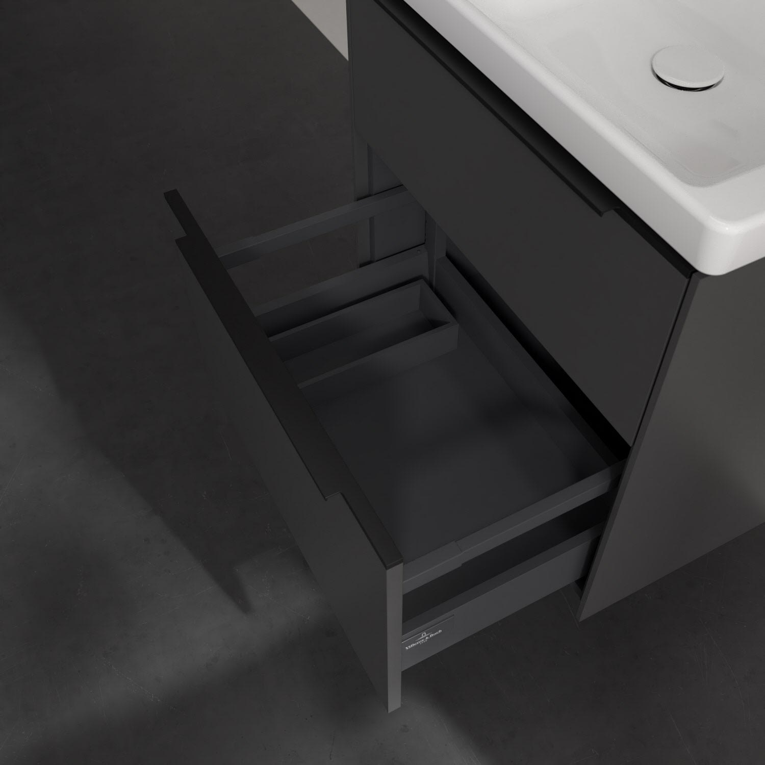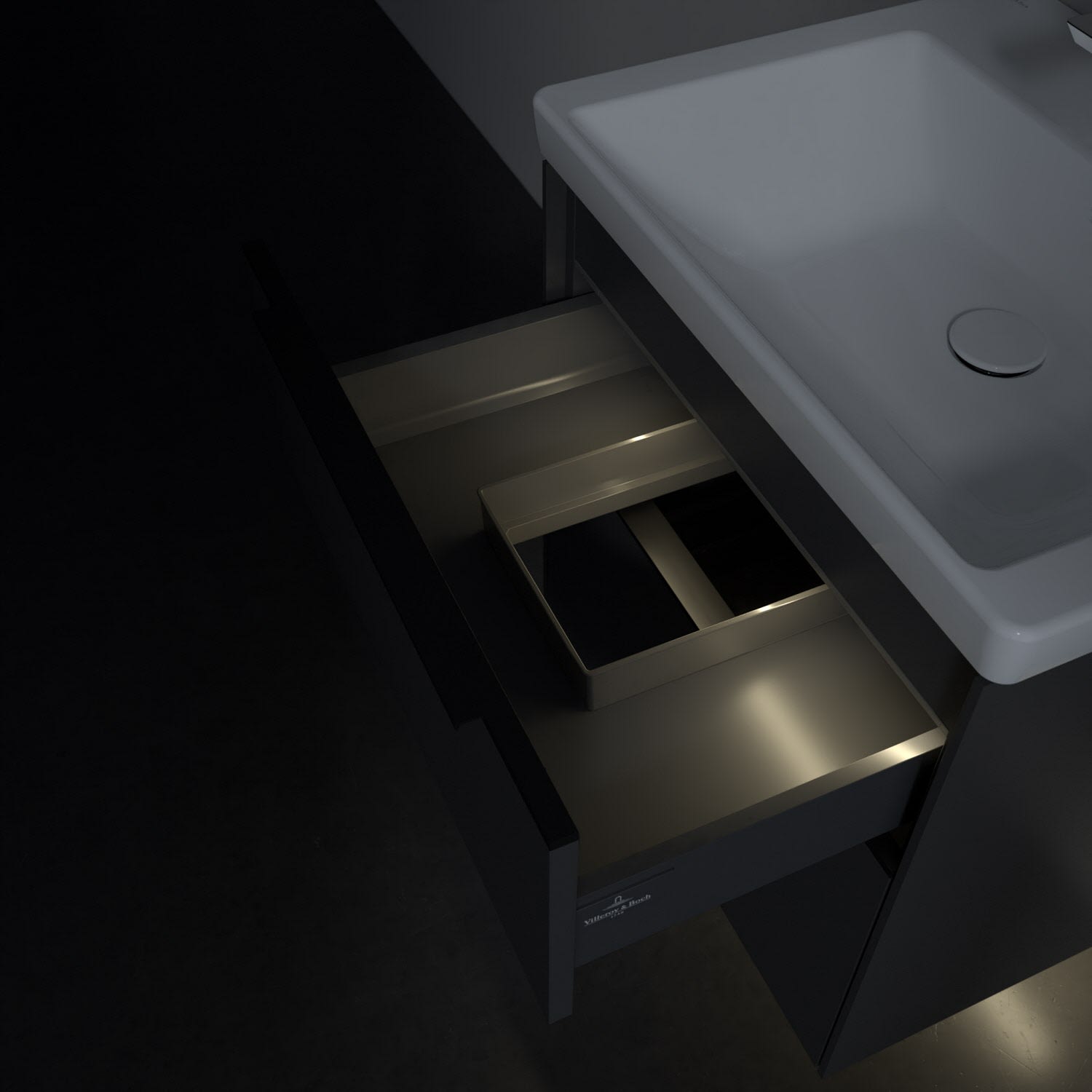 Der Waschtischunterschrank der Kollektion Subway 3.0 von Villeroy & Boch besticht durch gradliniges, zeitloses Design und großzügigen Stauraum. Front und Korpus sind mit einer hochwertigen Direktbeschichtung oder Lackierung, deren Anti-Fingerprint-Oberfläche unschönen Fingerabdrücken vorbeugt, versehen. Für eine einfache Handhabung sorgt eine dezente Griffleiste. Zwei voll ausziehbare Schubladen mit rutschhemmenden Böden, Selbsteinzug-Funktion und zwei integrierten kleinen Accessory-Boxen bieten besonders viel Platz für Pflege- und Hygieneartikel. Der obere Auszug ist mit einer funktionalen LED-Leiste ausgestattet, die mit neutralweißem Licht das Innenleben beleuchtet. Highlight ist die LED-Bodenbeleuchtung, die stimmungsvolles, sanftes Licht ins Bad bringt und nachts als Orientierungshilfe dient. Helligkeit und Lichtfarbe können über den kapazitiven Sensor eingestellt werden. Die LED-Leuchten lassen sich durch einen Fachhandwerker austauschen.