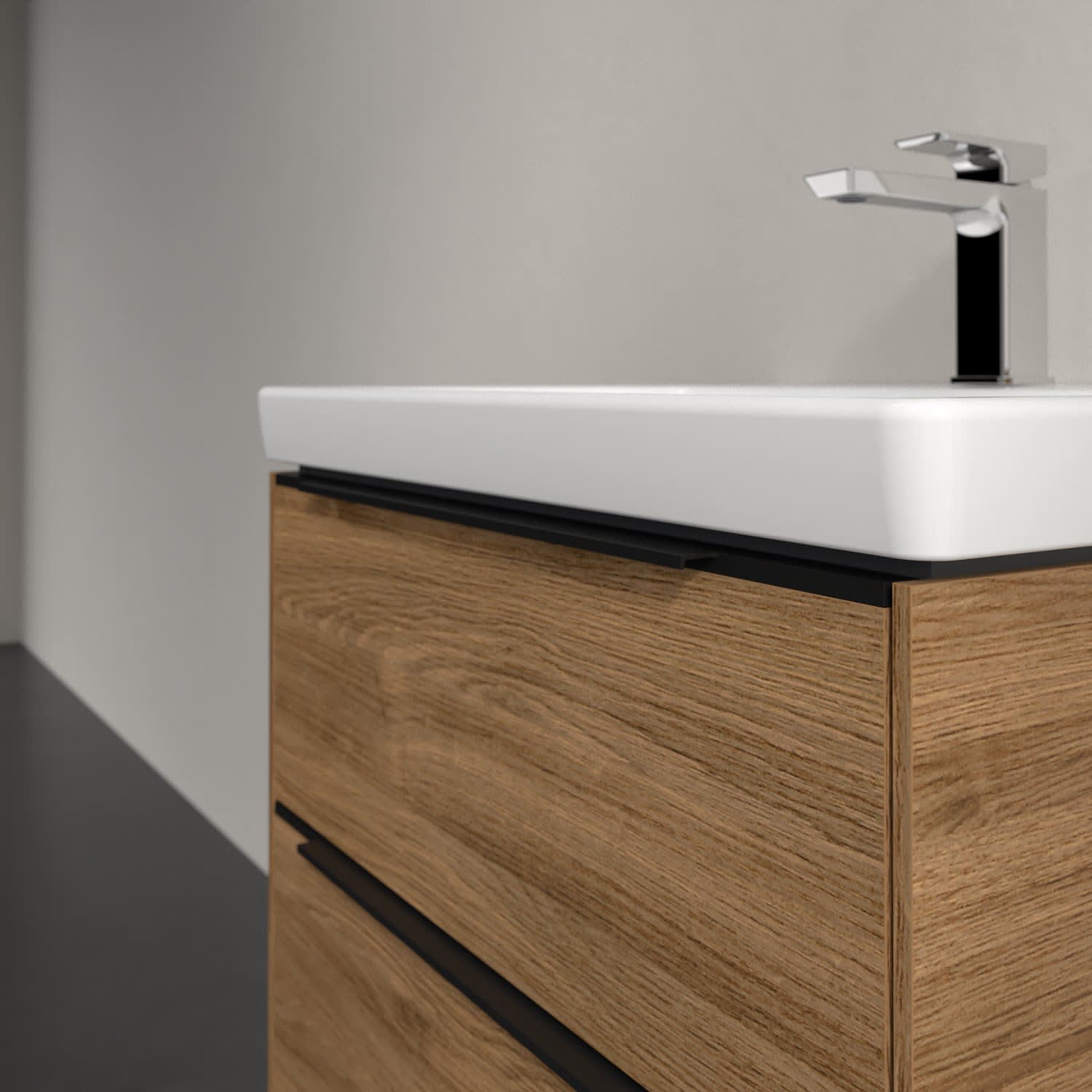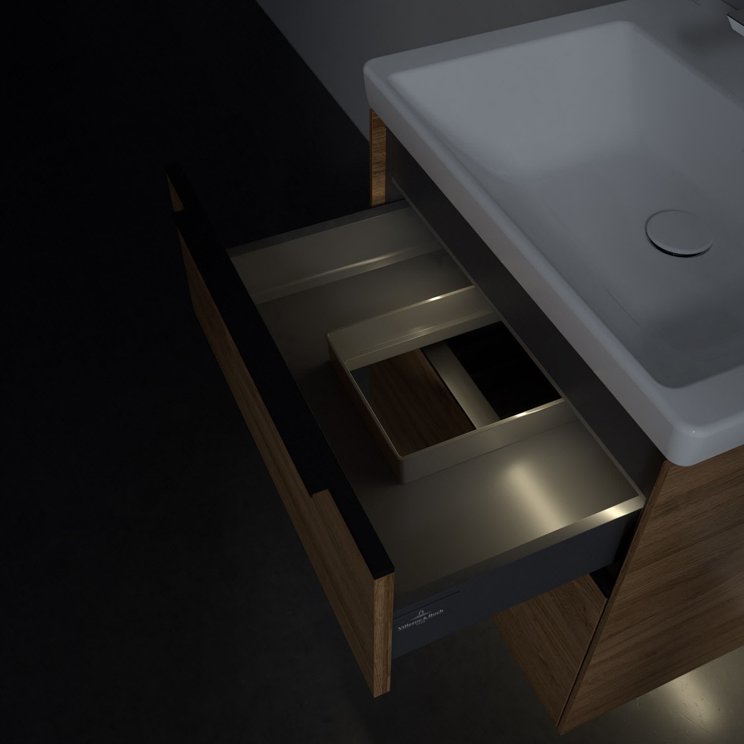 Der Waschtischunterschrank der Kollektion Subway 3.0 von Villeroy & Boch besticht durch gradliniges, zeitloses Design und großzügigen Stauraum. Front und Korpus sind mit einer hochwertigen Direktbeschichtung oder Lackierung, deren Anti-Fingerprint-Oberfläche unschönen Fingerabdrücken vorbeugt, versehen. Für eine einfache Handhabung sorgt eine dezente Griffleiste. Zwei voll ausziehbare Schubladen mit rutschhemmenden Böden, Selbsteinzug-Funktion und zwei integrierten kleinen Accessory-Boxen bieten besonders viel Platz für Pflege- und Hygieneartikel. Der obere Auszug ist mit einer funktionalen LED-Leiste ausgestattet, die mit neutralweißem Licht das Innenleben beleuchtet. Highlight ist die LED-Bodenbeleuchtung, die stimmungsvolles, sanftes Licht ins Bad bringt und nachts als Orientierungshilfe dient. Helligkeit und Lichtfarbe können über den kapazitiven Sensor eingestellt werden. Die LED-Leuchten lassen sich durch einen Fachhandwerker austauschen.