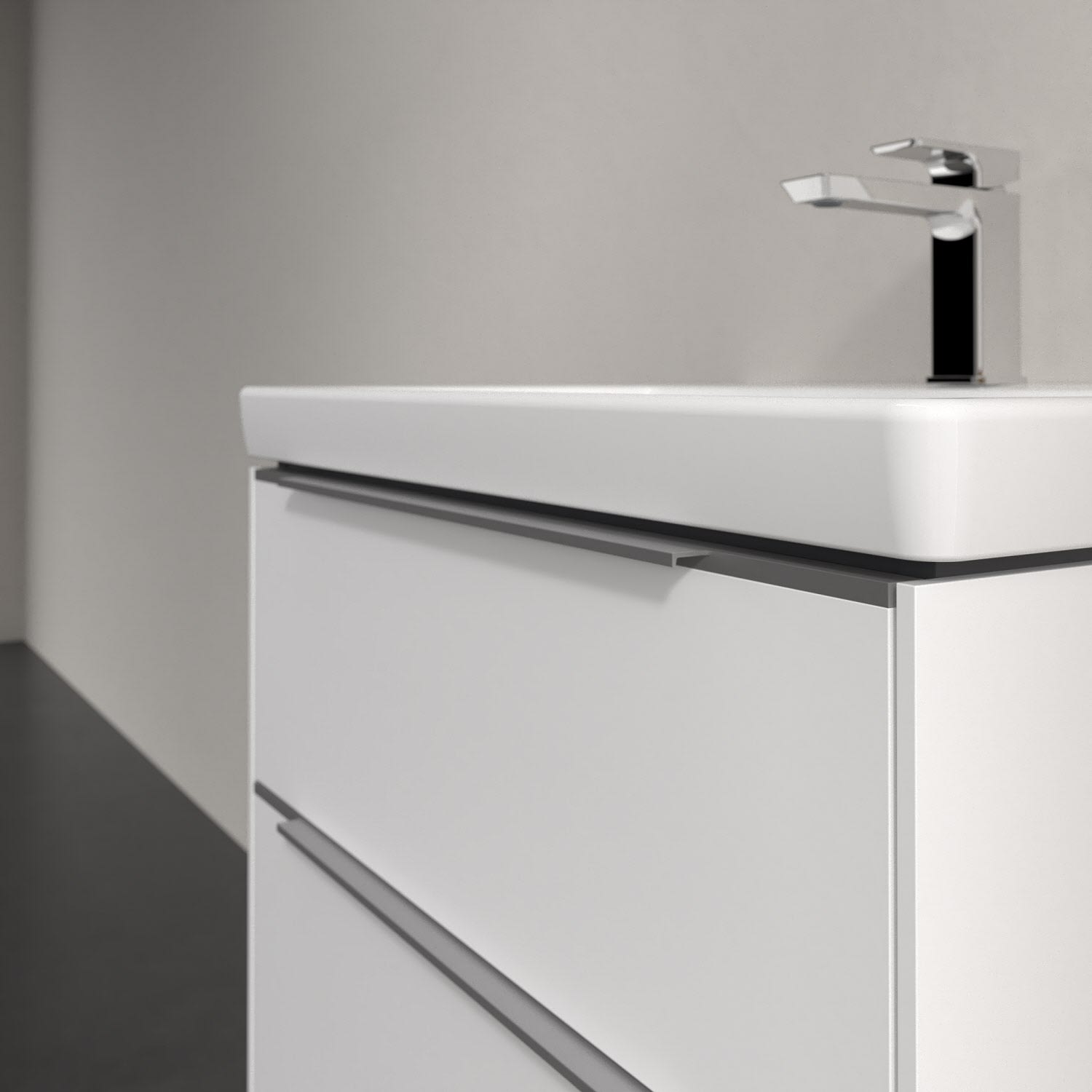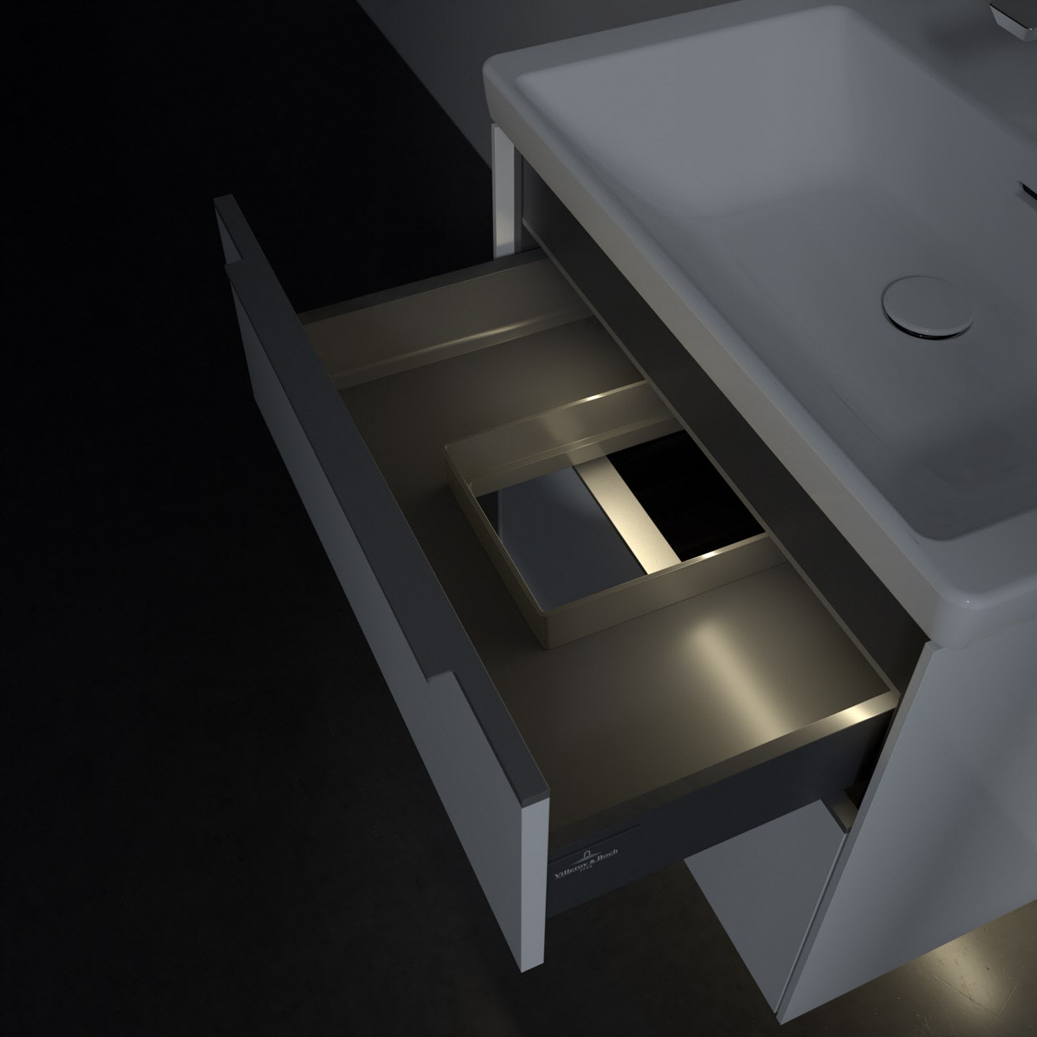 Der Waschtischunterschrank der Kollektion Subway 3.0 von Villeroy & Boch besticht durch gradliniges, zeitloses Design und großzügigen Stauraum. Front und Korpus sind mit einer hochwertigen Direktbeschichtung oder Lackierung, deren Anti-Fingerprint-Oberfläche unschönen Fingerabdrücken vorbeugt, versehen. Für eine einfache Handhabung sorgt eine dezente Griffleiste. Zwei voll ausziehbare Schubladen mit rutschhemmenden Böden, Selbsteinzug-Funktion und zwei integrierten kleinen Accessory-Boxen bieten besonders viel Platz für Pflege- und Hygieneartikel. Der obere Auszug ist mit einer funktionalen LED-Leiste ausgestattet, die mit neutralweißem Licht das Innenleben beleuchtet. Highlight ist die LED-Bodenbeleuchtung, die stimmungsvolles, sanftes Licht ins Bad bringt und nachts als Orientierungshilfe dient. Helligkeit und Lichtfarbe können über den kapazitiven Sensor eingestellt werden. Die LED-Leuchten lassen sich durch einen Fachhandwerker austauschen.