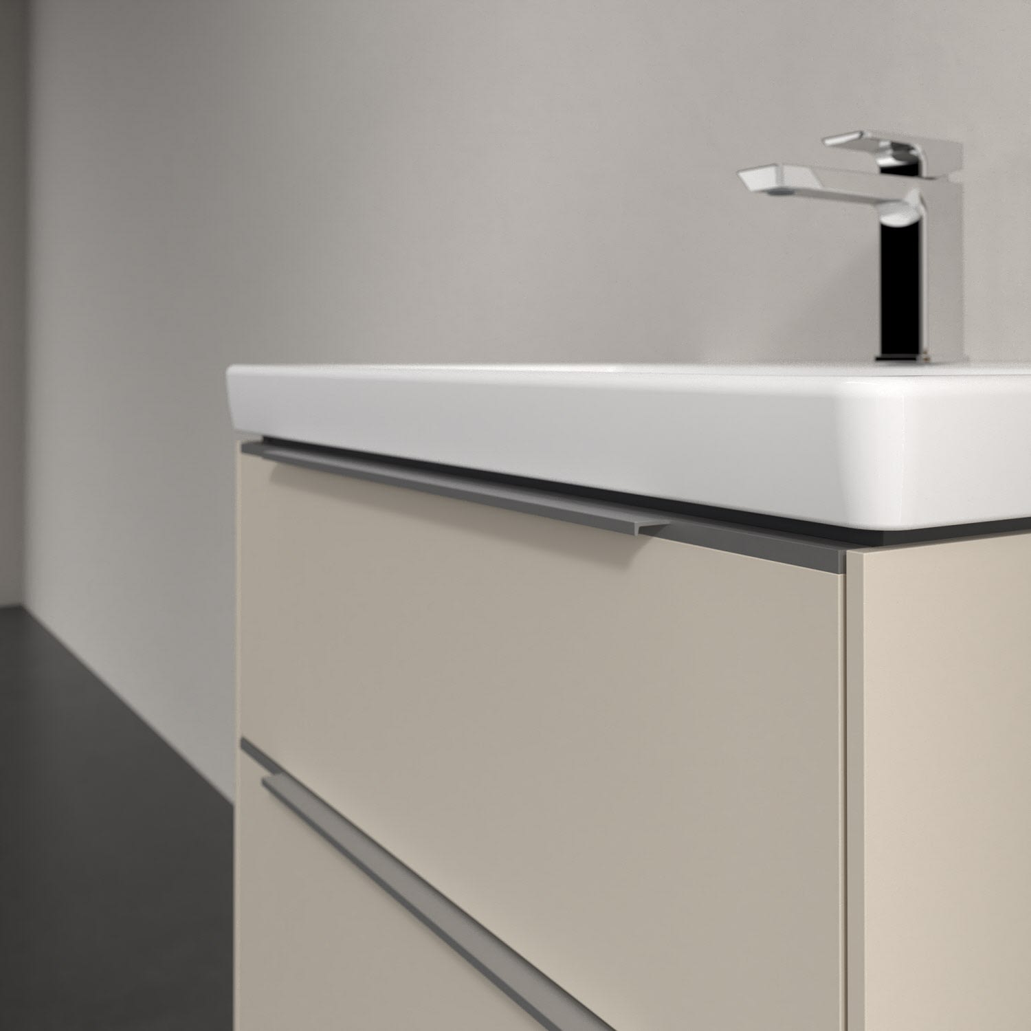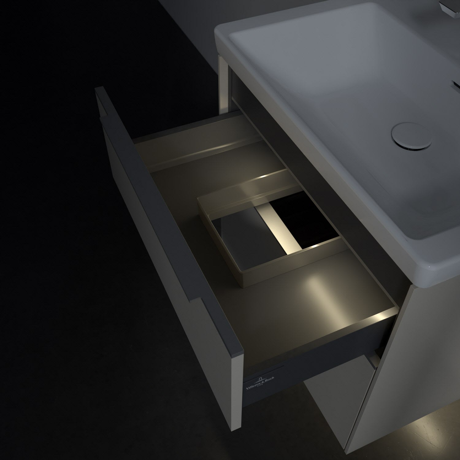 Der Waschtischunterschrank der Kollektion Subway 3.0 von Villeroy & Boch besticht durch gradliniges, zeitloses Design und großzügigen Stauraum. Front und Korpus sind mit einer hochwertigen Direktbeschichtung oder Lackierung, deren Anti-Fingerprint-Oberfläche unschönen Fingerabdrücken vorbeugt, versehen. Für eine einfache Handhabung sorgt eine dezente Griffleiste. Zwei voll ausziehbare Schubladen mit rutschhemmenden Böden, Selbsteinzug-Funktion und zwei integrierten kleinen Accessory-Boxen bieten besonders viel Platz für Pflege- und Hygieneartikel. Der obere Auszug ist mit einer funktionalen LED-Leiste ausgestattet, die mit neutralweißem Licht das Innenleben beleuchtet. Highlight ist die LED-Bodenbeleuchtung, die stimmungsvolles, sanftes Licht ins Bad bringt und nachts als Orientierungshilfe dient. Helligkeit und Lichtfarbe können über den kapazitiven Sensor eingestellt werden. Die LED-Leuchten lassen sich durch einen Fachhandwerker austauschen.