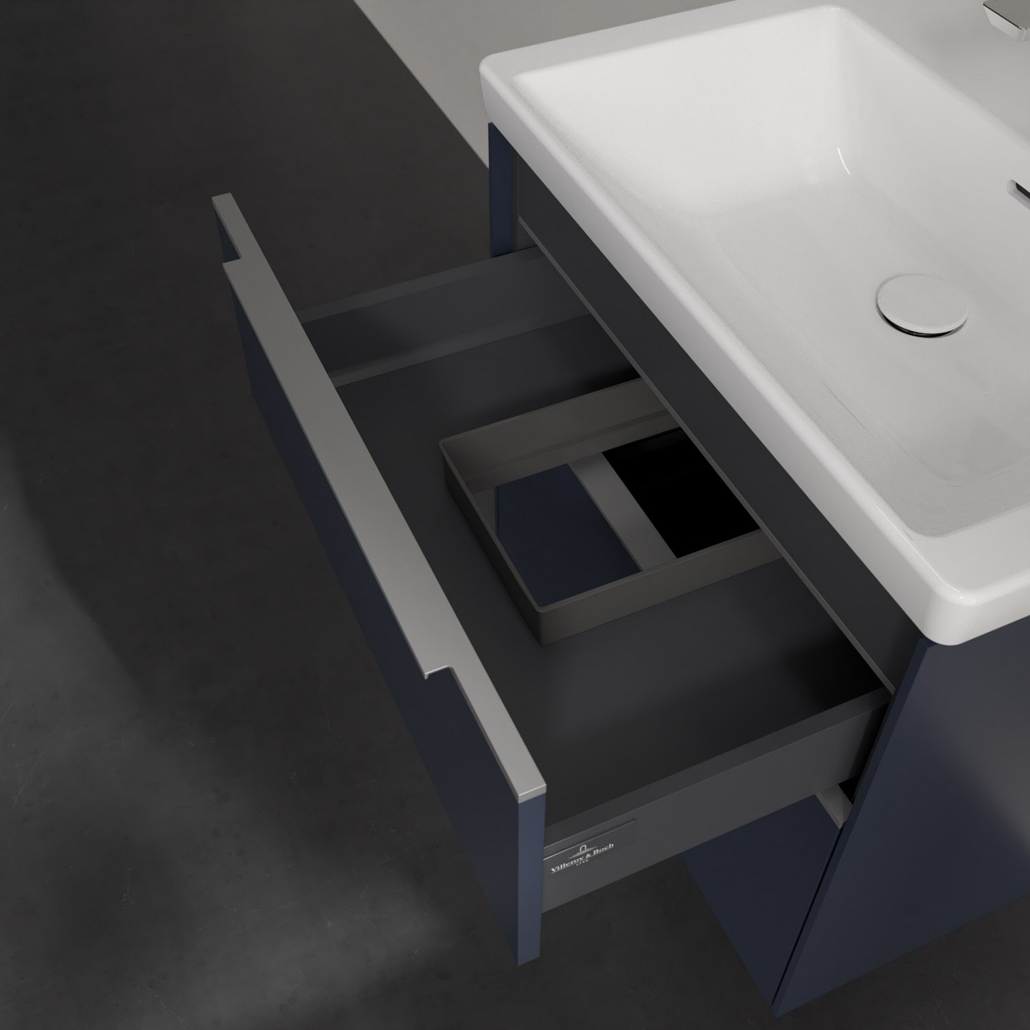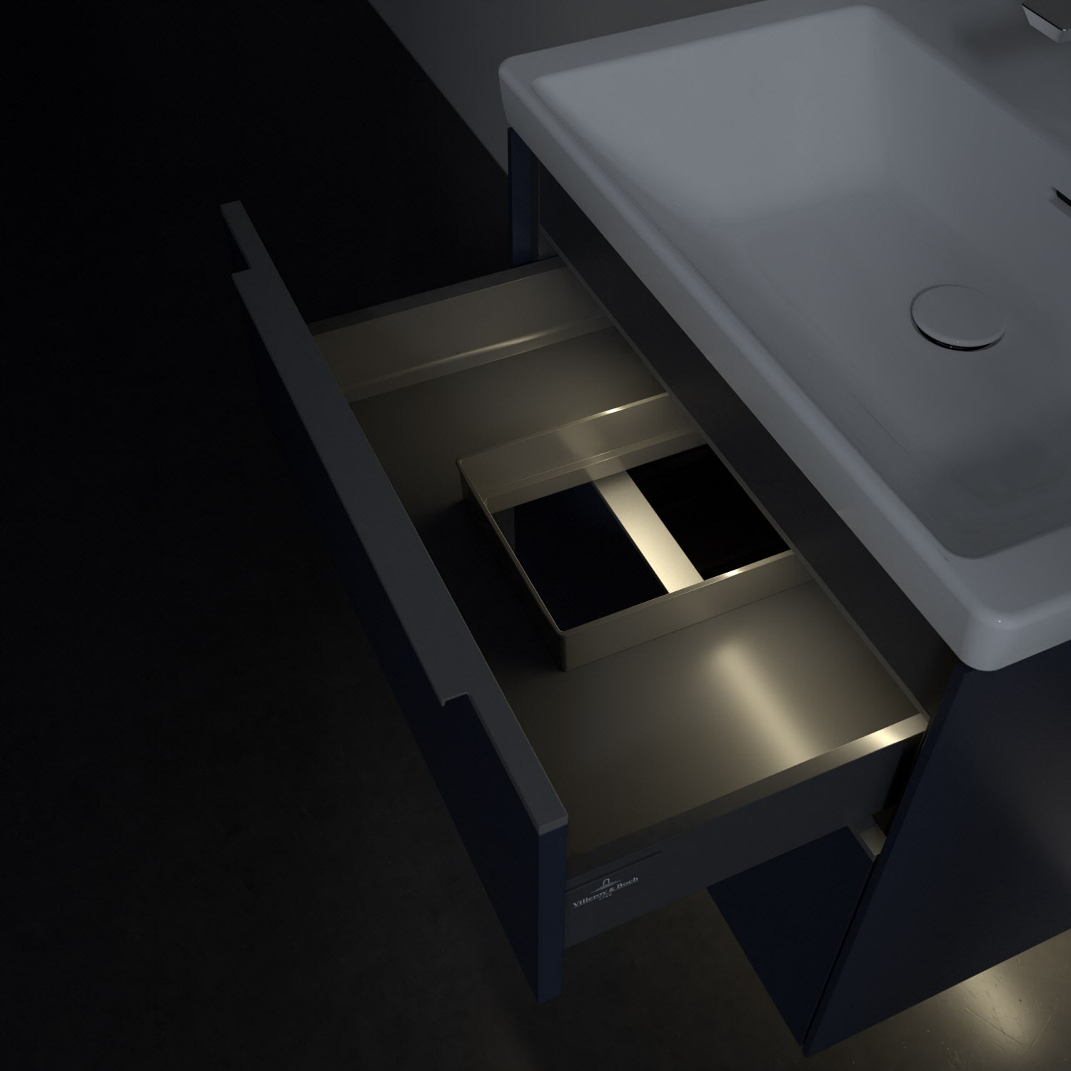 Der Waschtischunterschrank der Kollektion Subway 3.0 von Villeroy & Boch besticht durch gradliniges, zeitloses Design und großzügigen Stauraum. Front und Korpus sind mit einer hochwertigen Direktbeschichtung oder Lackierung, deren Anti-Fingerprint-Oberfläche unschönen Fingerabdrücken vorbeugt, versehen. Für eine einfache Handhabung sorgt eine dezente Griffleiste. Zwei voll ausziehbare Schubladen mit rutschhemmenden Böden, Selbsteinzug-Funktion und zwei integrierten kleinen Accessory-Boxen bieten besonders viel Platz für Pflege- und Hygieneartikel. Der obere Auszug ist mit einer funktionalen LED-Leiste ausgestattet, die mit neutralweißem Licht das Innenleben beleuchtet. Highlight ist die LED-Bodenbeleuchtung, die stimmungsvolles, sanftes Licht ins Bad bringt und nachts als Orientierungshilfe dient. Helligkeit und Lichtfarbe können über den kapazitiven Sensor eingestellt werden. Die LED-Leuchten lassen sich durch einen Fachhandwerker austauschen.