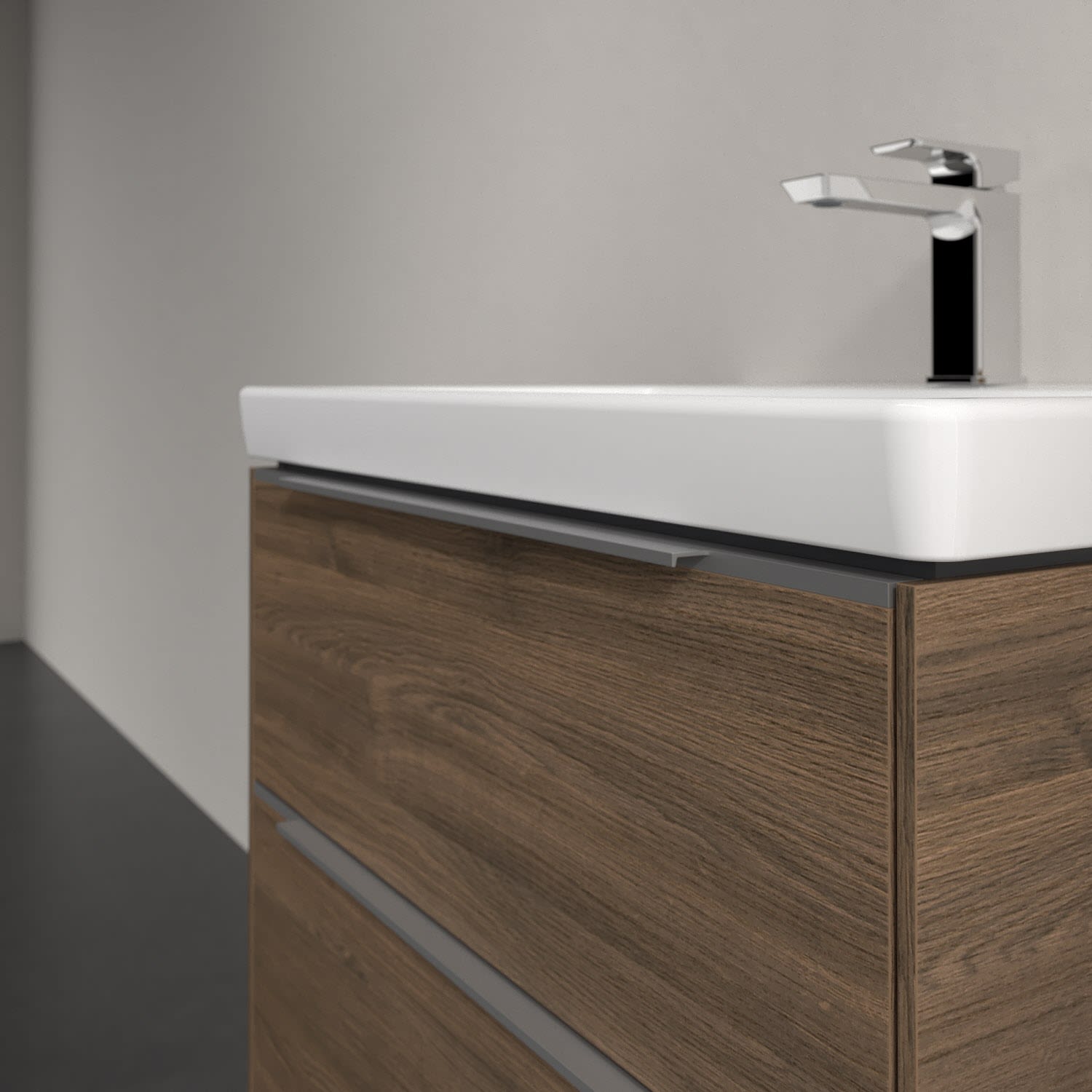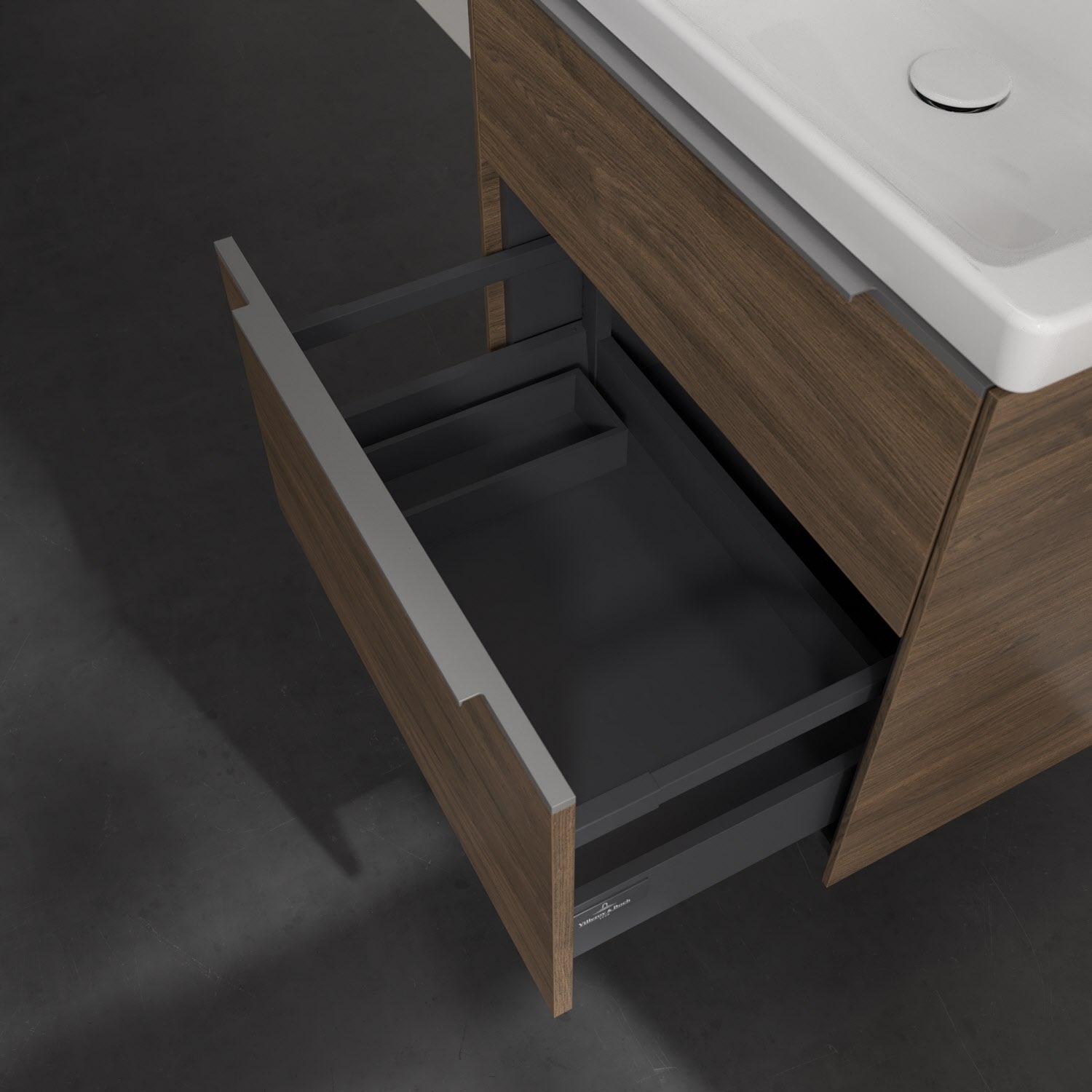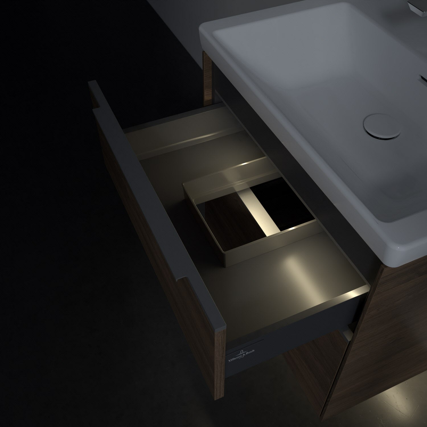 Der Waschtischunterschrank der Kollektion Subway 3.0 von Villeroy & Boch besticht durch gradliniges, zeitloses Design und großzügigen Stauraum. Front und Korpus sind mit einer hochwertigen Direktbeschichtung oder Lackierung, deren Anti-Fingerprint-Oberfläche unschönen Fingerabdrücken vorbeugt, versehen. Für eine einfache Handhabung sorgt eine dezente Griffleiste. Zwei voll ausziehbare Schubladen mit rutschhemmenden Böden, Selbsteinzug-Funktion und zwei integrierten kleinen Accessory-Boxen bieten besonders viel Platz für Pflege- und Hygieneartikel. Der obere Auszug ist mit einer funktionalen LED-Leiste ausgestattet, die mit neutralweißem Licht das Innenleben beleuchtet. Highlight ist die LED-Bodenbeleuchtung, die stimmungsvolles, sanftes Licht ins Bad bringt und nachts als Orientierungshilfe dient. Helligkeit und Lichtfarbe können über den kapazitiven Sensor eingestellt werden. Die LED-Leuchten lassen sich durch einen Fachhandwerker austauschen.