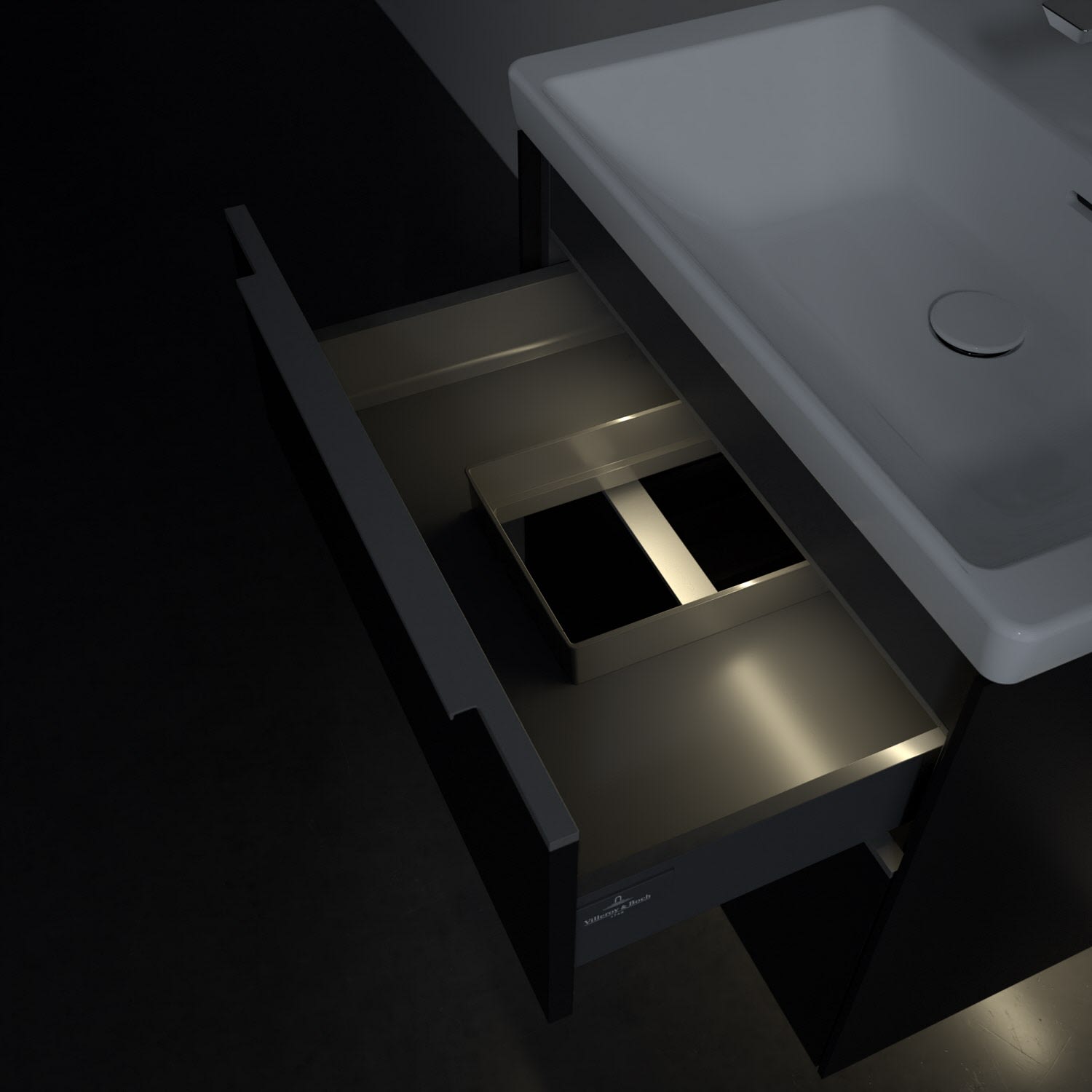 Der Waschtischunterschrank der Kollektion Subway 3.0 von Villeroy & Boch besticht durch gradliniges, zeitloses Design und großzügigen Stauraum. Front und Korpus sind mit einer hochwertigen Direktbeschichtung oder Lackierung, deren Anti-Fingerprint-Oberfläche unschönen Fingerabdrücken vorbeugt, versehen. Für eine einfache Handhabung sorgt eine dezente Griffleiste. Zwei voll ausziehbare Schubladen mit rutschhemmenden Böden, Selbsteinzug-Funktion und zwei integrierten kleinen Accessory-Boxen bieten besonders viel Platz für Pflege- und Hygieneartikel. Der obere Auszug ist mit einer funktionalen LED-Leiste ausgestattet, die mit neutralweißem Licht das Innenleben beleuchtet. Highlight ist die LED-Bodenbeleuchtung, die stimmungsvolles, sanftes Licht ins Bad bringt und nachts als Orientierungshilfe dient. Helligkeit und Lichtfarbe können über den kapazitiven Sensor eingestellt werden. Die LED-Leuchten lassen sich durch einen Fachhandwerker austauschen.