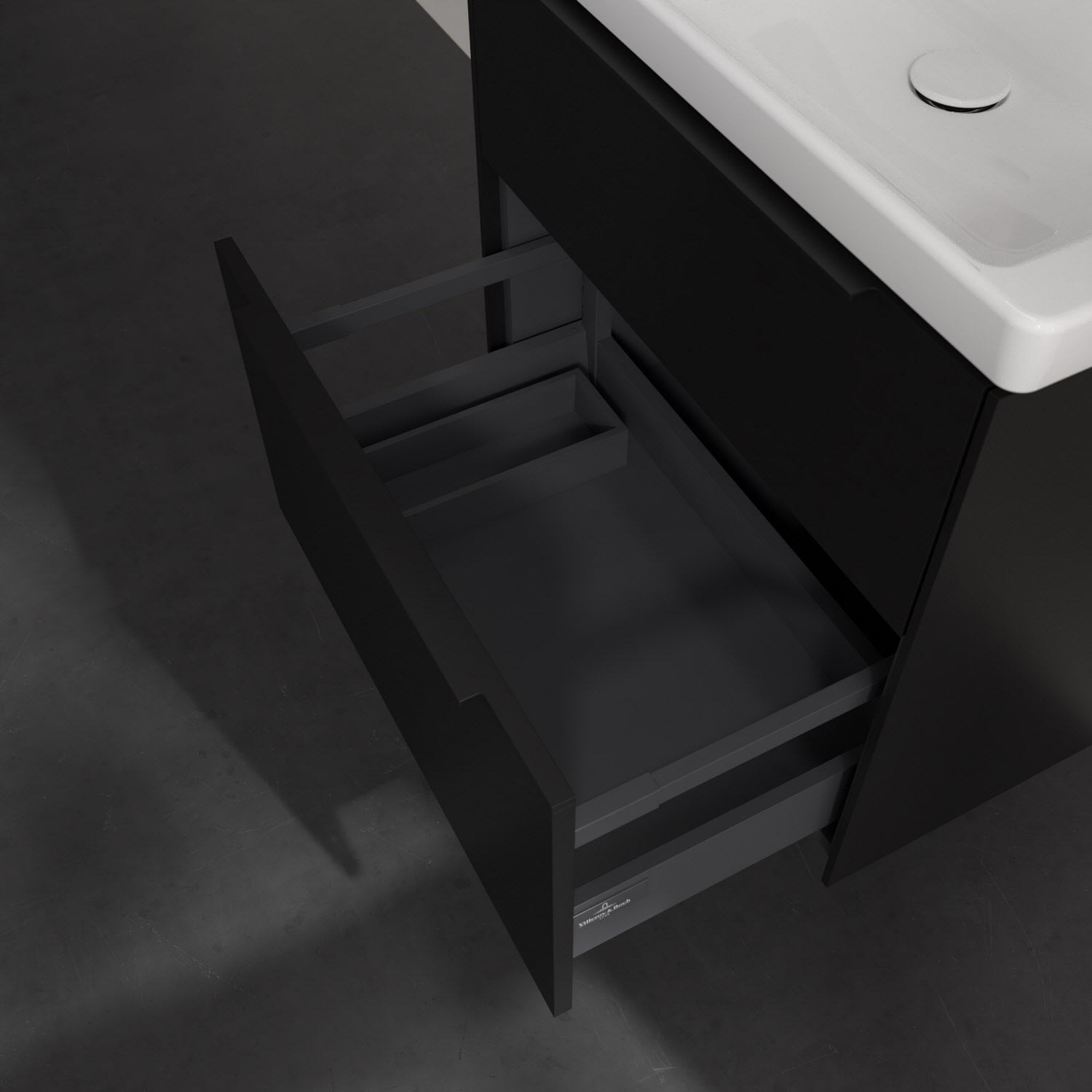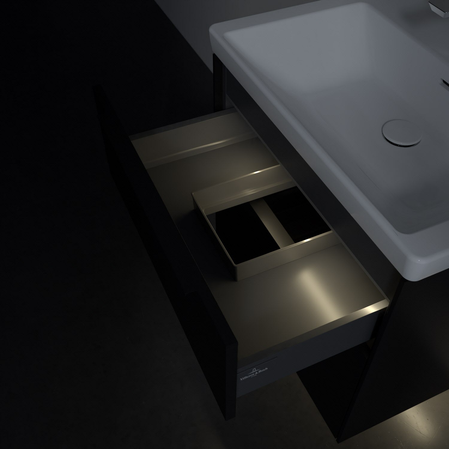 Der Waschtischunterschrank der Kollektion Subway 3.0 von Villeroy & Boch besticht durch gradliniges, zeitloses Design und großzügigen Stauraum. Front und Korpus sind mit einer hochwertigen Direktbeschichtung oder Lackierung, deren Anti-Fingerprint-Oberfläche unschönen Fingerabdrücken vorbeugt, versehen. Für eine einfache Handhabung sorgt eine dezente Griffleiste. Zwei voll ausziehbare Schubladen mit rutschhemmenden Böden, Selbsteinzug-Funktion und zwei integrierten kleinen Accessory-Boxen bieten besonders viel Platz für Pflege- und Hygieneartikel. Der obere Auszug ist mit einer funktionalen LED-Leiste ausgestattet, die mit neutralweißem Licht das Innenleben beleuchtet. Highlight ist die LED-Bodenbeleuchtung, die stimmungsvolles, sanftes Licht ins Bad bringt und nachts als Orientierungshilfe dient. Helligkeit und Lichtfarbe können über den kapazitiven Sensor eingestellt werden. Die LED-Leuchten lassen sich durch einen Fachhandwerker austauschen.