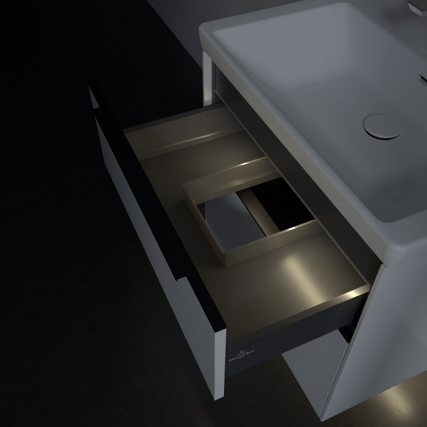 Der Waschtischunterschrank der Kollektion Subway 3.0 von Villeroy & Boch besticht durch gradliniges, zeitloses Design und großzügigen Stauraum. Front und Korpus sind mit einer hochwertigen Direktbeschichtung oder Lackierung, deren Anti-Fingerprint-Oberfläche unschönen Fingerabdrücken vorbeugt, versehen. Für eine einfache Handhabung sorgt eine dezente Griffleiste. Zwei voll ausziehbare Schubladen mit rutschhemmenden Böden, Selbsteinzug-Funktion und zwei integrierten kleinen Accessory-Boxen bieten besonders viel Platz für Pflege- und Hygieneartikel. Der obere Auszug ist mit einer funktionalen LED-Leiste ausgestattet, die mit neutralweißem Licht das Innenleben beleuchtet. Highlight ist die LED-Bodenbeleuchtung, die stimmungsvolles, sanftes Licht ins Bad bringt und nachts als Orientierungshilfe dient. Helligkeit und Lichtfarbe können über den kapazitiven Sensor eingestellt werden. Die LED-Leuchten lassen sich durch einen Fachhandwerker austauschen.