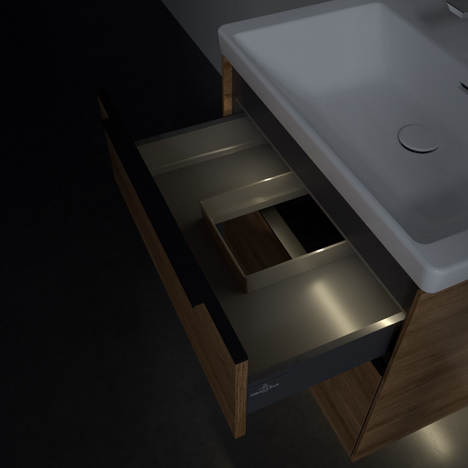 Der Waschtischunterschrank der Kollektion Subway 3.0 von Villeroy & Boch besticht durch gradliniges, zeitloses Design und großzügigen Stauraum. Front und Korpus sind mit einer hochwertigen Direktbeschichtung oder Lackierung, deren Anti-Fingerprint-Oberfläche unschönen Fingerabdrücken vorbeugt, versehen. Für eine einfache Handhabung sorgt eine dezente Griffleiste. Zwei voll ausziehbare Schubladen mit rutschhemmenden Böden, Selbsteinzug-Funktion und zwei integrierten kleinen Accessory-Boxen bieten besonders viel Platz für Pflege- und Hygieneartikel. Der obere Auszug ist mit einer funktionalen LED-Leiste ausgestattet, die mit neutralweißem Licht das Innenleben beleuchtet. Highlight ist die LED-Bodenbeleuchtung, die stimmungsvolles, sanftes Licht ins Bad bringt und nachts als Orientierungshilfe dient. Helligkeit und Lichtfarbe können über den kapazitiven Sensor eingestellt werden. Die LED-Leuchten lassen sich durch einen Fachhandwerker austauschen.