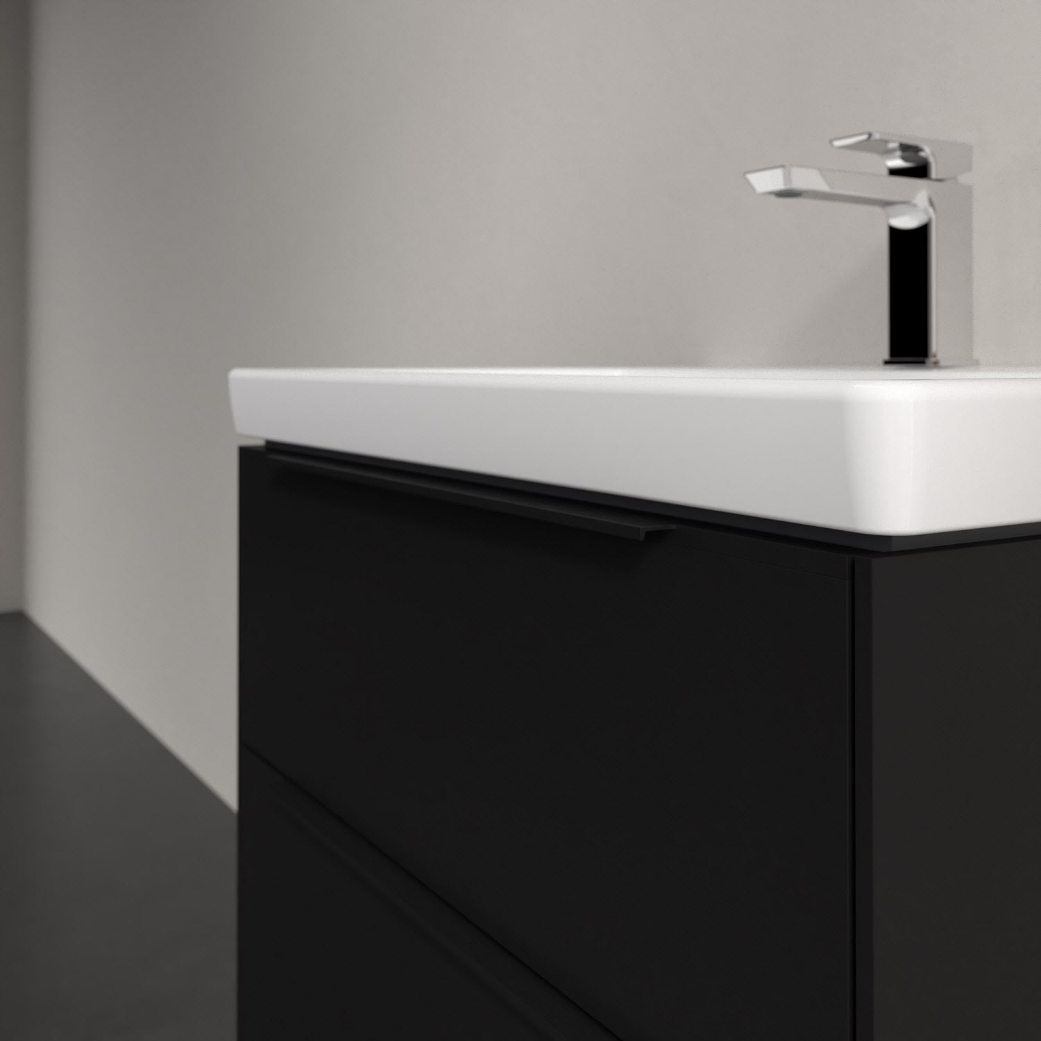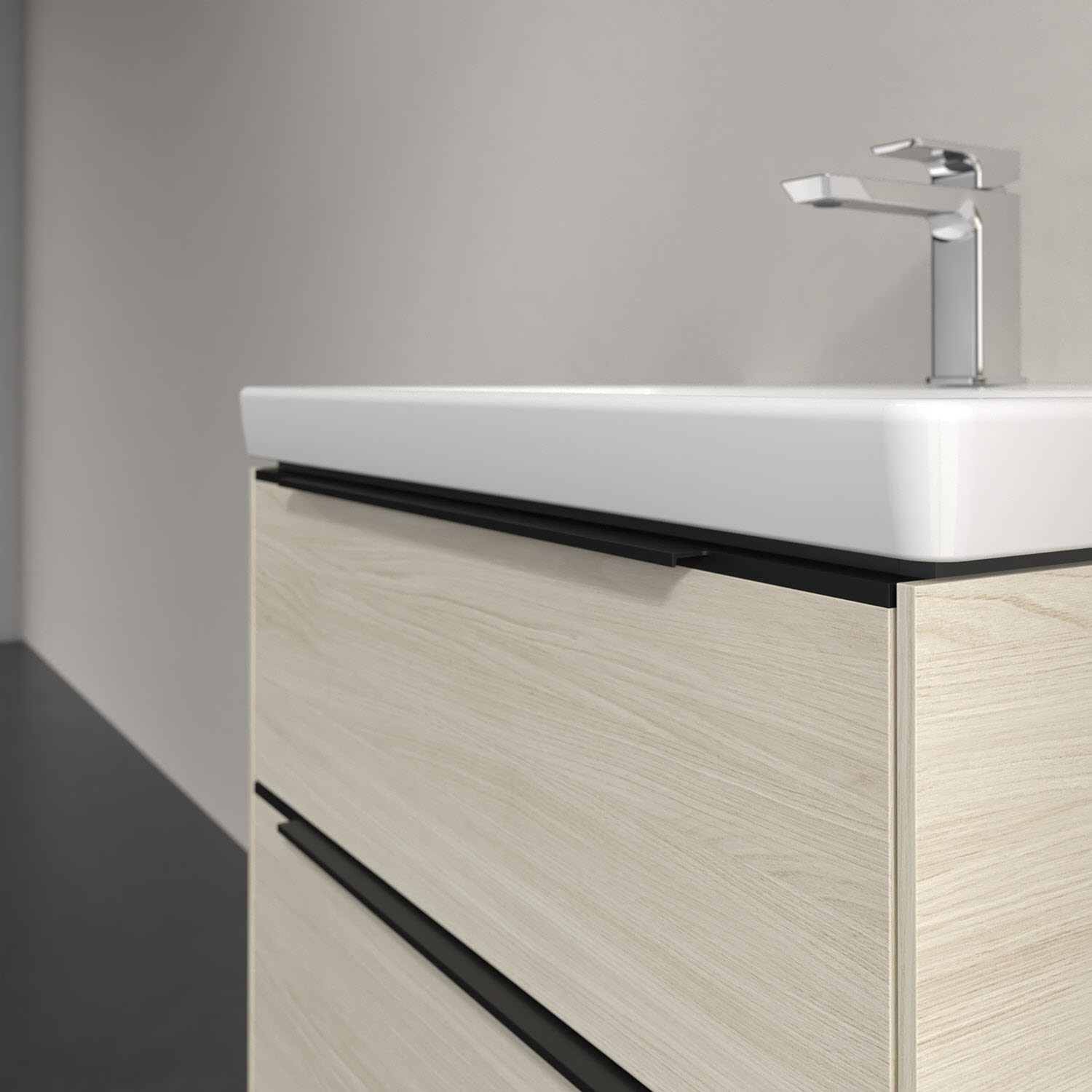 Der Waschtischunterschrank der Kollektion Subway 3.0 von Villeroy & Boch besticht durch gradliniges, zeitloses Design und großzügigen Stauraum. Front und Korpus sind mit einer hochwertigen Direktbeschichtung oder Lackierung, deren Anti-Fingerprint-Oberfläche unschönen Fingerabdrücken vorbeugt, versehen. Für eine einfache Handhabung sorgt eine dezente Griffleiste. Zwei voll ausziehbare Schubladen mit rutschhemmenden Böden, Selbsteinzug-Funktion und zwei integrierten kleinen Accessory-Boxen bieten besonders viel Platz für Pflege- und Hygieneartikel. Der obere Auszug ist mit einer funktionalen LED-Leiste ausgestattet, die mit neutralweißem Licht das Innenleben beleuchtet. Highlight ist die LED-Bodenbeleuchtung, die stimmungsvolles, sanftes Licht ins Bad bringt und nachts als Orientierungshilfe dient. Helligkeit und Lichtfarbe können über den kapazitiven Sensor eingestellt werden. Die LED-Leuchten lassen sich durch einen Fachhandwerker austauschen.