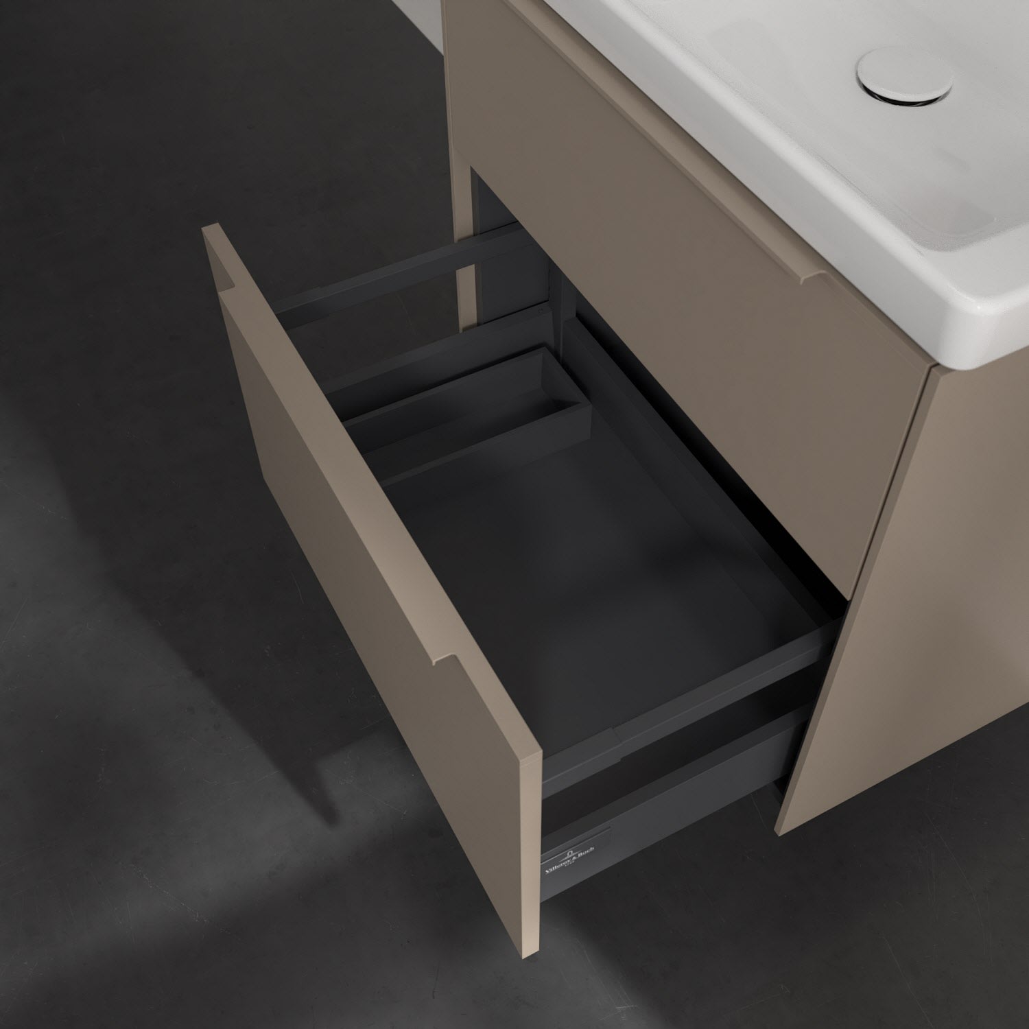 Der Waschtischunterschrank der Kollektion Subway 3.0 von Villeroy & Boch besticht durch gradliniges, zeitloses Design und großzügigen Stauraum. Front und Korpus sind mit einer hochwertigen Direktbeschichtung oder Lackierung, deren Anti-Fingerprint-Oberfläche unschönen Fingerabdrücken vorbeugt, versehen. Für eine einfache Handhabung sorgt eine dezente Griffleiste. Zwei voll ausziehbare Schubladen mit rutschhemmenden Böden, Selbsteinzug-Funktion und zwei integrierten kleinen Accessory-Boxen bieten besonders viel Platz für Pflege- und Hygieneartikel. Der obere Auszug ist mit einer funktionalen LED-Leiste ausgestattet, die mit neutralweißem Licht das Innenleben beleuchtet. Highlight ist die LED-Bodenbeleuchtung, die stimmungsvolles, sanftes Licht ins Bad bringt und nachts als Orientierungshilfe dient. Helligkeit und Lichtfarbe können über den kapazitiven Sensor eingestellt werden. Die LED-Leuchten lassen sich durch einen Fachhandwerker austauschen.