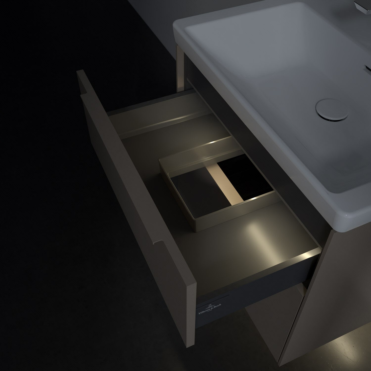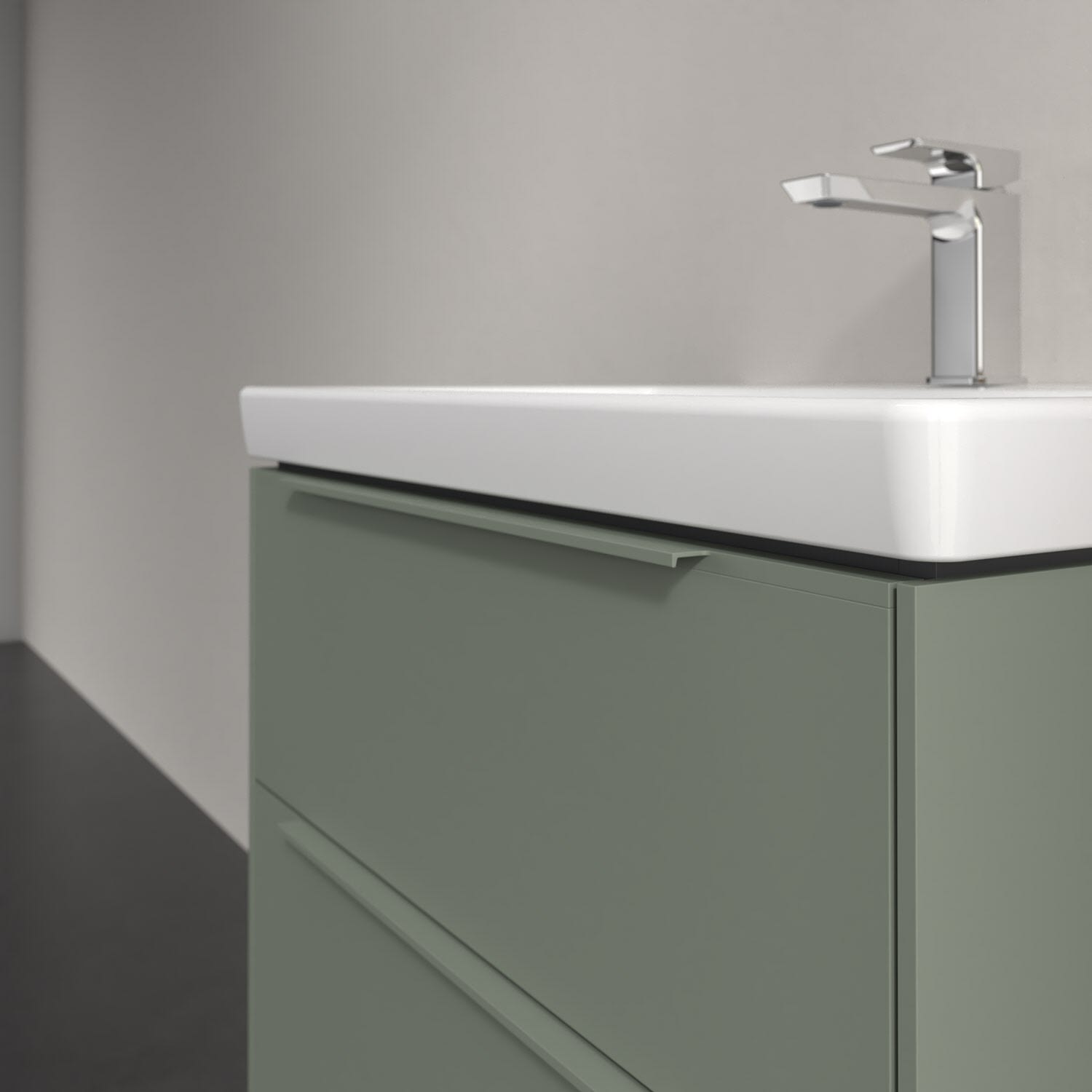 Der Waschtischunterschrank der Kollektion Subway 3.0 von Villeroy & Boch besticht durch gradliniges, zeitloses Design und großzügigen Stauraum. Front und Korpus sind mit einer hochwertigen Direktbeschichtung oder Lackierung, deren Anti-Fingerprint-Oberfläche unschönen Fingerabdrücken vorbeugt, versehen. Für eine einfache Handhabung sorgt eine dezente Griffleiste. Zwei voll ausziehbare Schubladen mit rutschhemmenden Böden, Selbsteinzug-Funktion und zwei integrierten kleinen Accessory-Boxen bieten besonders viel Platz für Pflege- und Hygieneartikel. Der obere Auszug ist mit einer funktionalen LED-Leiste ausgestattet, die mit neutralweißem Licht das Innenleben beleuchtet. Highlight ist die LED-Bodenbeleuchtung, die stimmungsvolles, sanftes Licht ins Bad bringt und nachts als Orientierungshilfe dient. Helligkeit und Lichtfarbe können über den kapazitiven Sensor eingestellt werden. Die LED-Leuchten lassen sich durch einen Fachhandwerker austauschen.