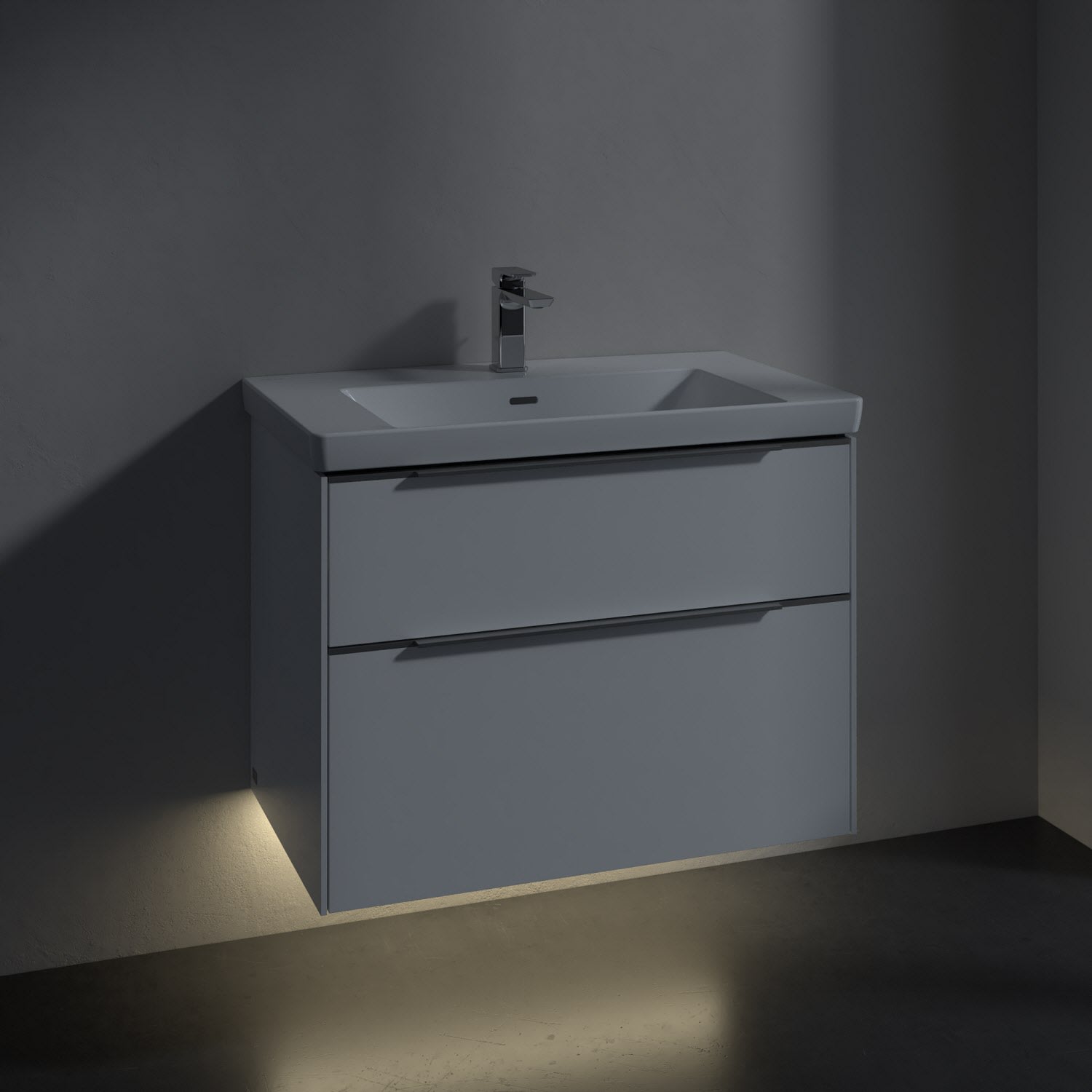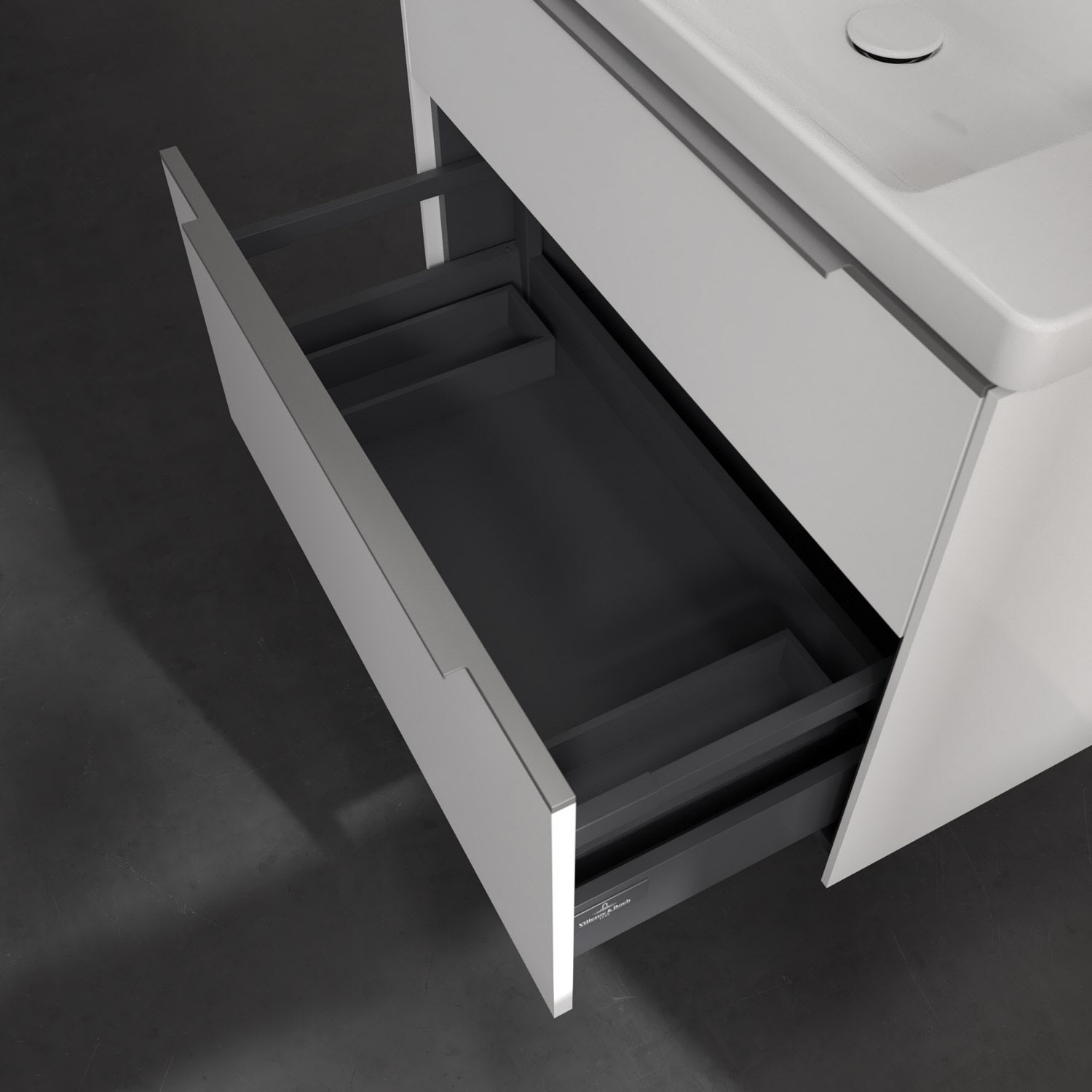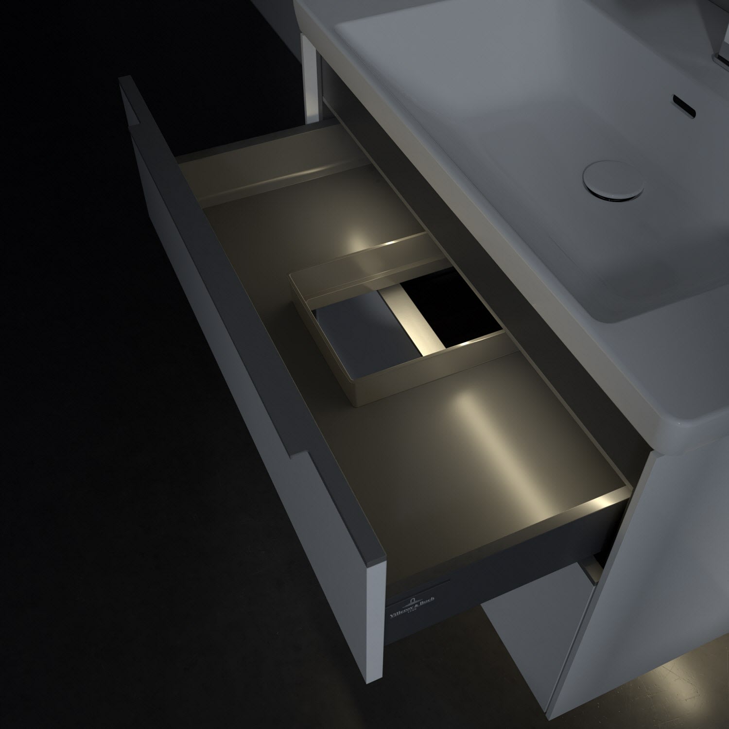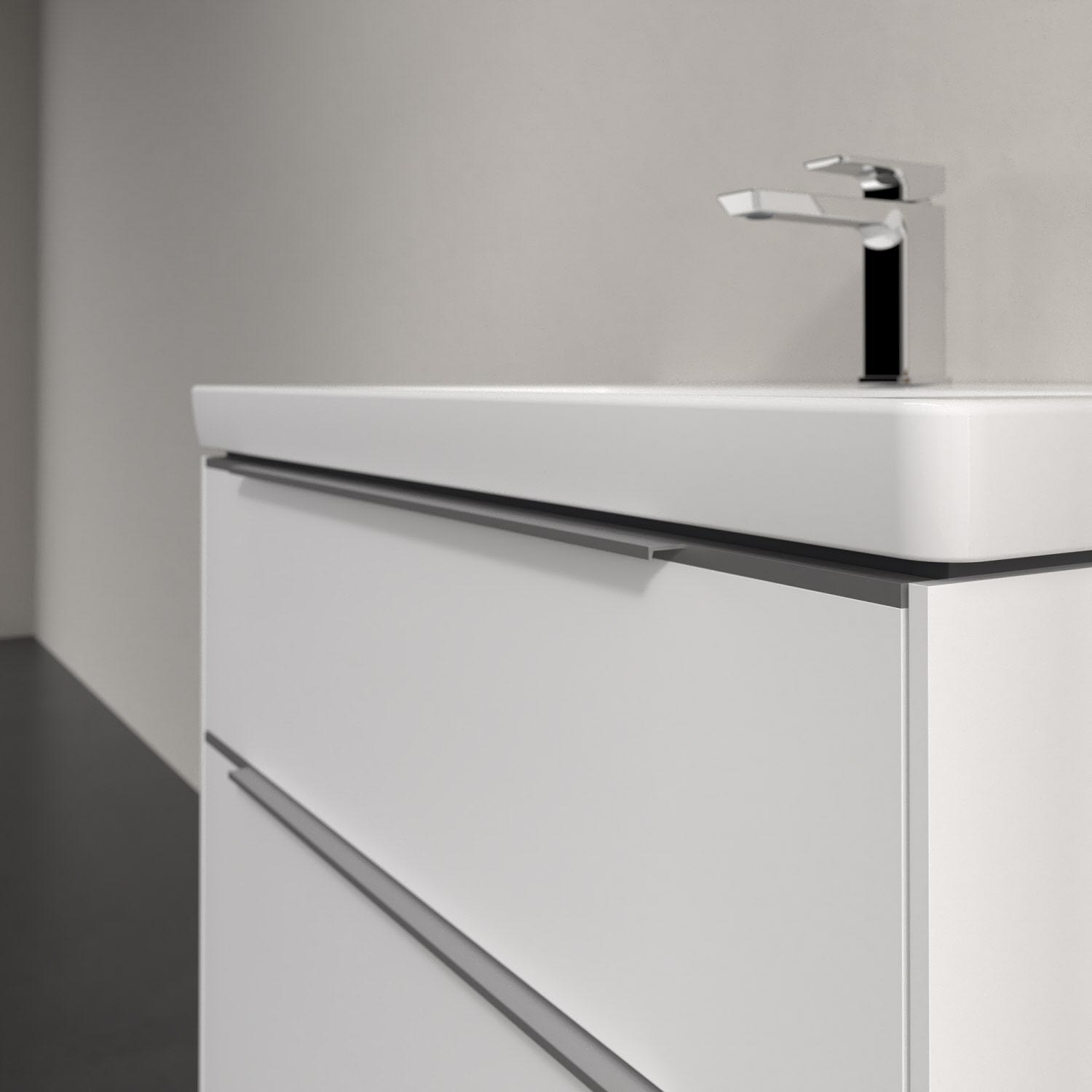 Der Waschtischunterschrank der Kollektion Subway 3.0 von Villeroy & Boch besticht durch gradliniges, zeitloses Design und großzügigen Stauraum. Front und Korpus sind mit einer hochwertigen Direktbeschichtung oder Lackierung, deren Anti-Fingerprint-Oberfläche unschönen Fingerabdrücken vorbeugt, versehen. Für eine einfache Handhabung sorgt eine dezente Griffleiste. Zwei voll ausziehbare Schubladen mit rutschhemmenden Böden, Selbsteinzug-Funktion und zwei integrierten kleinen Accessory-Boxen bieten besonders viel Platz für Pflege- und Hygieneartikel. Integriert ist eine funktionale LED-Leiste, die mit neutralweißem Licht das Innenleben beleuchtet. Highlight ist die LED-Bodenbeleuchtung, die stimmungsvolles, sanftes Licht ins Bad bringt und nachts als Orientierungshilfe dient. Helligkeit und Lichtfarbe können über den kapazitiven Sensor eingestellt werden. Die LED-Leuchten lassen sich durch einen Fachhandwerker austauschen.