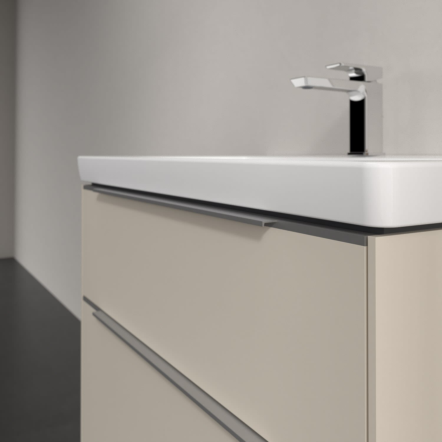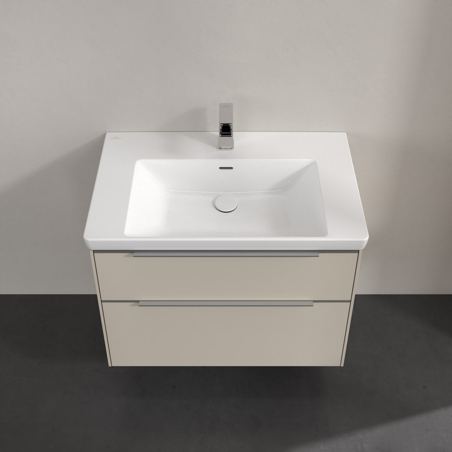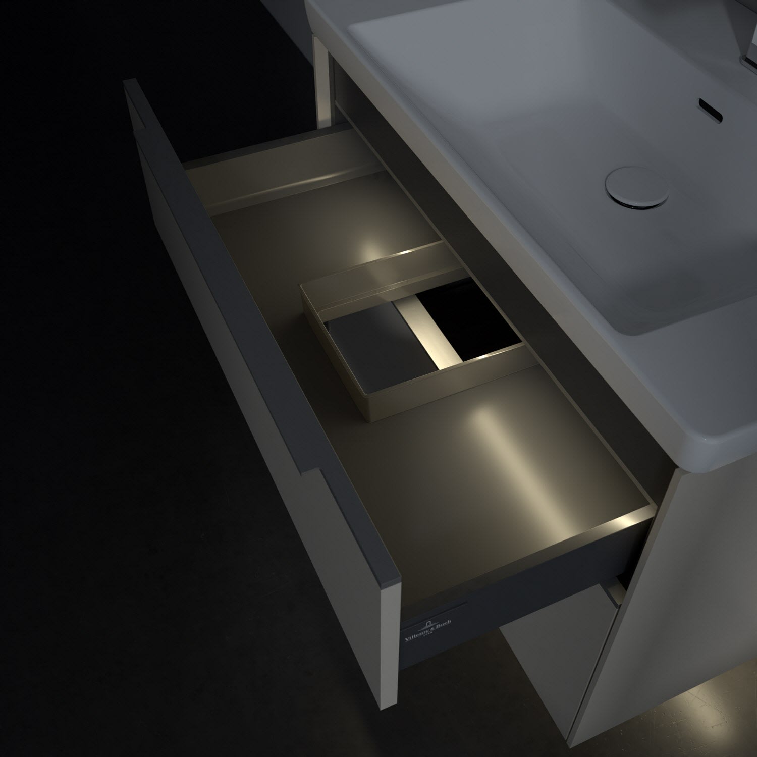 Der Waschtischunterschrank der Kollektion Subway 3.0 von Villeroy & Boch besticht durch gradliniges, zeitloses Design und großzügigen Stauraum. Front und Korpus sind mit einer hochwertigen Direktbeschichtung oder Lackierung, deren Anti-Fingerprint-Oberfläche unschönen Fingerabdrücken vorbeugt, versehen. Für eine einfache Handhabung sorgt eine dezente Griffleiste. Zwei voll ausziehbare Schubladen mit rutschhemmenden Böden, Selbsteinzug-Funktion und zwei integrierten kleinen Accessory-Boxen bieten besonders viel Platz für Pflege- und Hygieneartikel. Integriert ist eine funktionale LED-Leiste, die mit neutralweißem Licht das Innenleben beleuchtet. Highlight ist die LED-Bodenbeleuchtung, die stimmungsvolles, sanftes Licht ins Bad bringt und nachts als Orientierungshilfe dient. Helligkeit und Lichtfarbe können über den kapazitiven Sensor eingestellt werden. Die LED-Leuchten lassen sich durch einen Fachhandwerker austauschen.