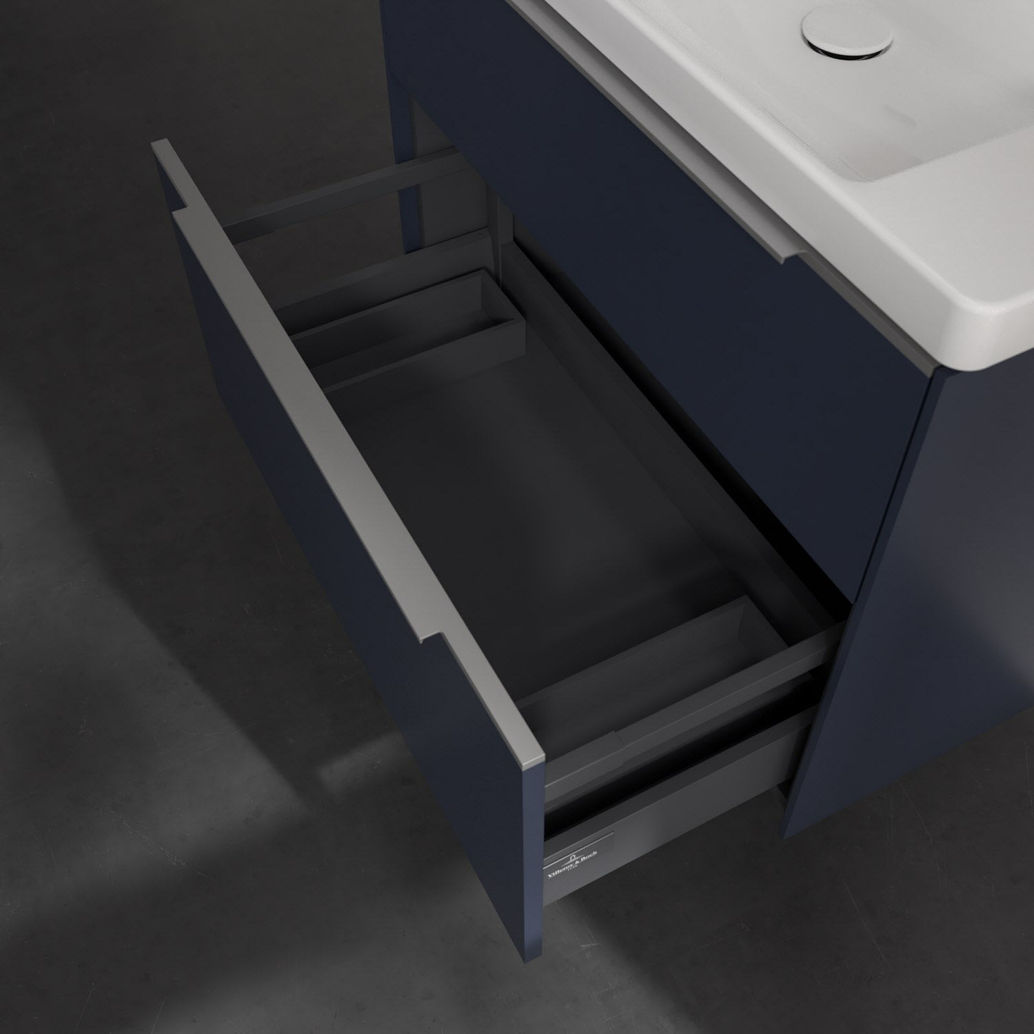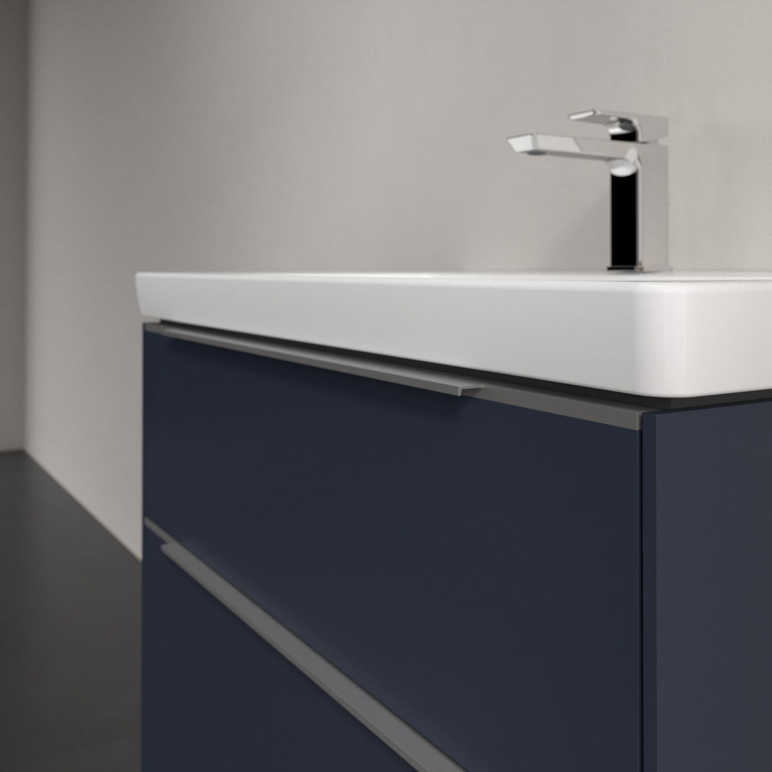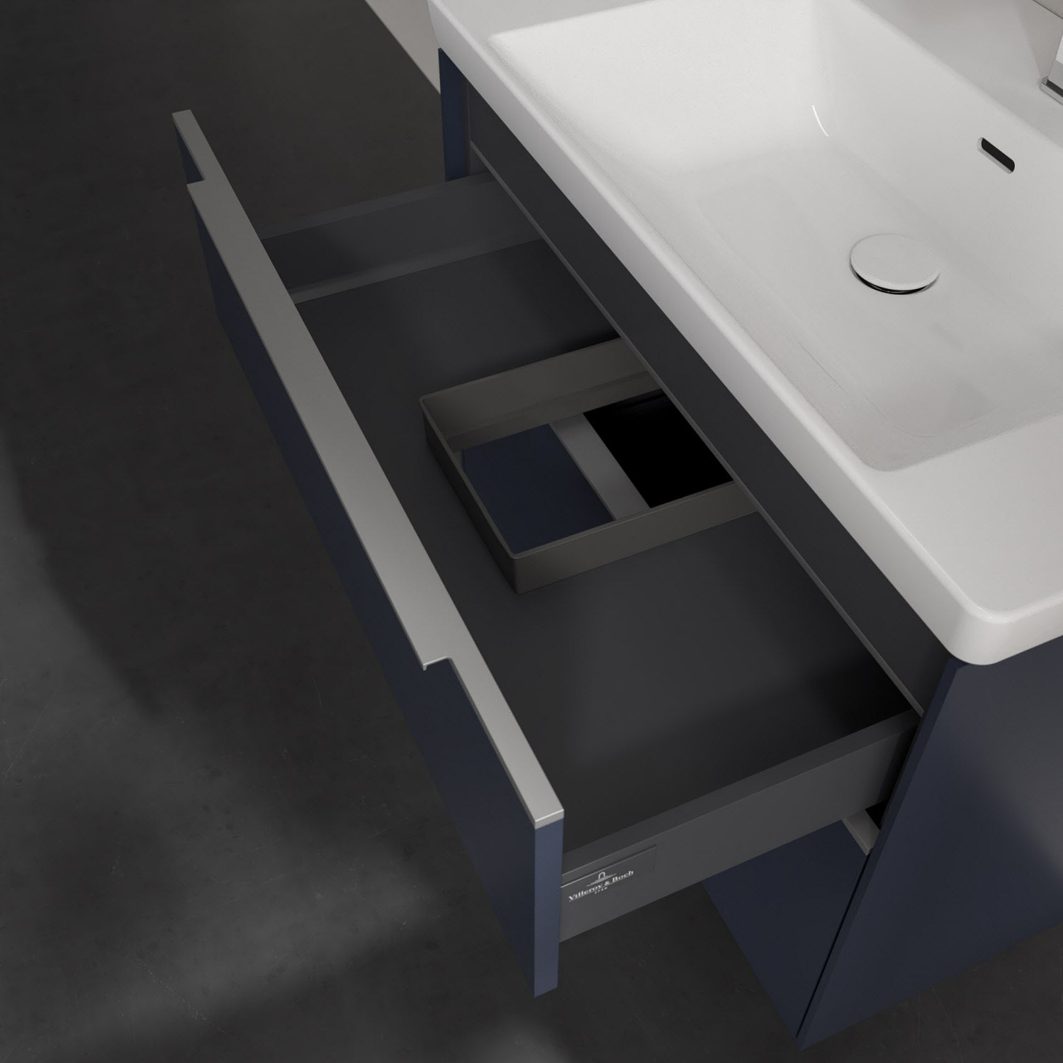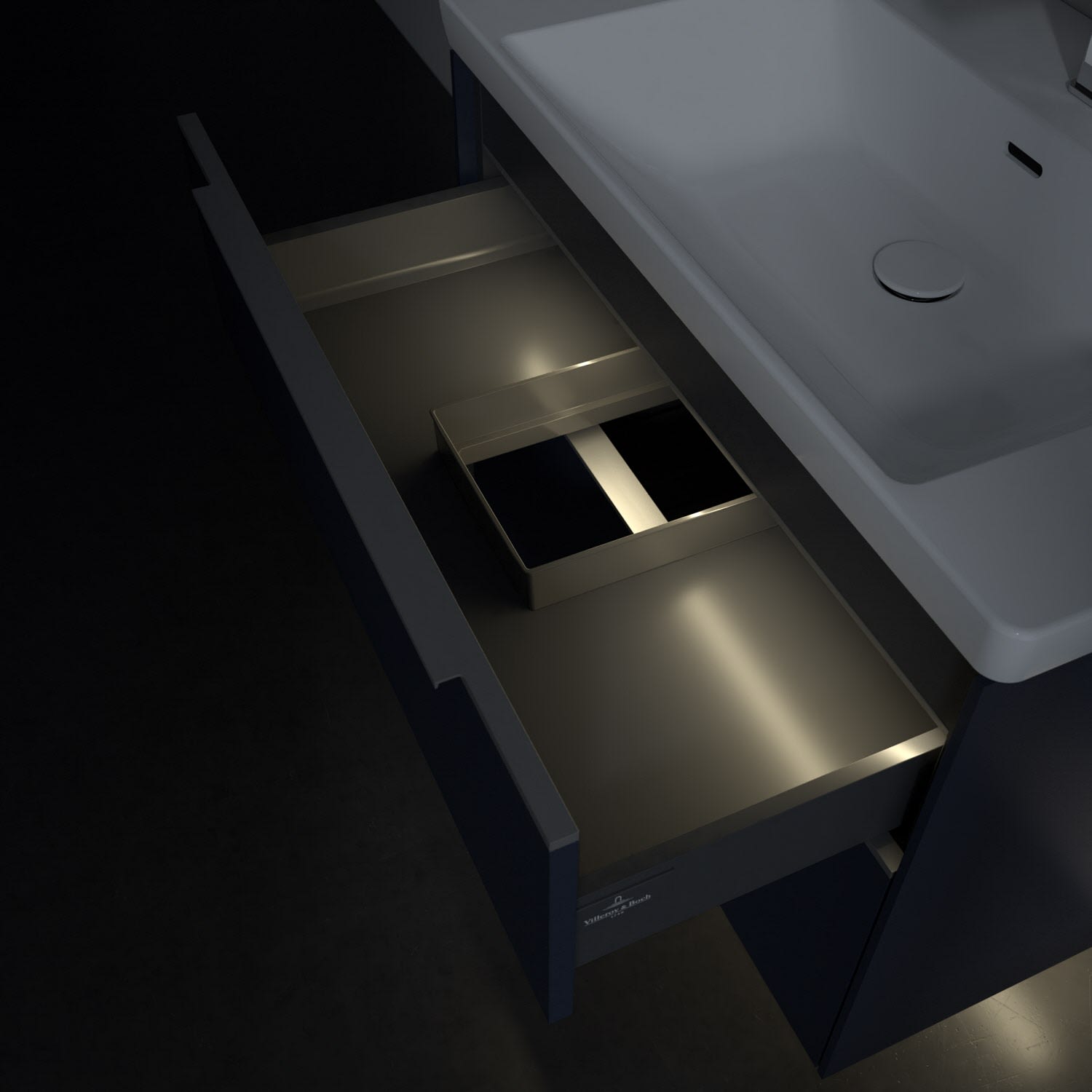 Der Waschtischunterschrank der Kollektion Subway 3.0 von Villeroy & Boch besticht durch gradliniges, zeitloses Design und großzügigen Stauraum. Front und Korpus sind mit einer hochwertigen Direktbeschichtung oder Lackierung, deren Anti-Fingerprint-Oberfläche unschönen Fingerabdrücken vorbeugt, versehen. Für eine einfache Handhabung sorgt eine dezente Griffleiste. Zwei voll ausziehbare Schubladen mit rutschhemmenden Böden, Selbsteinzug-Funktion und zwei integrierten kleinen Accessory-Boxen bieten besonders viel Platz für Pflege- und Hygieneartikel. Integriert ist eine funktionale LED-Leiste, die mit neutralweißem Licht das Innenleben beleuchtet. Highlight ist die LED-Bodenbeleuchtung, die stimmungsvolles, sanftes Licht ins Bad bringt und nachts als Orientierungshilfe dient. Helligkeit und Lichtfarbe können über den kapazitiven Sensor eingestellt werden. Die LED-Leuchten lassen sich durch einen Fachhandwerker austauschen.