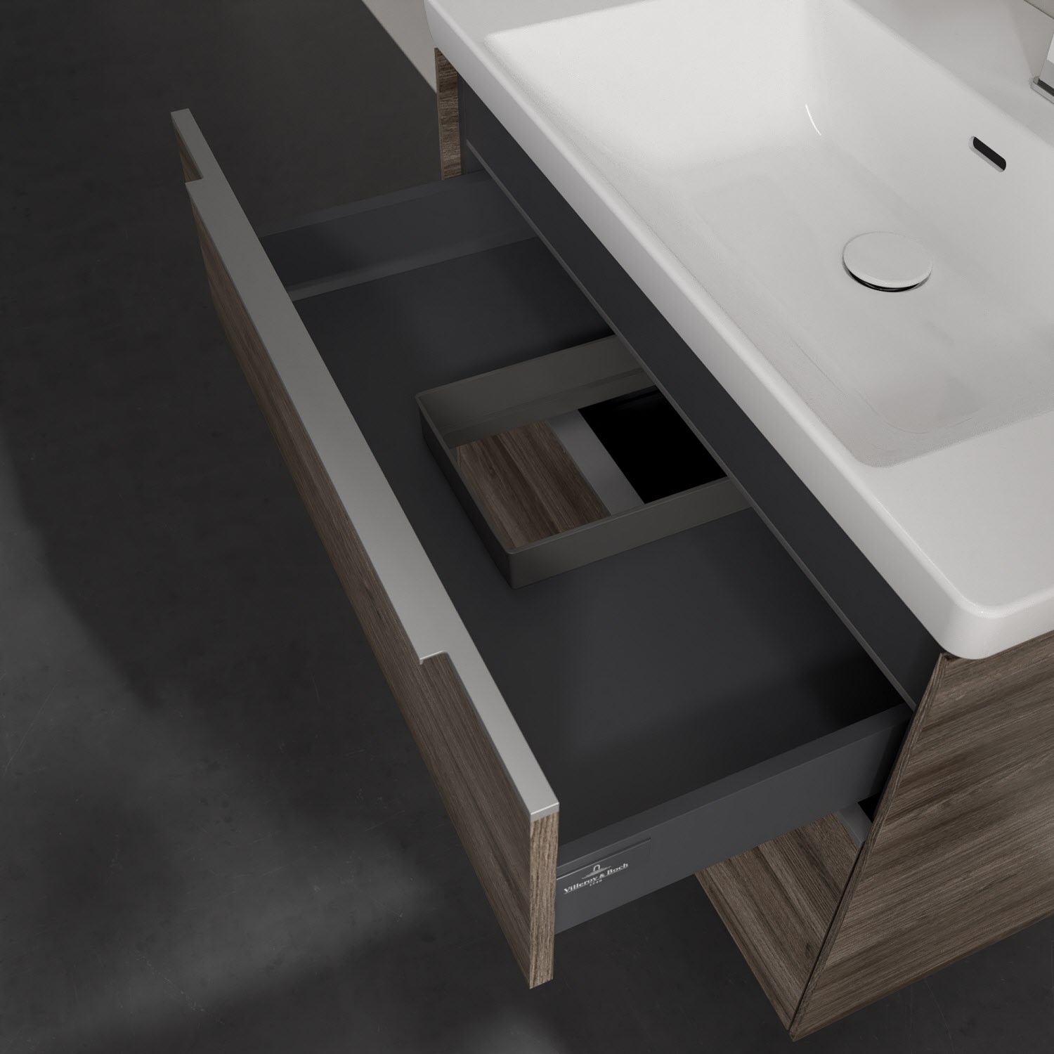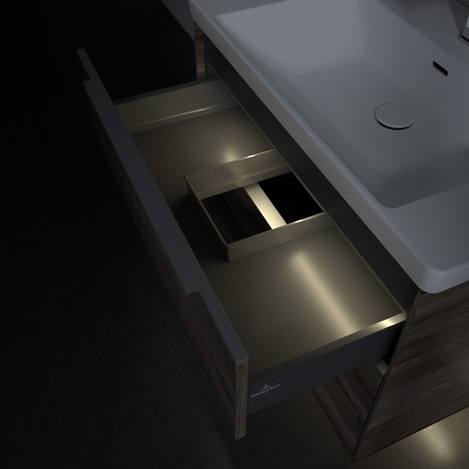 Der Waschtischunterschrank der Kollektion Subway 3.0 von Villeroy & Boch besticht durch gradliniges, zeitloses Design und großzügigen Stauraum. Front und Korpus sind mit einer hochwertigen Direktbeschichtung oder Lackierung, deren Anti-Fingerprint-Oberfläche unschönen Fingerabdrücken vorbeugt, versehen. Für eine einfache Handhabung sorgt eine dezente Griffleiste. Zwei voll ausziehbare Schubladen mit rutschhemmenden Böden, Selbsteinzug-Funktion und zwei integrierten kleinen Accessory-Boxen bieten besonders viel Platz für Pflege- und Hygieneartikel. Integriert ist eine funktionale LED-Leiste, die mit neutralweißem Licht das Innenleben beleuchtet. Highlight ist die LED-Bodenbeleuchtung, die stimmungsvolles, sanftes Licht ins Bad bringt und nachts als Orientierungshilfe dient. Helligkeit und Lichtfarbe können über den kapazitiven Sensor eingestellt werden. Die LED-Leuchten lassen sich durch einen Fachhandwerker austauschen.