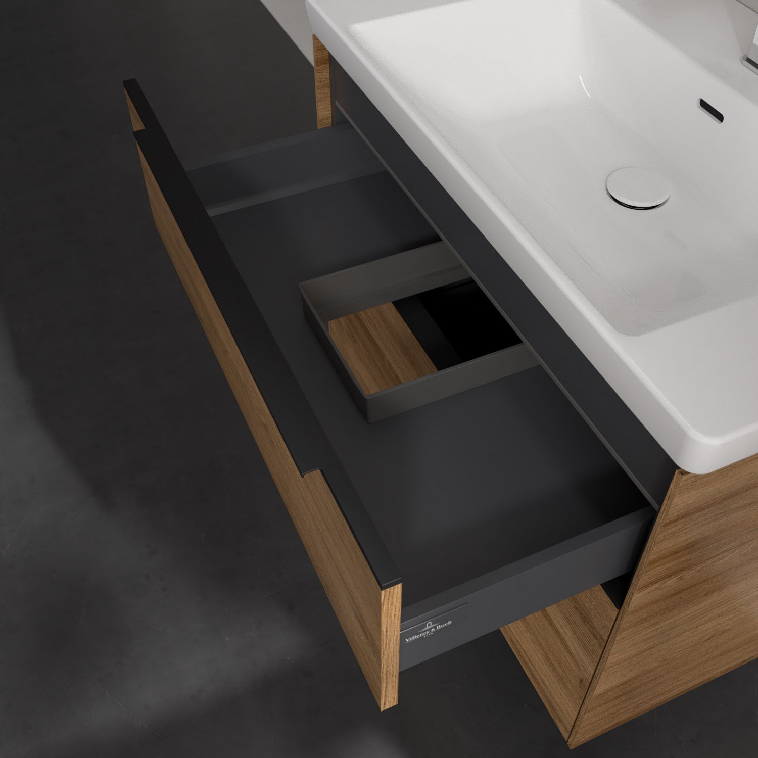 Der Waschtischunterschrank der Kollektion Subway 3.0 von Villeroy & Boch besticht durch gradliniges, zeitloses Design und großzügigen Stauraum. Front und Korpus sind mit einer hochwertigen Direktbeschichtung oder Lackierung, deren Anti-Fingerprint-Oberfläche unschönen Fingerabdrücken vorbeugt, versehen. Für eine einfache Handhabung sorgt eine dezente Griffleiste. Zwei voll ausziehbare Schubladen mit rutschhemmenden Böden, Selbsteinzug-Funktion und zwei integrierten kleinen Accessory-Boxen bieten besonders viel Platz für Pflege- und Hygieneartikel. Integriert ist eine funktionale LED-Leiste, die mit neutralweißem Licht das Innenleben beleuchtet. Highlight ist die LED-Bodenbeleuchtung, die stimmungsvolles, sanftes Licht ins Bad bringt und nachts als Orientierungshilfe dient. Helligkeit und Lichtfarbe können über den kapazitiven Sensor eingestellt werden. Die LED-Leuchten lassen sich durch einen Fachhandwerker austauschen.