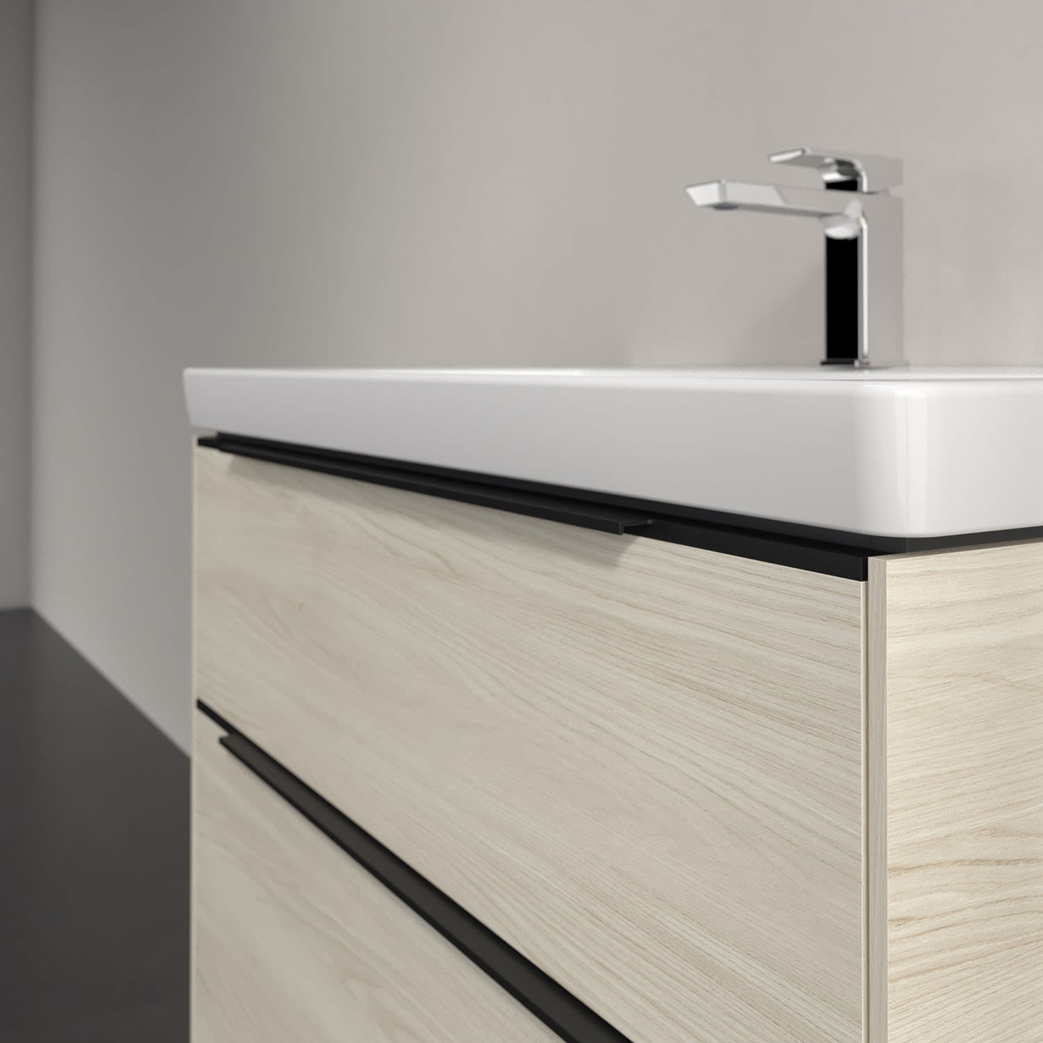Der Waschtischunterschrank der Kollektion Subway 3.0 von Villeroy & Boch besticht durch gradliniges, zeitloses Design und großzügigen Stauraum. Front und Korpus sind mit einer hochwertigen Direktbeschichtung oder Lackierung, deren Anti-Fingerprint-Oberfläche unschönen Fingerabdrücken vorbeugt, versehen. Für eine einfache Handhabung sorgt eine dezente Griffleiste. Zwei voll ausziehbare Schubladen mit rutschhemmenden Böden, Selbsteinzug-Funktion und zwei integrierten kleinen Accessory-Boxen bieten besonders viel Platz für Pflege- und Hygieneartikel. Integriert ist eine funktionale LED-Leiste, die mit neutralweißem Licht das Innenleben beleuchtet. Highlight ist die LED-Bodenbeleuchtung, die stimmungsvolles, sanftes Licht ins Bad bringt und nachts als Orientierungshilfe dient. Helligkeit und Lichtfarbe können über den kapazitiven Sensor eingestellt werden. Die LED-Leuchten lassen sich durch einen Fachhandwerker austauschen.