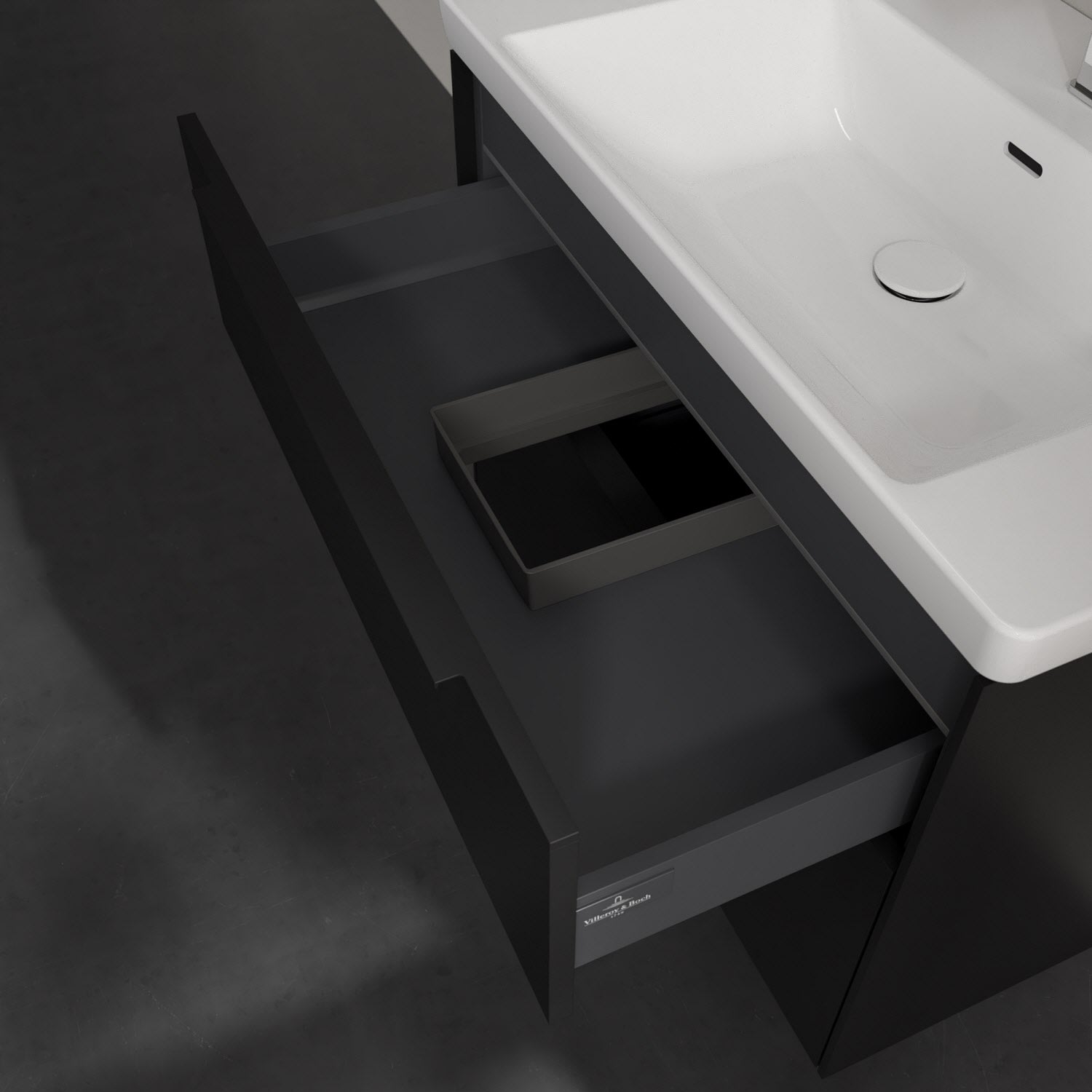 Der Waschtischunterschrank der Kollektion Subway 3.0 von Villeroy & Boch besticht durch gradliniges, zeitloses Design und großzügigen Stauraum. Front und Korpus sind mit einer hochwertigen Direktbeschichtung oder Lackierung, deren Anti-Fingerprint-Oberfläche unschönen Fingerabdrücken vorbeugt, versehen. Für eine einfache Handhabung sorgt eine dezente Griffleiste. Zwei voll ausziehbare Schubladen mit rutschhemmenden Böden, Selbsteinzug-Funktion und zwei integrierten kleinen Accessory-Boxen bieten besonders viel Platz für Pflege- und Hygieneartikel. Integriert ist eine funktionale LED-Leiste, die mit neutralweißem Licht das Innenleben beleuchtet. Highlight ist die LED-Bodenbeleuchtung, die stimmungsvolles, sanftes Licht ins Bad bringt und nachts als Orientierungshilfe dient. Helligkeit und Lichtfarbe können über den kapazitiven Sensor eingestellt werden. Die LED-Leuchten lassen sich durch einen Fachhandwerker austauschen.