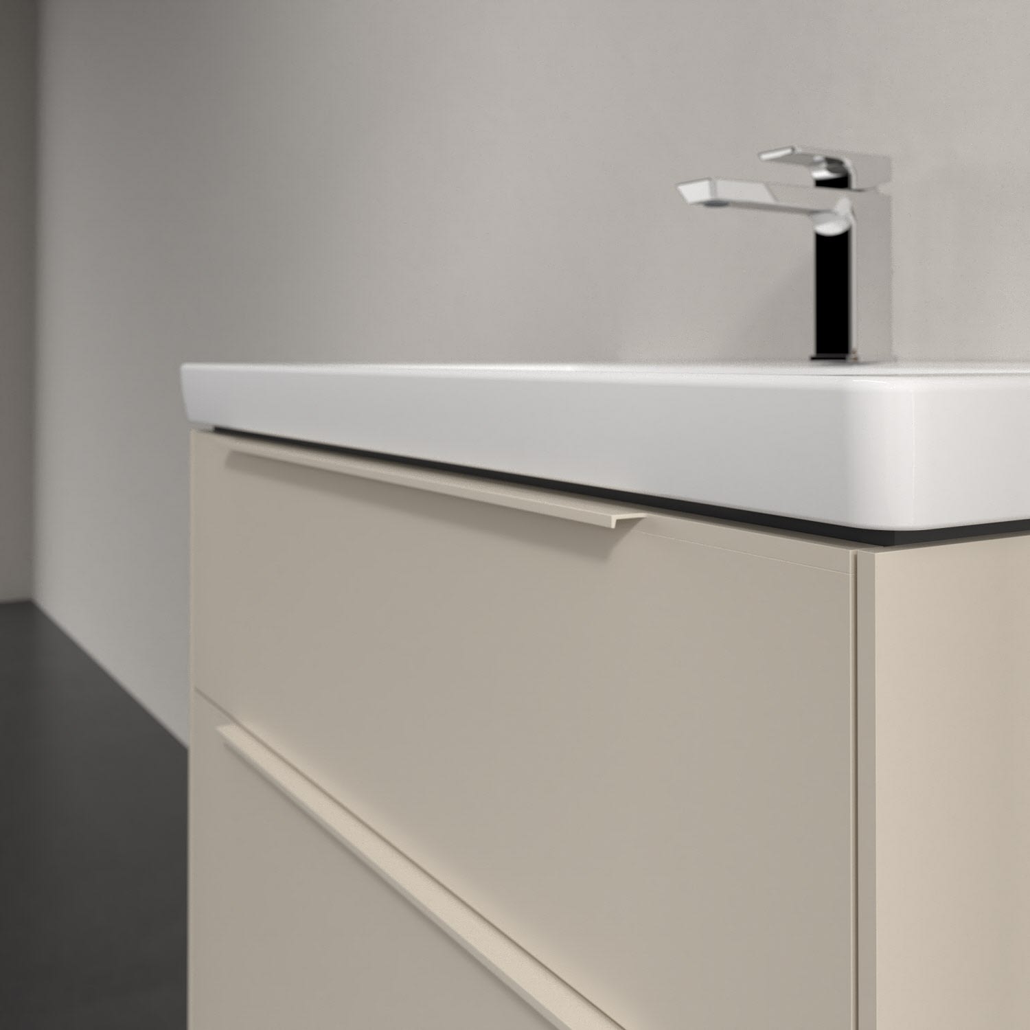 Der Waschtischunterschrank der Kollektion Subway 3.0 von Villeroy & Boch besticht durch gradliniges, zeitloses Design und großzügigen Stauraum. Front und Korpus sind mit einer hochwertigen Direktbeschichtung oder Lackierung, deren Anti-Fingerprint-Oberfläche unschönen Fingerabdrücken vorbeugt, versehen. Für eine einfache Handhabung sorgt eine dezente Griffleiste. Zwei voll ausziehbare Schubladen mit rutschhemmenden Böden, Selbsteinzug-Funktion und zwei integrierten kleinen Accessory-Boxen bieten besonders viel Platz für Pflege- und Hygieneartikel. Integriert ist eine funktionale LED-Leiste, die mit neutralweißem Licht das Innenleben beleuchtet. Highlight ist die LED-Bodenbeleuchtung, die stimmungsvolles, sanftes Licht ins Bad bringt und nachts als Orientierungshilfe dient. Helligkeit und Lichtfarbe können über den kapazitiven Sensor eingestellt werden. Die LED-Leuchten lassen sich durch einen Fachhandwerker austauschen.