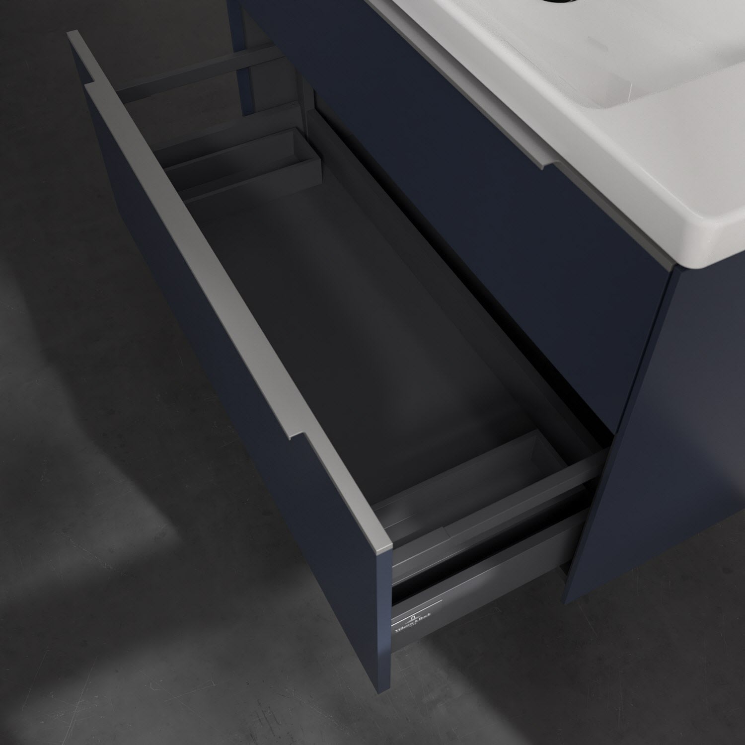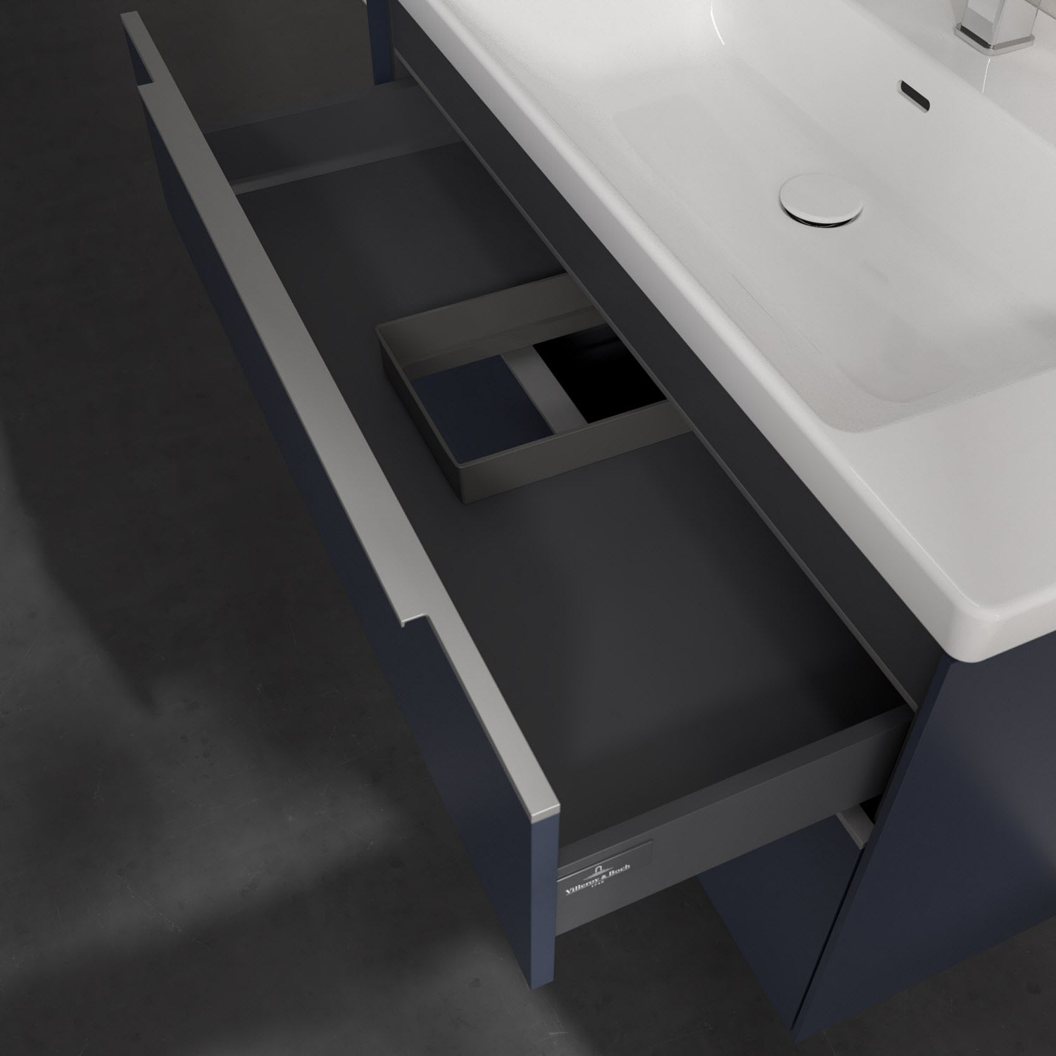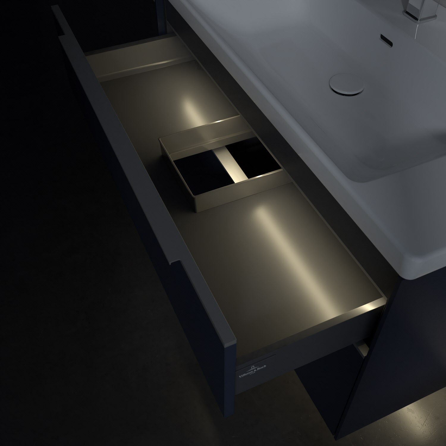 Der Waschtischunterschrank der Kollektion Subway 3.0 von Villeroy & Boch besticht durch gradliniges, zeitloses Design und großzügigen Stauraum. Front und Korpus sind mit einer hochwertigen Direktbeschichtung oder Lackierung, deren Anti-Fingerprint-Oberfläche unschönen Fingerabdrücken vorbeugt, versehen. Für eine einfache Handhabung sorgt eine dezente Griffleiste. Zwei voll ausziehbare Schubladen mit rutschhemmenden Böden, Selbsteinzug-Funktion und zwei integrierten kleinen Accessory-Boxen bieten extra viel Platz für Pflege- und Hygieneartikel. Der obere Auszug ist mit einer funktionalen LED-Leiste ausgestattet, die mit neutralweißem Licht das Innenleben beleuchtet. Highlight ist die LED-Bodenbeleuchtung, die stimmungsvolles, sanftes Licht ins Bad bringt und nachts als Orientierungshilfe dient. Helligkeit und Lichtfarbe können über den kapazitiven Sensor eingestellt werden. Die LED-Leuchten lassen sich durch einen Fachhandwerker austauschen.