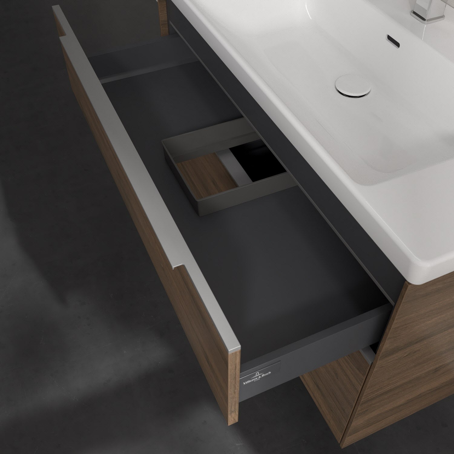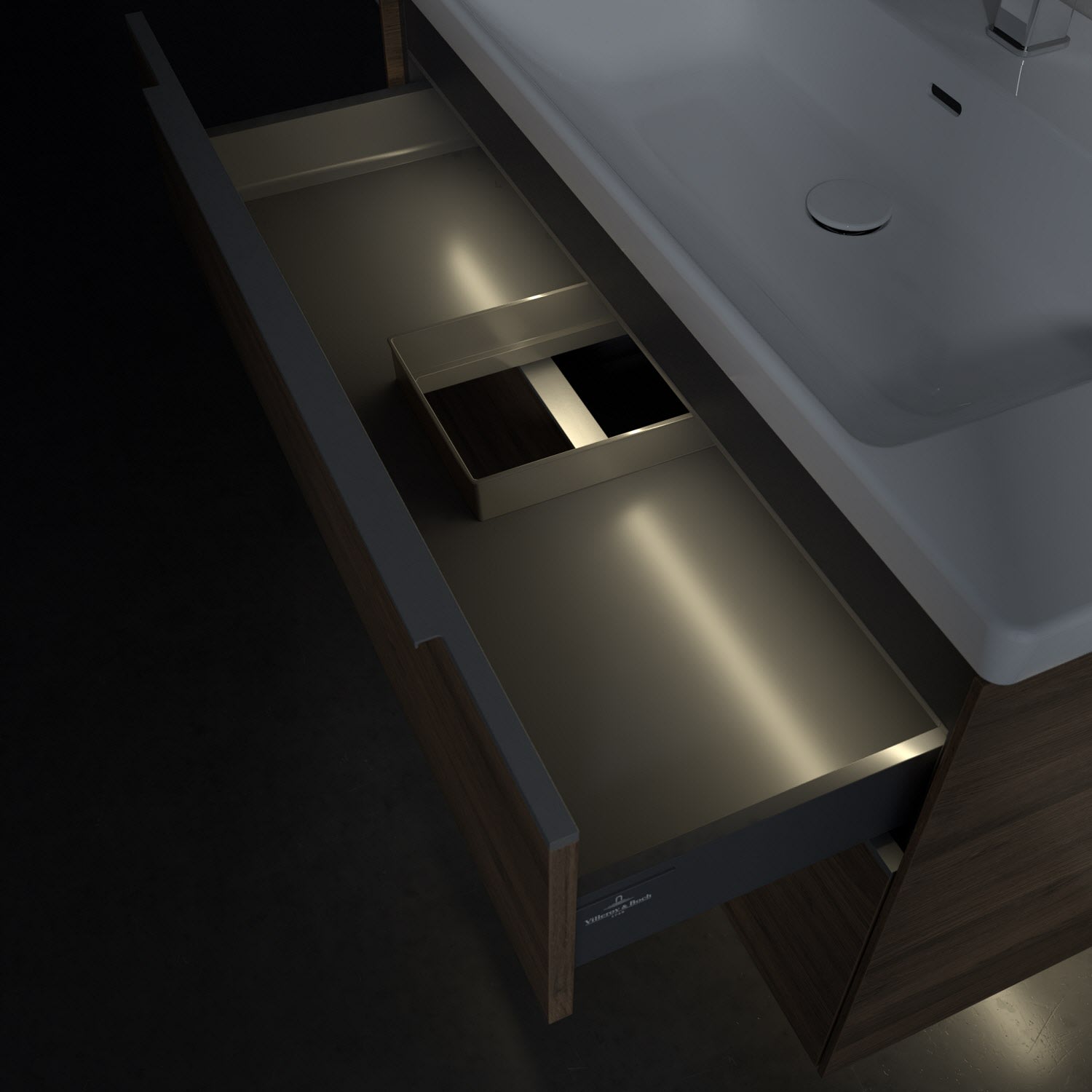 Der Waschtischunterschrank der Kollektion Subway 3.0 von Villeroy & Boch besticht durch gradliniges, zeitloses Design und großzügigen Stauraum. Front und Korpus sind mit einer hochwertigen Direktbeschichtung oder Lackierung, deren Anti-Fingerprint-Oberfläche unschönen Fingerabdrücken vorbeugt, versehen. Für eine einfache Handhabung sorgt eine dezente Griffleiste. Zwei voll ausziehbare Schubladen mit rutschhemmenden Böden, Selbsteinzug-Funktion und zwei integrierten kleinen Accessory-Boxen bieten extra viel Platz für Pflege- und Hygieneartikel. Der obere Auszug ist mit einer funktionalen LED-Leiste ausgestattet, die mit neutralweißem Licht das Innenleben beleuchtet. Highlight ist die LED-Bodenbeleuchtung, die stimmungsvolles, sanftes Licht ins Bad bringt und nachts als Orientierungshilfe dient. Helligkeit und Lichtfarbe können über den kapazitiven Sensor eingestellt werden. Die LED-Leuchten lassen sich durch einen Fachhandwerker austauschen.