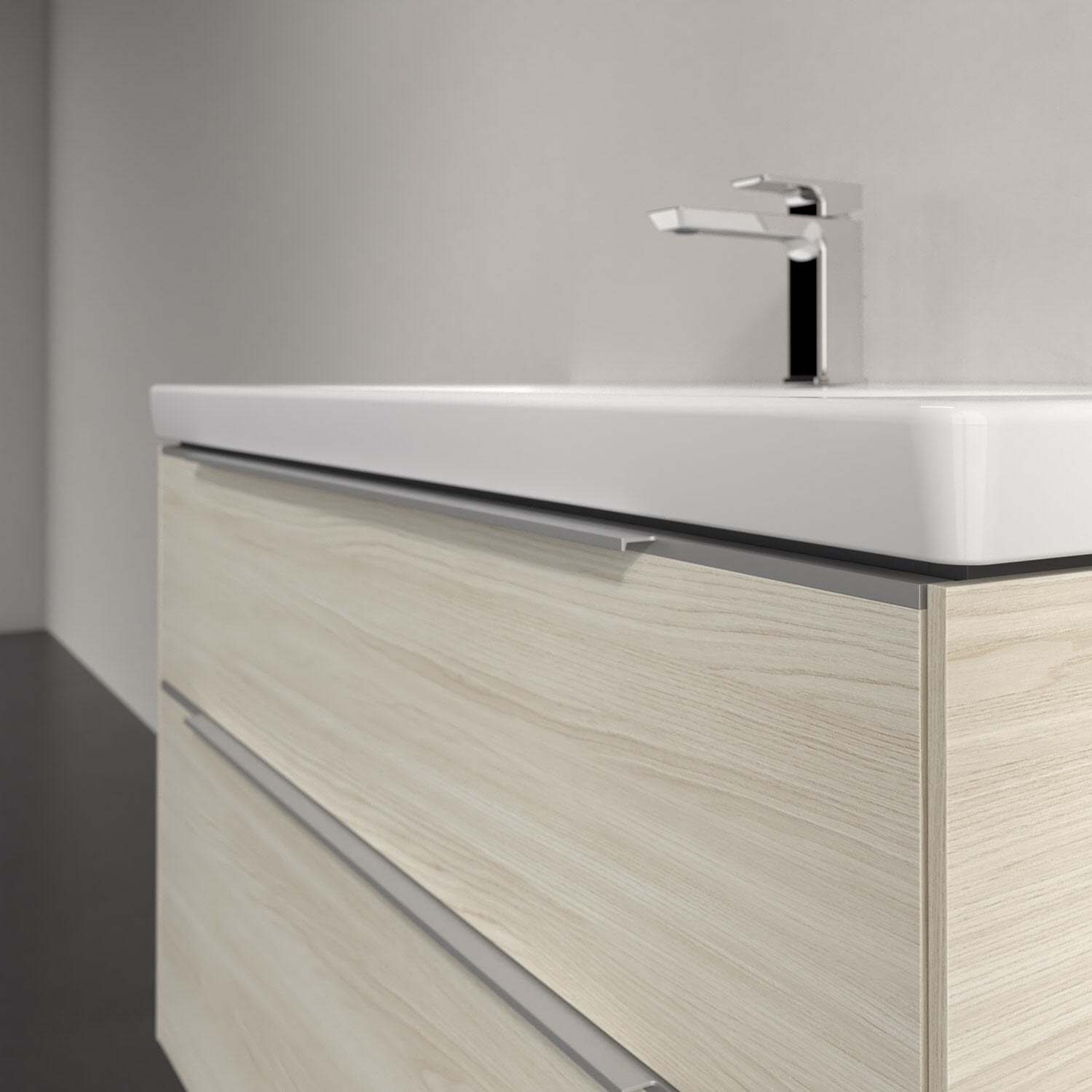 Der Waschtischunterschrank der Kollektion Subway 3.0 von Villeroy & Boch besticht durch gradliniges, zeitloses Design und großzügigen Stauraum. Front und Korpus sind mit einer hochwertigen Direktbeschichtung oder Lackierung, deren Anti-Fingerprint-Oberfläche unschönen Fingerabdrücken vorbeugt, versehen. Für eine einfache Handhabung sorgt eine dezente Griffleiste. Zwei voll ausziehbare Schubladen mit rutschhemmenden Böden, Selbsteinzug-Funktion und zwei integrierten kleinen Accessory-Boxen bieten extra viel Platz für Pflege- und Hygieneartikel. Der obere Auszug ist mit einer funktionalen LED-Leiste ausgestattet, die mit neutralweißem Licht das Innenleben beleuchtet. Highlight ist die LED-Bodenbeleuchtung, die stimmungsvolles, sanftes Licht ins Bad bringt und nachts als Orientierungshilfe dient. Helligkeit und Lichtfarbe können über den kapazitiven Sensor eingestellt werden. Die LED-Leuchten lassen sich durch einen Fachhandwerker austauschen.