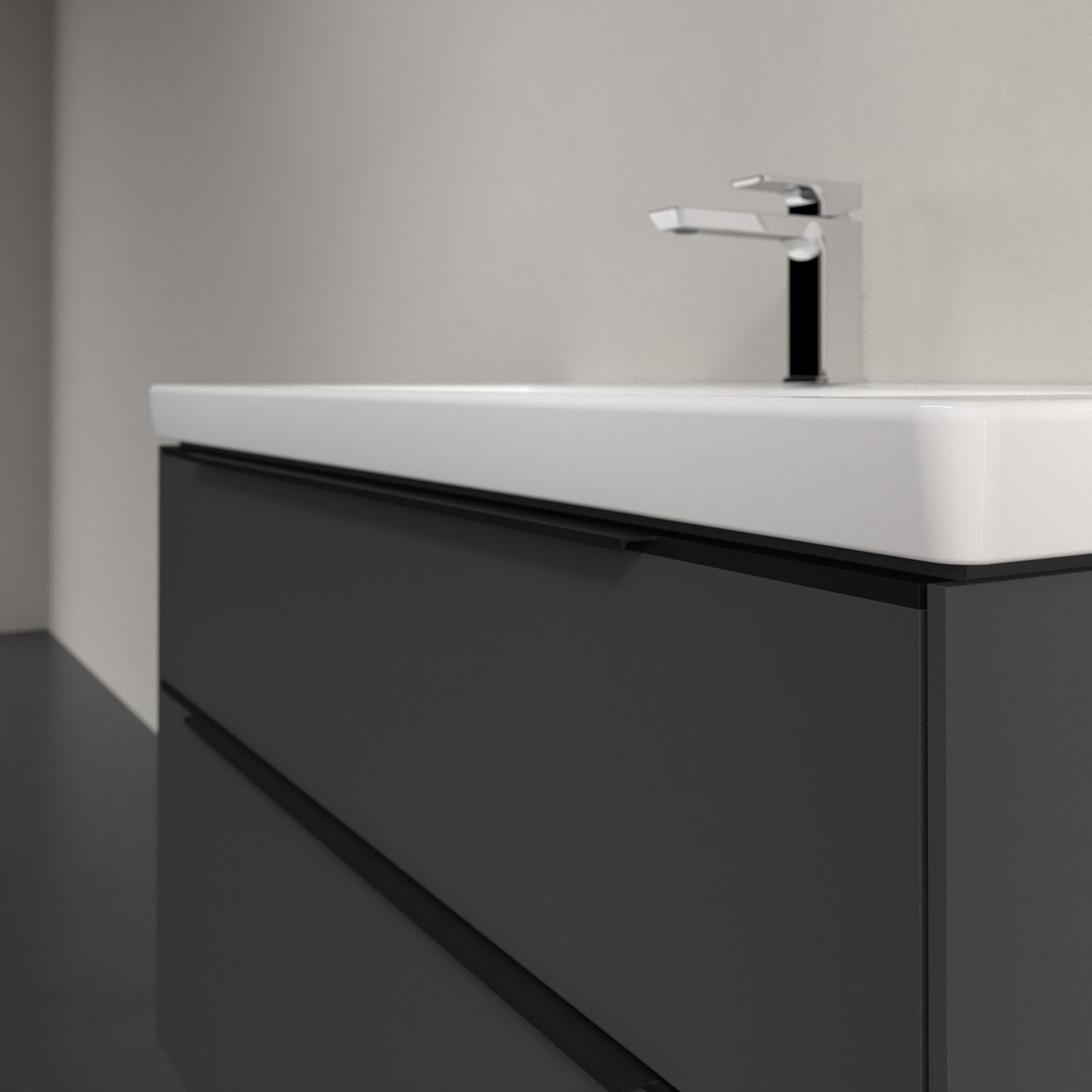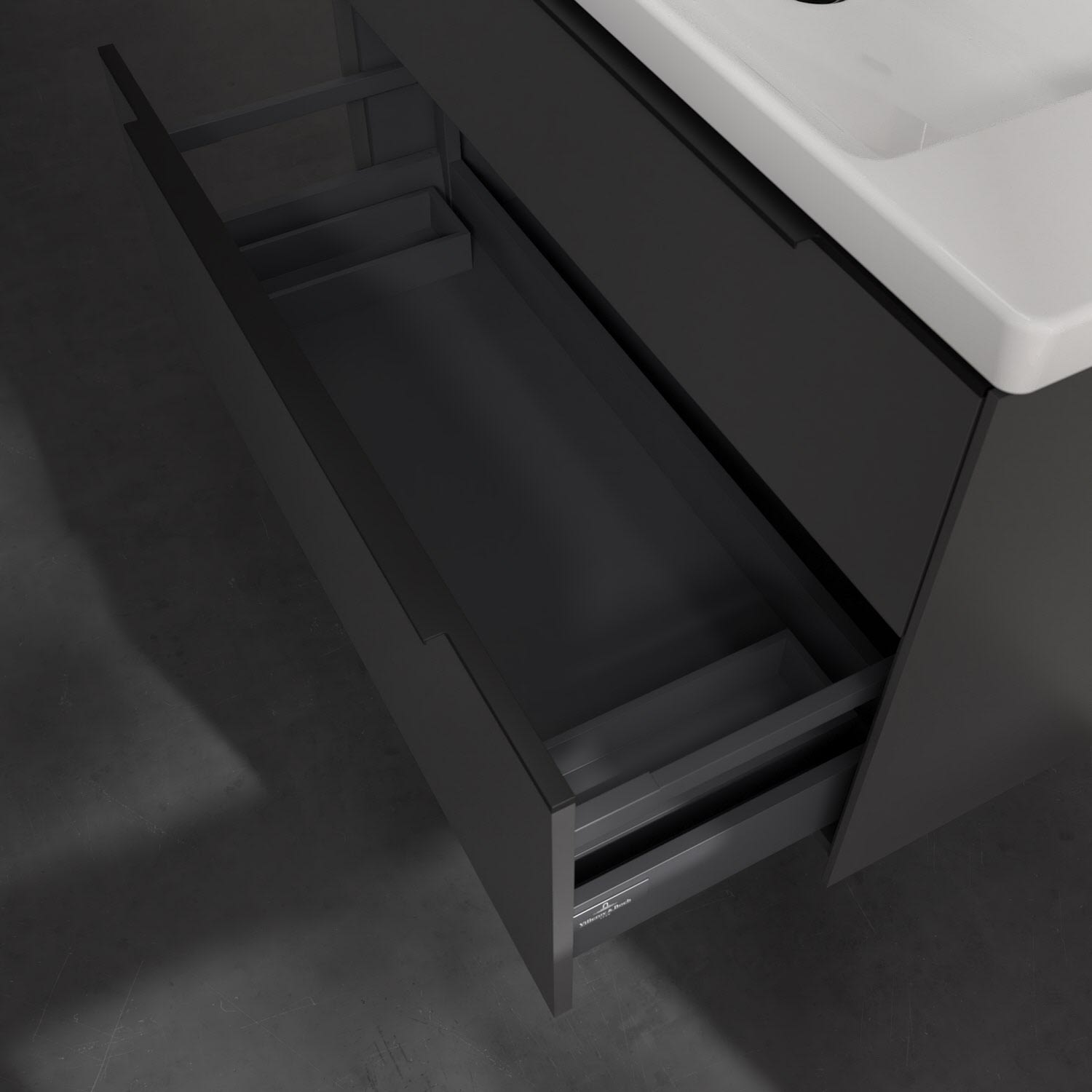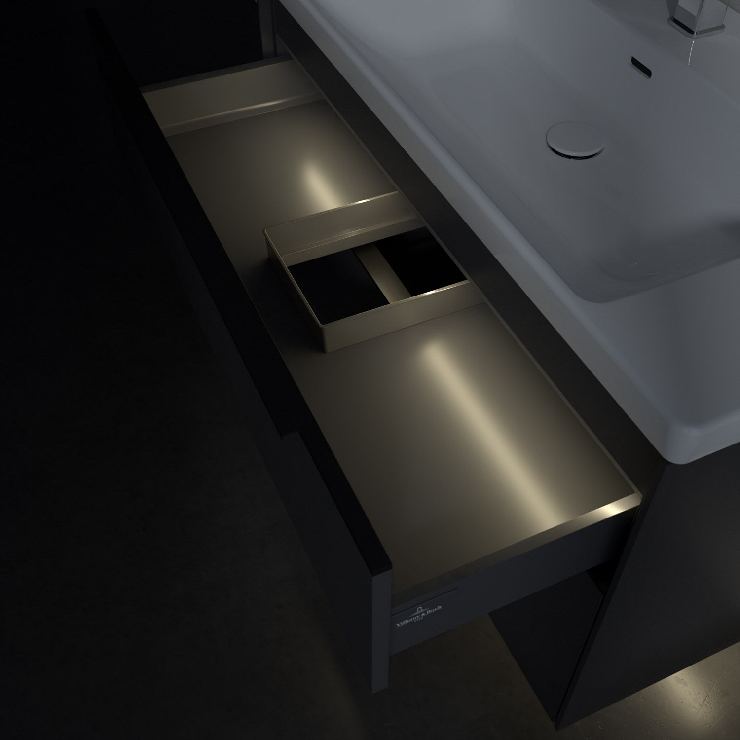 Der Waschtischunterschrank der Kollektion Subway 3.0 von Villeroy & Boch besticht durch gradliniges, zeitloses Design und großzügigen Stauraum. Front und Korpus sind mit einer hochwertigen Direktbeschichtung oder Lackierung, deren Anti-Fingerprint-Oberfläche unschönen Fingerabdrücken vorbeugt, versehen. Für eine einfache Handhabung sorgt eine dezente Griffleiste. Zwei voll ausziehbare Schubladen mit rutschhemmenden Böden, Selbsteinzug-Funktion und zwei integrierten kleinen Accessory-Boxen bieten extra viel Platz für Pflege- und Hygieneartikel. Der obere Auszug ist mit einer funktionalen LED-Leiste ausgestattet, die mit neutralweißem Licht das Innenleben beleuchtet. Highlight ist die LED-Bodenbeleuchtung, die stimmungsvolles, sanftes Licht ins Bad bringt und nachts als Orientierungshilfe dient. Helligkeit und Lichtfarbe können über den kapazitiven Sensor eingestellt werden. Die LED-Leuchten lassen sich durch einen Fachhandwerker austauschen.