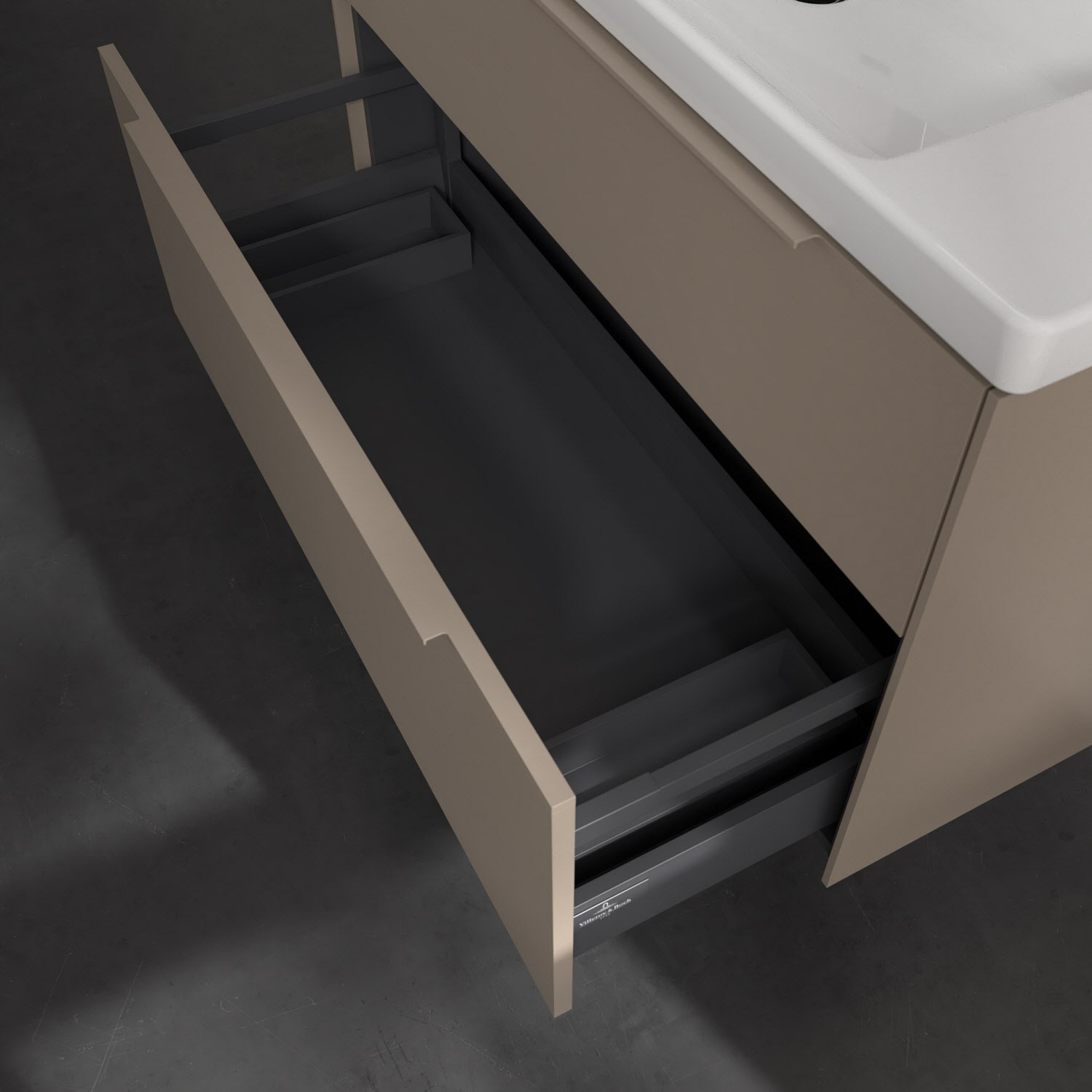 Der Waschtischunterschrank der Kollektion Subway 3.0 von Villeroy & Boch besticht durch gradliniges, zeitloses Design und großzügigen Stauraum. Front und Korpus sind mit einer hochwertigen Direktbeschichtung oder Lackierung, deren Anti-Fingerprint-Oberfläche unschönen Fingerabdrücken vorbeugt, versehen. Für eine einfache Handhabung sorgt eine dezente Griffleiste. Zwei voll ausziehbare Schubladen mit rutschhemmenden Böden, Selbsteinzug-Funktion und zwei integrierten kleinen Accessory-Boxen bieten extra viel Platz für Pflege- und Hygieneartikel. Der obere Auszug ist mit einer funktionalen LED-Leiste ausgestattet, die mit neutralweißem Licht das Innenleben beleuchtet. Highlight ist die LED-Bodenbeleuchtung, die stimmungsvolles, sanftes Licht ins Bad bringt und nachts als Orientierungshilfe dient. Helligkeit und Lichtfarbe können über den kapazitiven Sensor eingestellt werden. Die LED-Leuchten lassen sich durch einen Fachhandwerker austauschen.